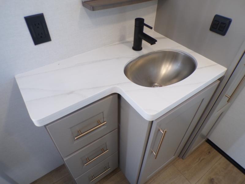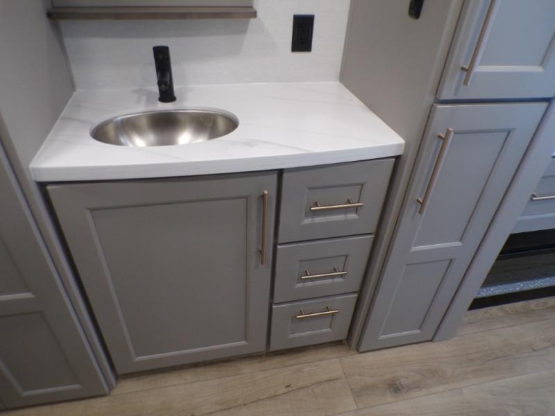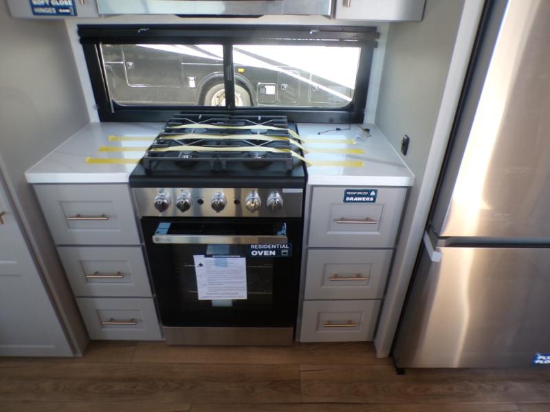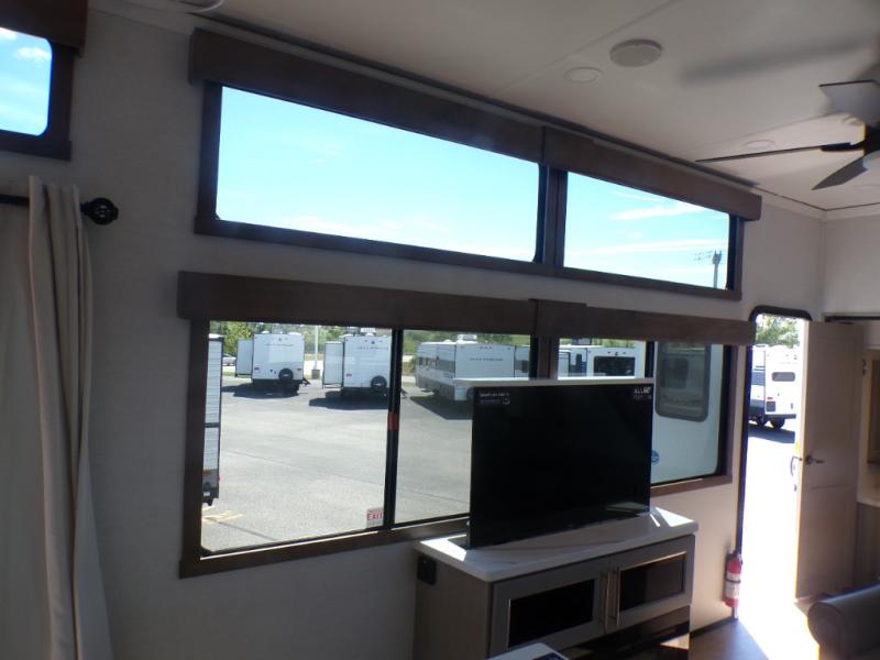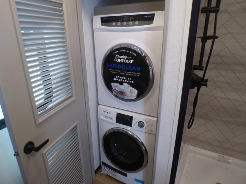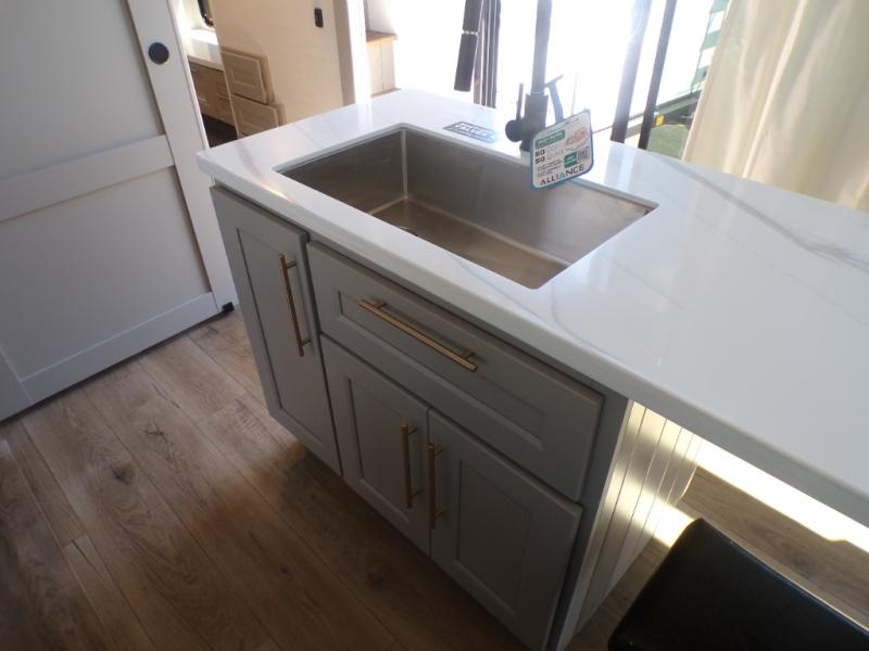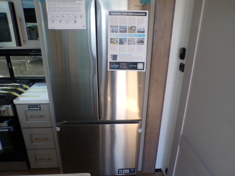 With any Benchmark destination trailer by Alliance RV, you will enjoy luxury features at every turn! The high gloss fiberglass exterior is ultra sleek, and the Azdel composite fiberglass sidewalls add durability so you can camp for years to come. You'll also find a residential exterior garden hose connection outside, along with a powder coated aluminum rear ladder, and an auxiliary LP tank hook up if you want to bring your grill along. Head inside to find hardwood cabinetry, solid surface countertops throughout, oversized windows in all rooms, and MCD roller shades throughout. The 45,000 BTU A/C and 60,000 BTU furnace will keep you comfortable year around, and there is a stackable washer and dryer to make full-time RV living easier than ever!