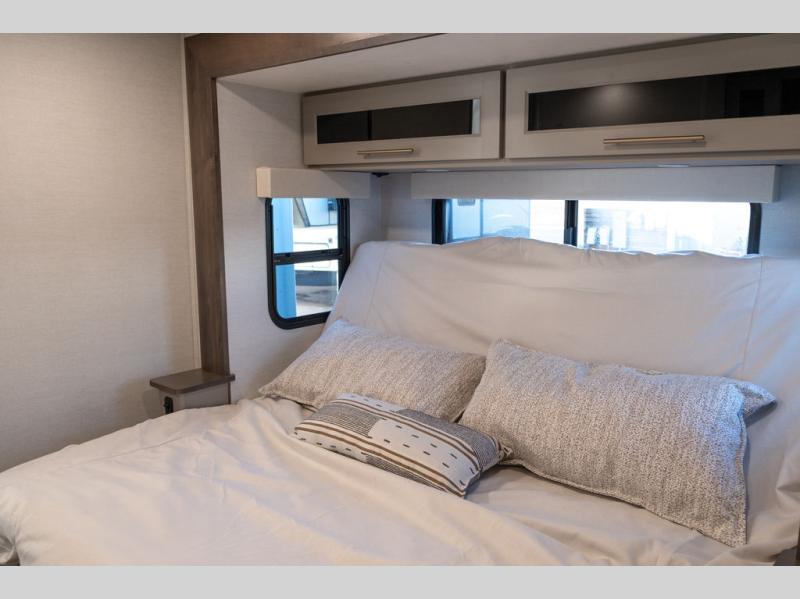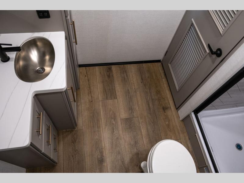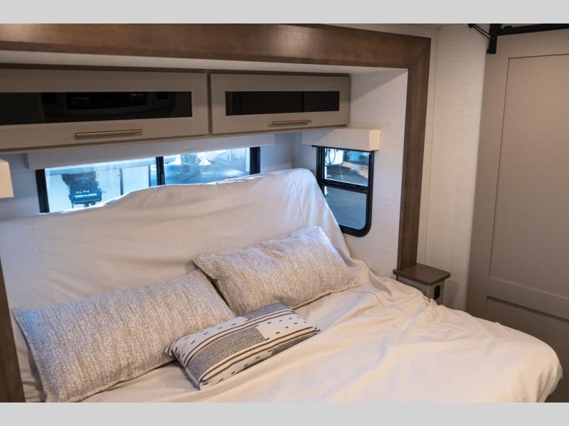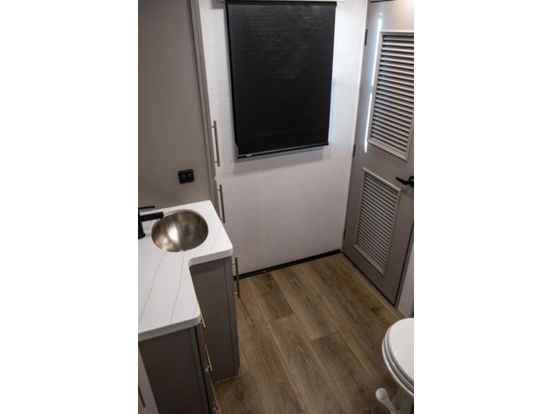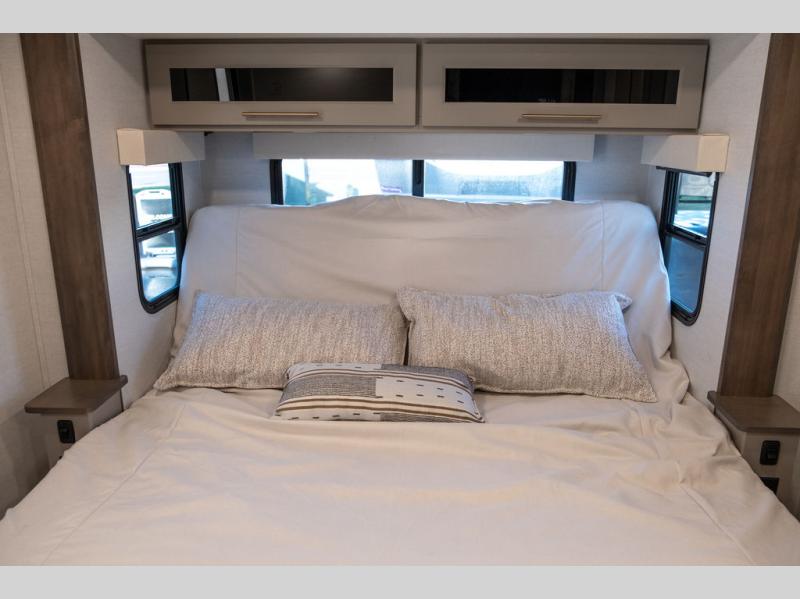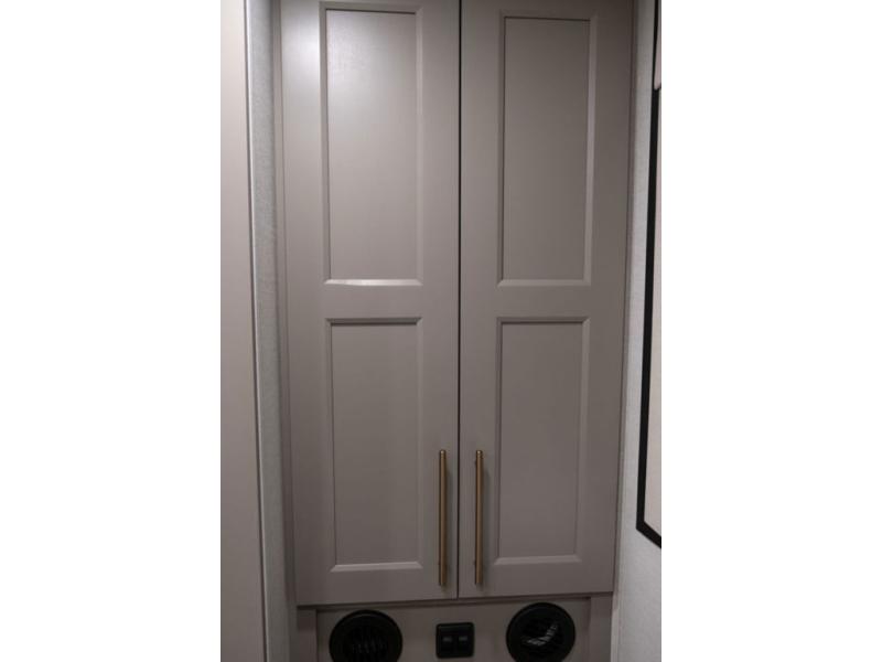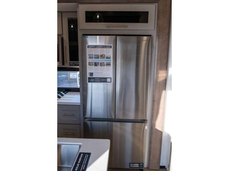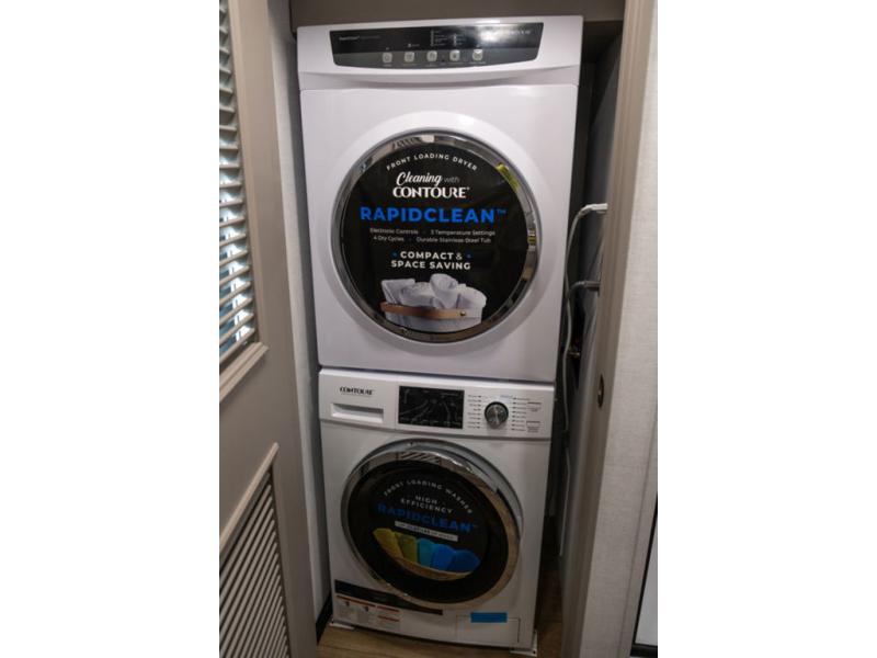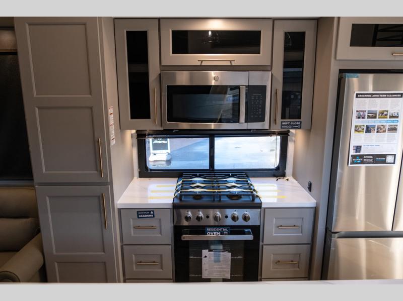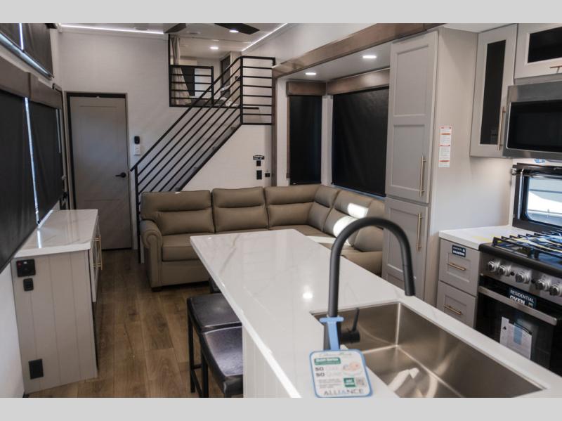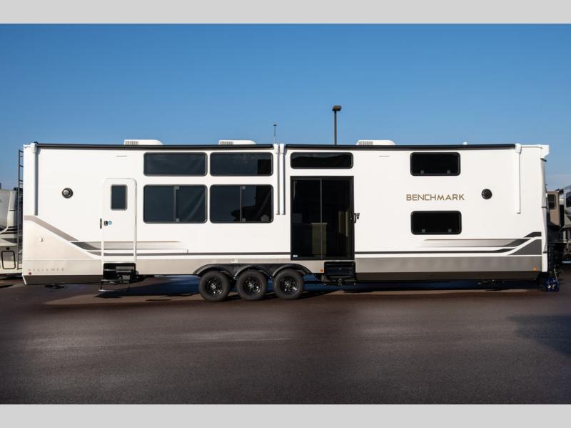 With any Benchmark destination trailer by Alliance RV, you will enjoy luxury features at every turn! The high gloss fiberglass exterior is ultra sleek, and the Azdel composite fiberglass sidewalls add durability so you can camp for years to come. You'll also find a residential exterior garden hose connection outside, along with a powder coated aluminum rear ladder, and an auxiliary LP tank hook up if you want to bring your grill along. Head inside to find hardwood cabinetry, solid surface countertops throughout, oversized windows in all rooms, and MCD roller shades throughout. The 45,000 BTU A/C and 60,000 BTU furnace will keep you comfortable year around, and there is a stackable washer and dryer to make full-time RV living easier than ever!