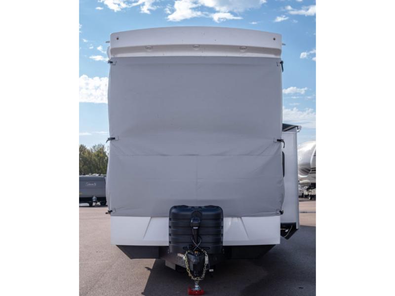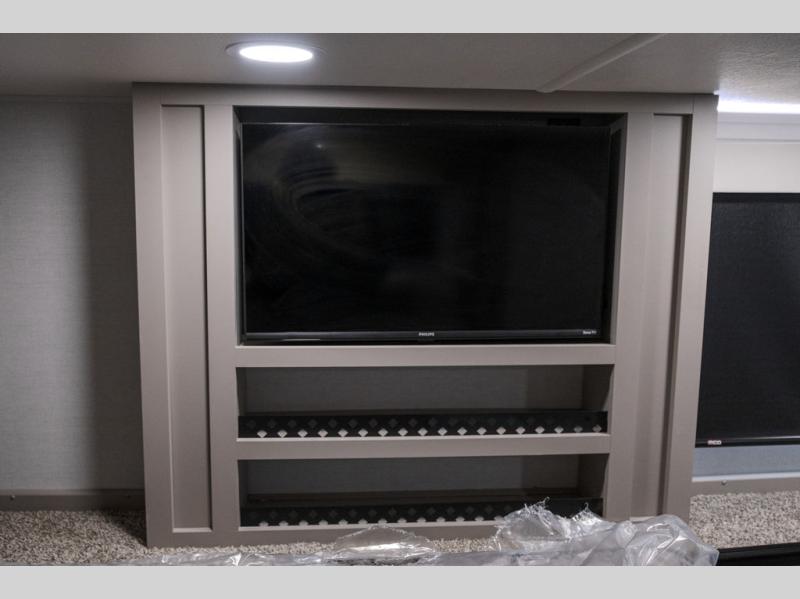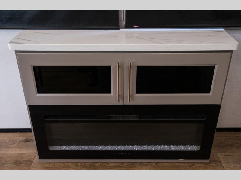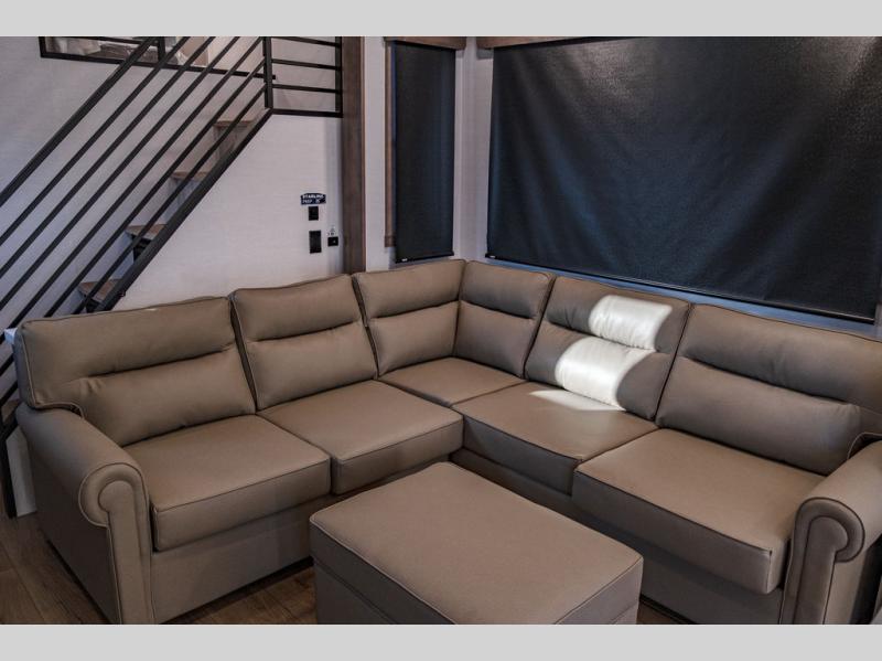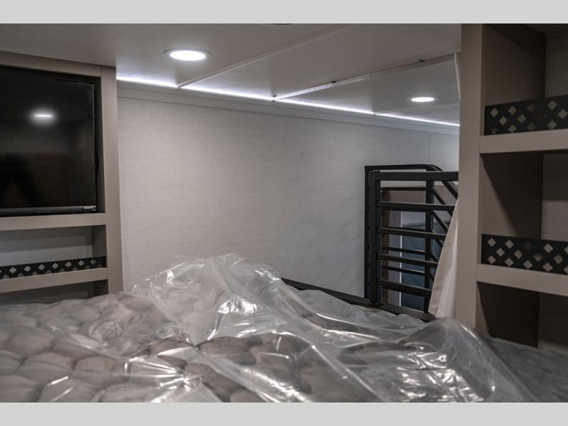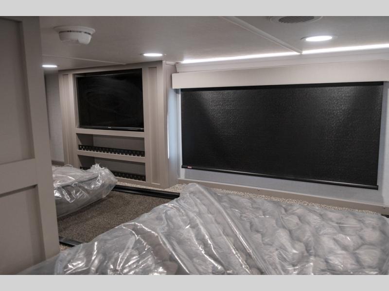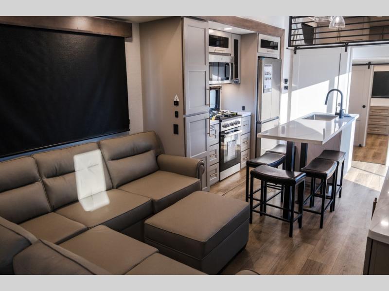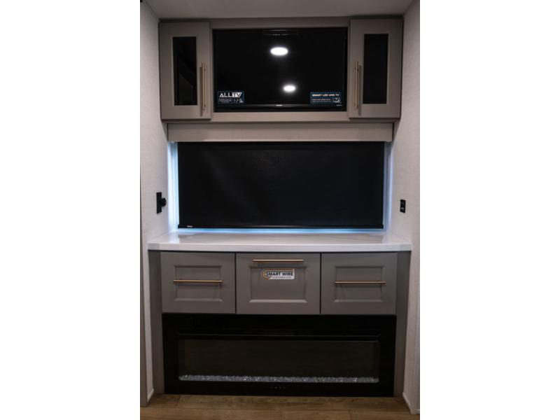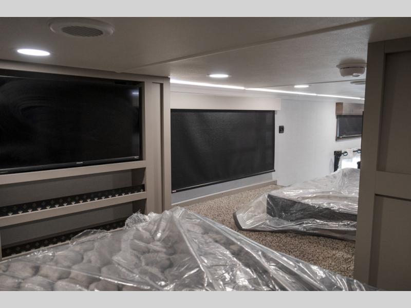 This destination trailer is perfect for a big crowd since it has one Power Tilting king bed, three mattress and an L- shape sofa. Experience the in-home feeling with the amazing kitchen and living room, furnished with a Kitchen island, L- shape sofa and a residential 110 V fridge. Also, you can sense the extreme coziness thanks to the dual fire places and get 24/7 entertainment due to the four TVs along the trailer. Plenty of place can be found in the front and rear loft bedrooms with three wardrobes in total. Lastly the two full bathrooms will allow you to comfortably take a shower after a long day.