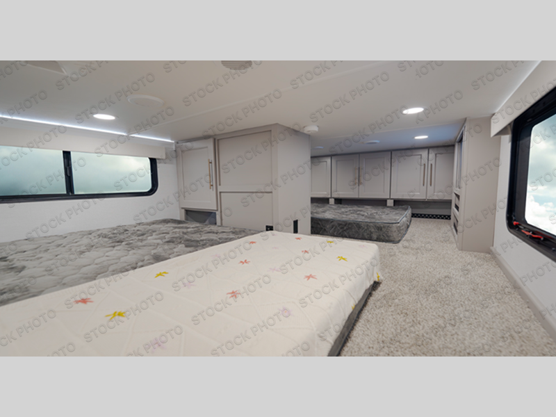 This destination trailer is perfect for a big crowd since it has one Power Tilting king bed, three mattress and an L- shape sofa. Experience the in-home feeling with the amazing kitchen and living room, furnished with a Kitchen island, L- shape sofa and a residential 110 V fridge. Also, you can sense the extreme coziness thanks to the dual fire places and get 24/7 entertainment due to the four TVs along the trailer. Plenty of place can be found in the front and rear loft bedrooms with three wardrobes in total. Lastly the two full bathrooms will allow you to comfortably take a shower after a long day.