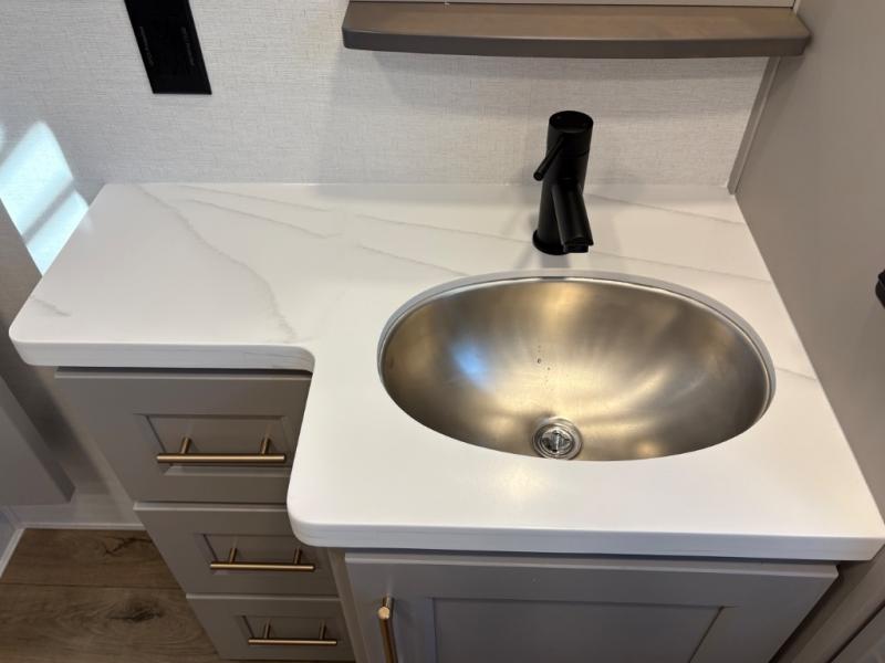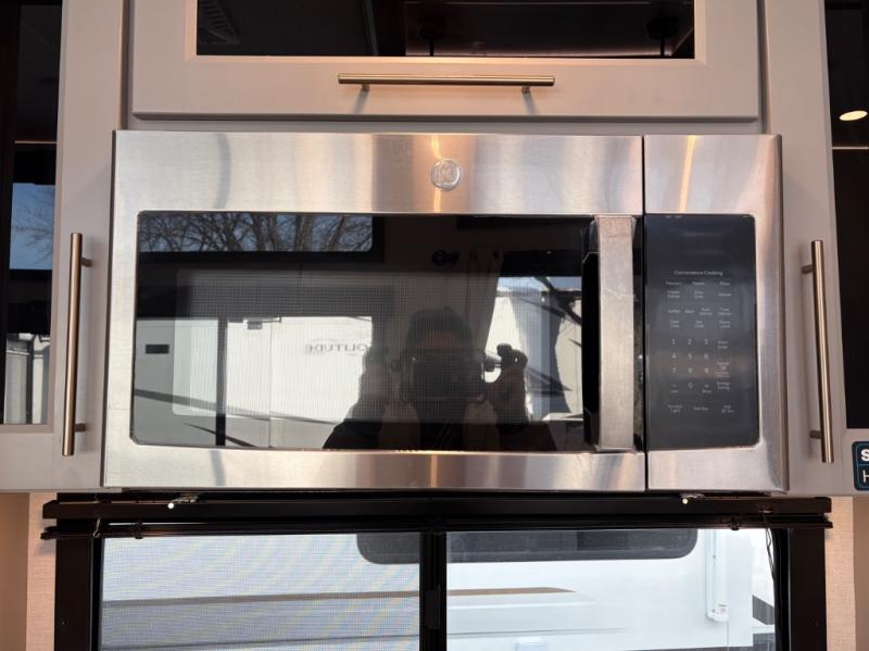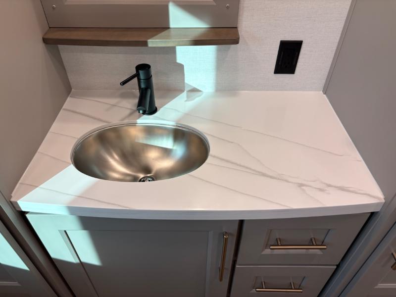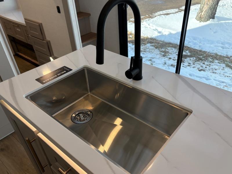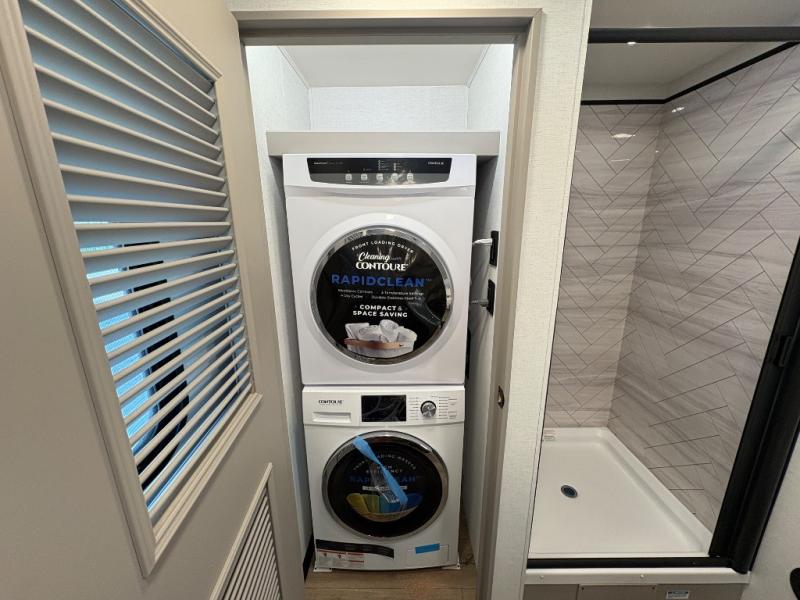 With any Benchmark destination trailer by Alliance RV, you will enjoy luxury features at every turn! The high gloss fiberglass exterior is ultra sleek, and the Azdel composite fiberglass sidewalls add durability so you can camp for years to come. You'll also find a residential exterior garden hose connection outside, along with a powder coated aluminum rear ladder, and an auxiliary LP tank hook up if you want to bring your grill along. Head inside to find hardwood cabinetry, solid surface countertops throughout, oversized windows in all rooms, and MCD roller shades throughout. The 45,000 BTU A/C and 60,000 BTU furnace will keep you comfortable year around, and there is a stackable washer and dryer to make full-time RV living easier than ever!