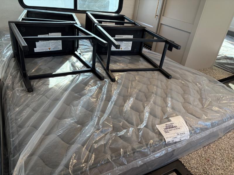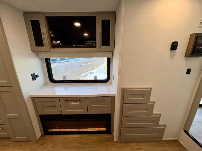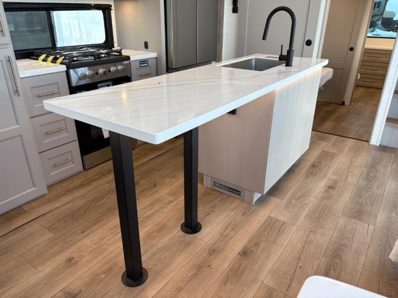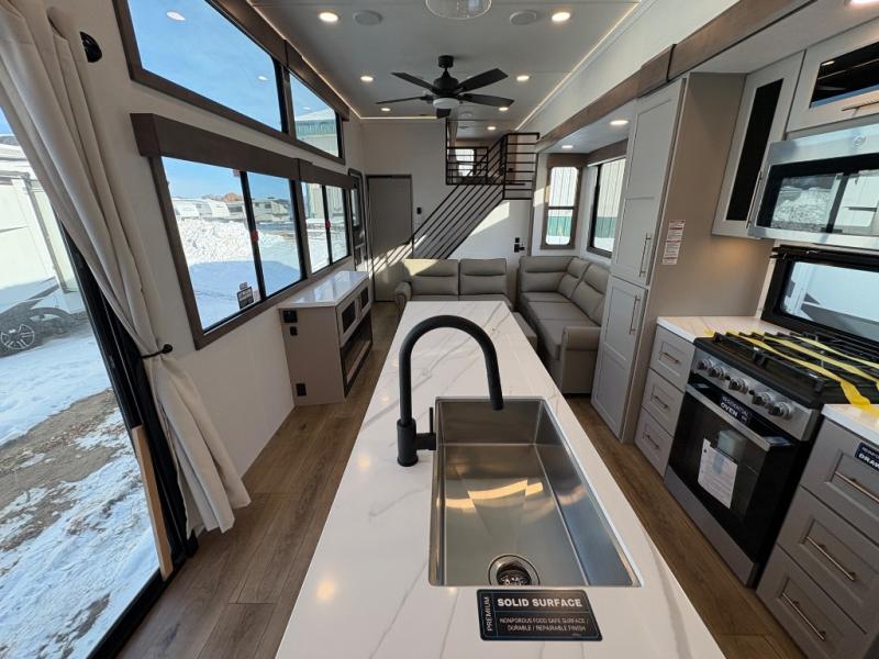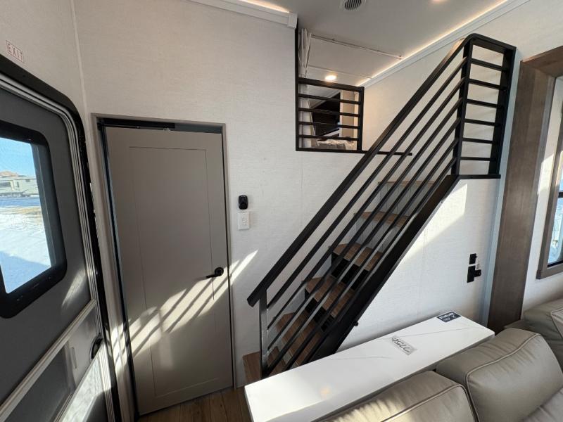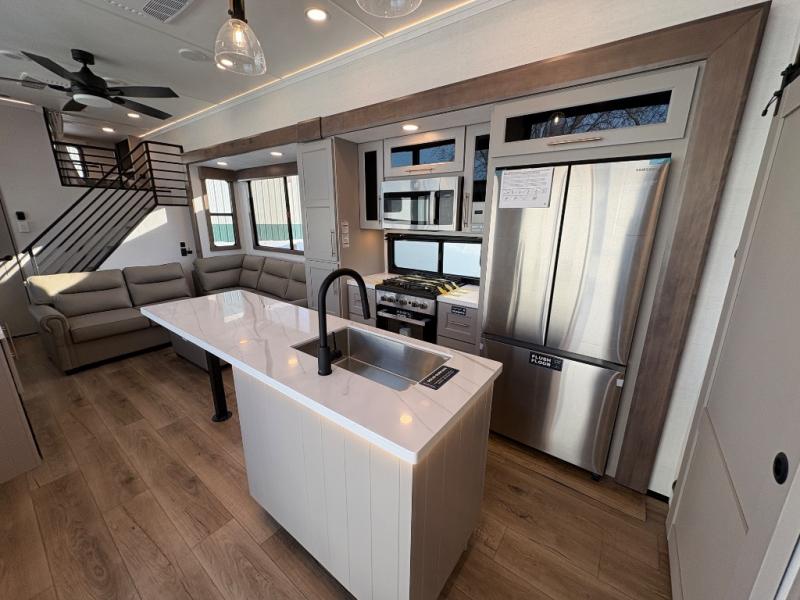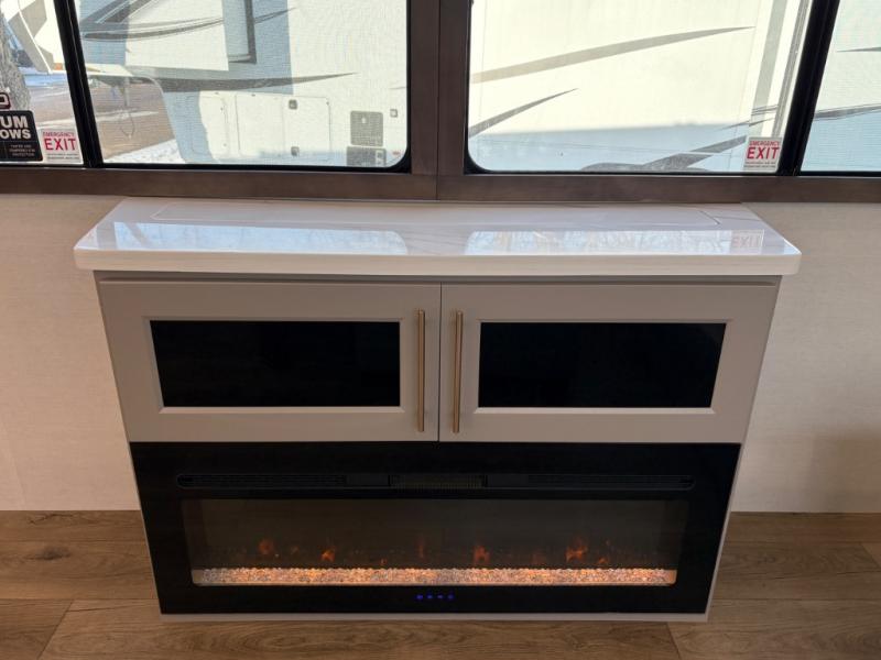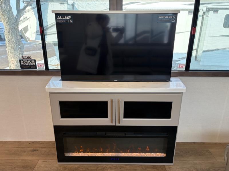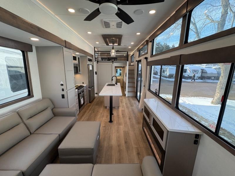 This destination trailer is perfect for a big crowd since it has one Power Tilting king bed, three mattress and an L- shape sofa. Experience the in-home feeling with the amazing kitchen and living room, furnished with a Kitchen island, L- shape sofa and a residential 110 V fridge. Also, you can sense the extreme coziness thanks to the dual fire places and get 24/7 entertainment due to the four TVs along the trailer. Plenty of place can be found in the front and rear loft bedrooms with three wardrobes in total. Lastly the two full bathrooms will allow you to comfortably take a shower after a long day.