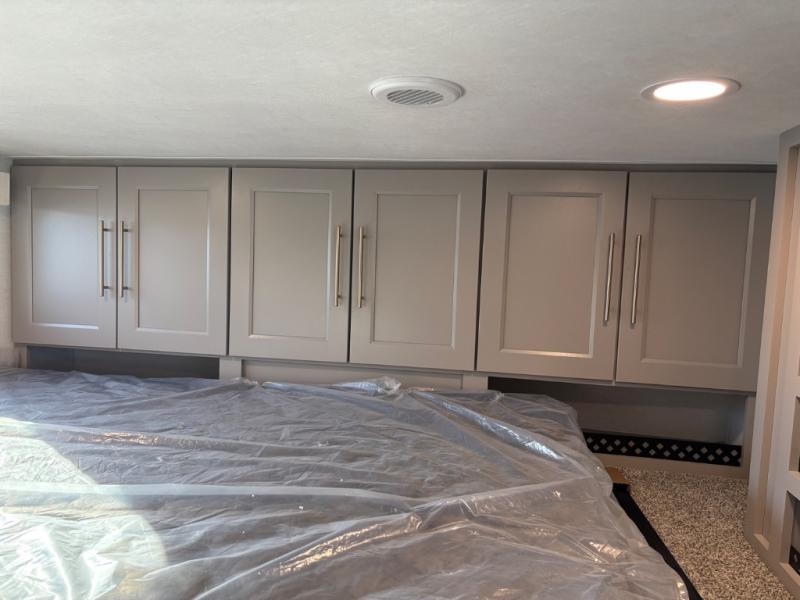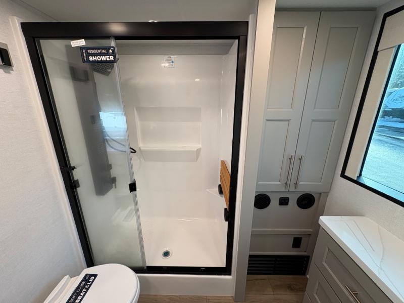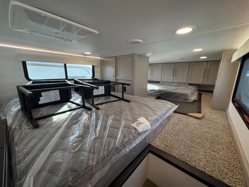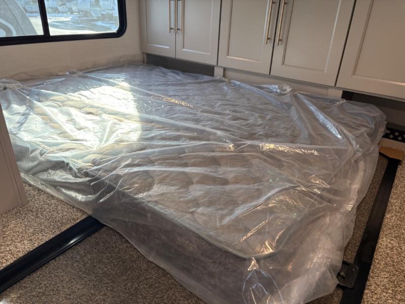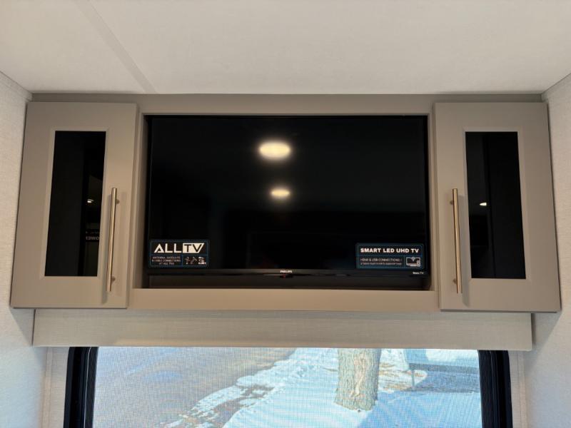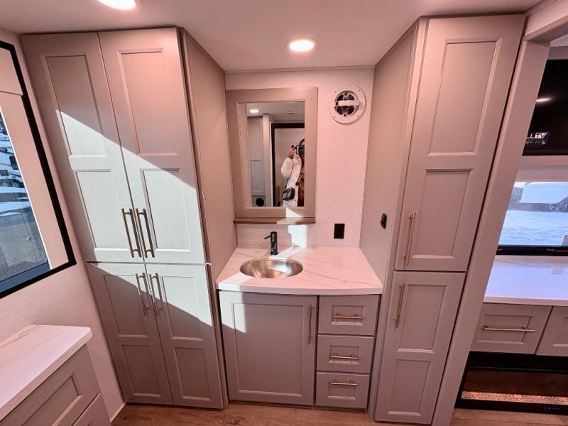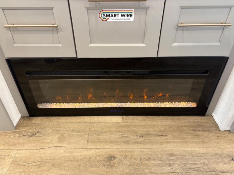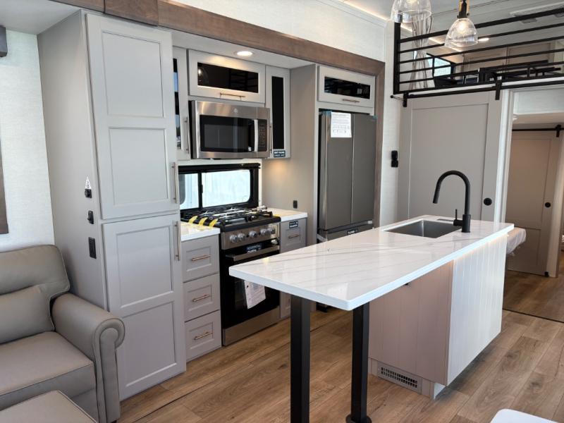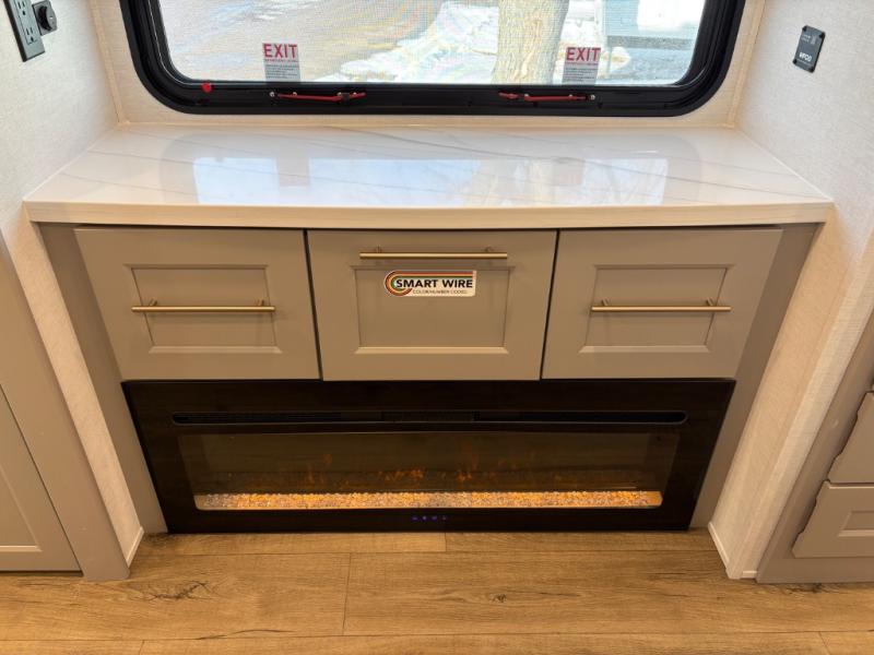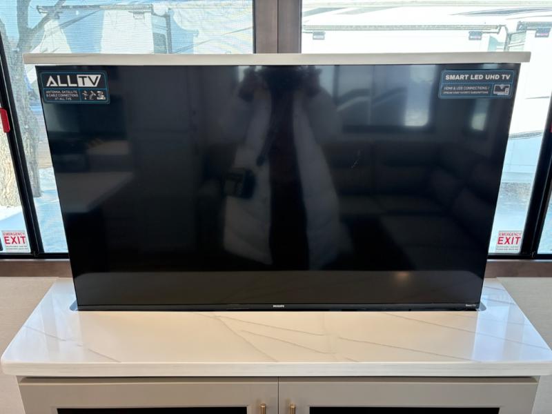 This destination trailer is perfect for a big crowd since it has one Power Tilting king bed, three mattress and an L- shape sofa. Experience the in-home feeling with the amazing kitchen and living room, furnished with a Kitchen island, L- shape sofa and a residential 110 V fridge. Also, you can sense the extreme coziness thanks to the dual fire places and get 24/7 entertainment due to the four TVs along the trailer. Plenty of place can be found in the front and rear loft bedrooms with three wardrobes in total. Lastly the two full bathrooms will allow you to comfortably take a shower after a long day.
