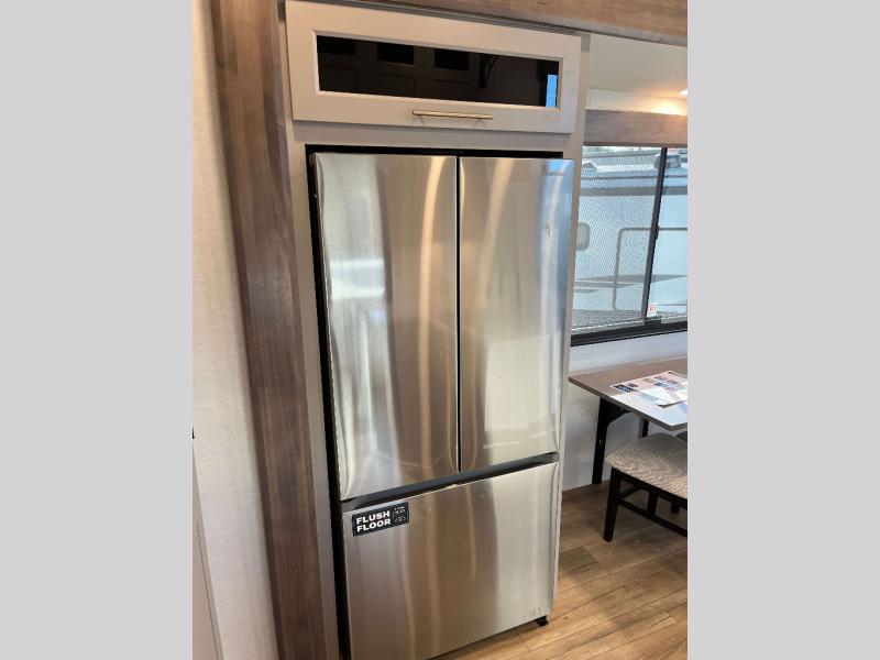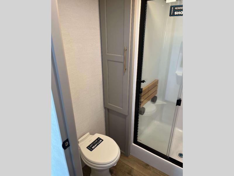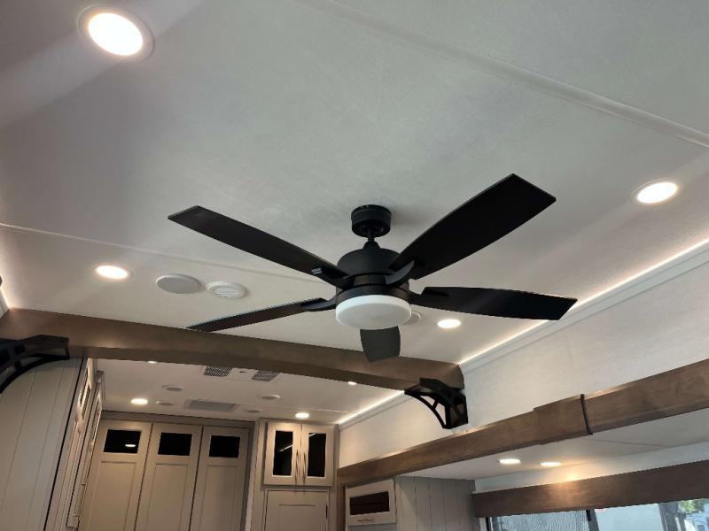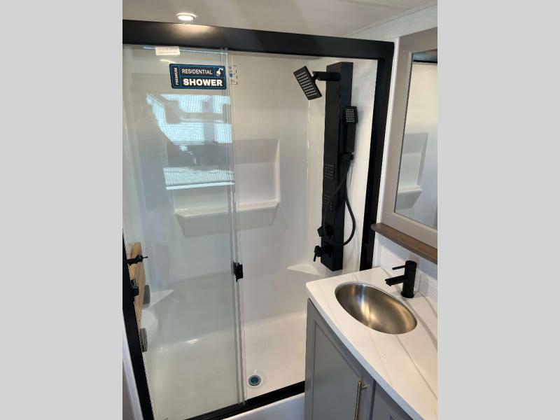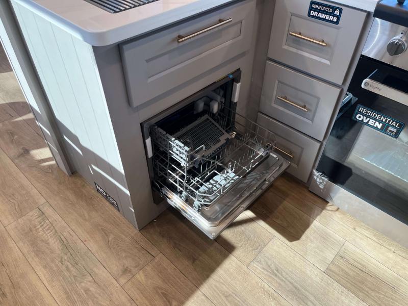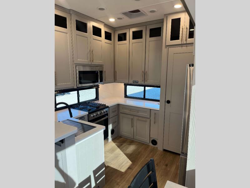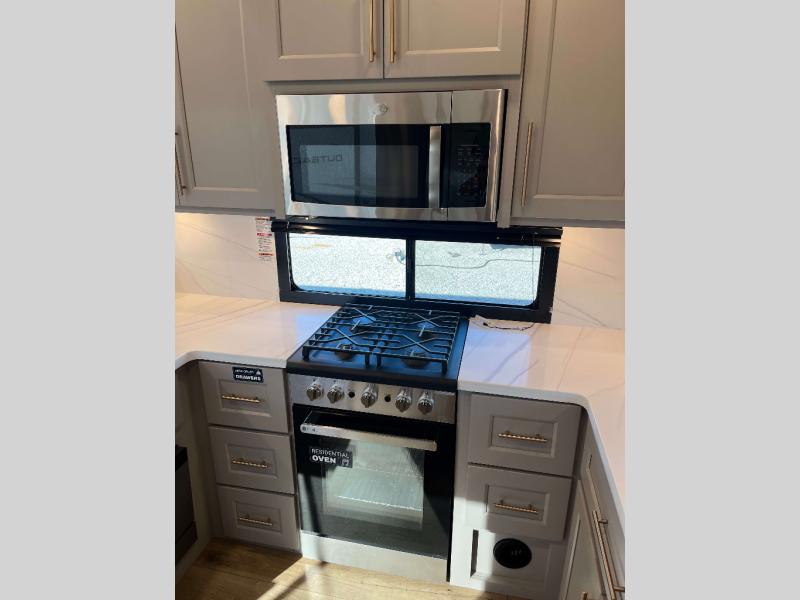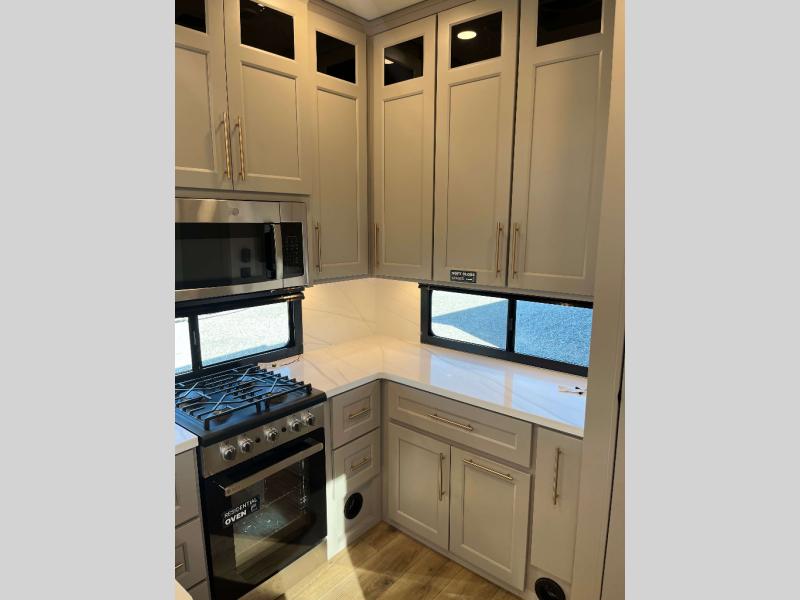 - 4 Burner Freestanding Residential Range, 110 Volt Residential Refrigerator, Residential Microwave Oven, Walkable Roof w/ Seamless PVC Covering, Mylar Reinforced Exterior Seals, Flush Floor Kitchen Slide, Large Residential Fiberglass Shower, Commercial Grade Vinyl Flooring on main level (No Carpet), Soft Close Cabinet Doors w/ Magnetic Catch, Hidden Hinges, Soft Close Toilet, Light Dimming Switches, Hardwood Fascia and Window Treatments, Residential LED Recessed Ceiling Lights, LED Back-Lit Crown Molding in Living Area, Hardwood Cabinet Doors and Drawers, Gold Cabinetry Hardware, No In-Floor Heat Vents