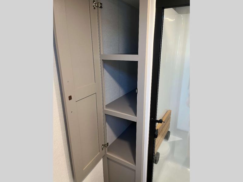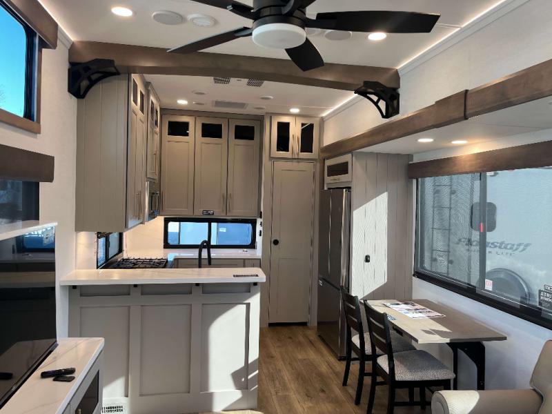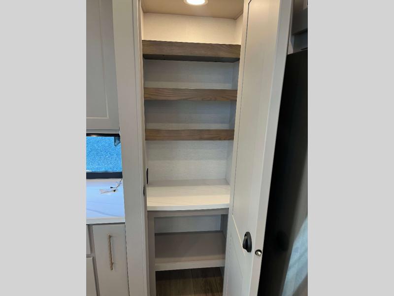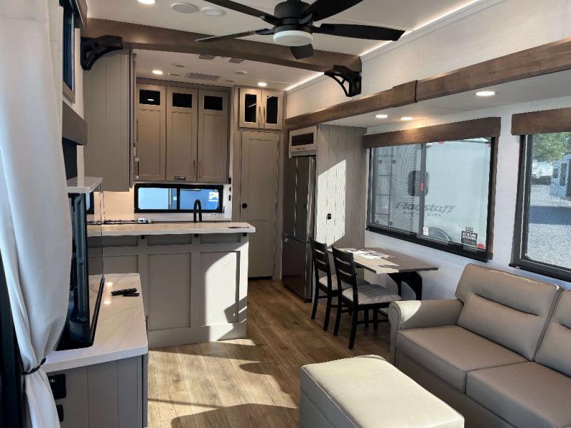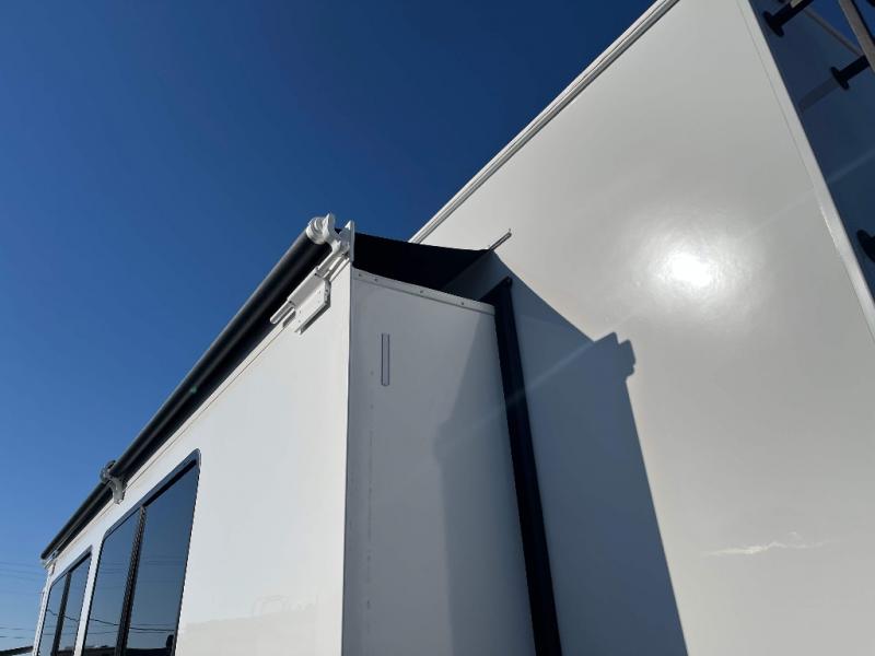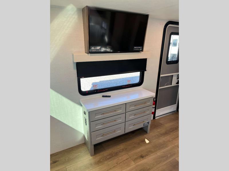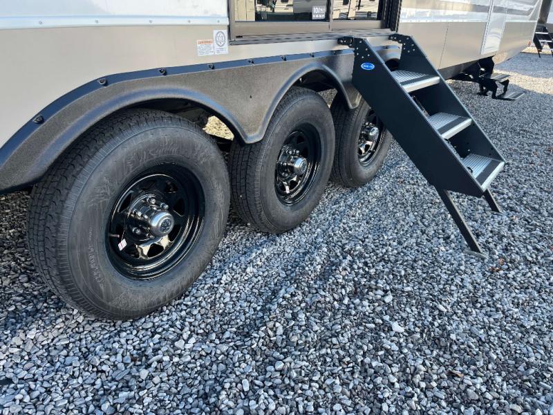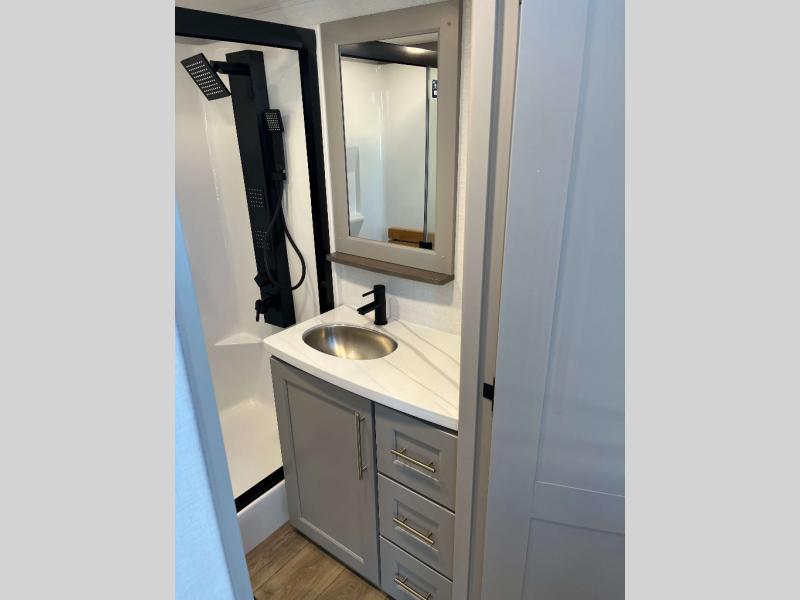 - 4 Burner Freestanding Residential Range, 110 Volt Residential Refrigerator, Residential Microwave Oven, Walkable Roof w/ Seamless PVC Covering, Mylar Reinforced Exterior Seals, Flush Floor Kitchen Slide, Large Residential Fiberglass Shower, Commercial Grade Vinyl Flooring on main level (No Carpet), Soft Close Cabinet Doors w/ Magnetic Catch, Hidden Hinges, Soft Close Toilet, Light Dimming Switches, Hardwood Fascia and Window Treatments, Residential LED Recessed Ceiling Lights, LED Back-Lit Crown Molding in Living Area, Hardwood Cabinet Doors and Drawers, Gold Cabinetry Hardware, No In-Floor Heat Vents