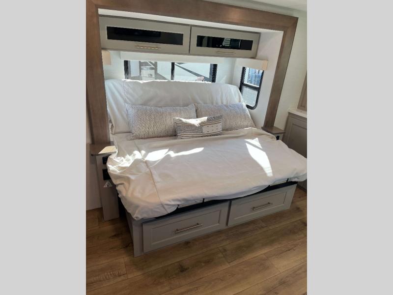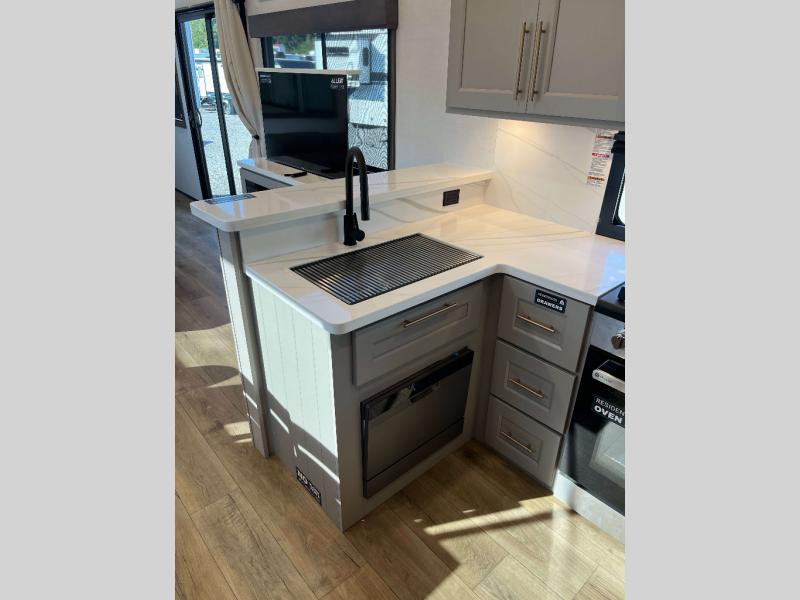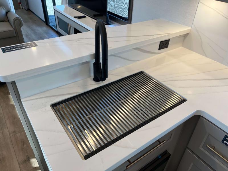 - Azdel Composite Fiberglass Sidewalls, Phillips Smart HDTV Throughout, MCD Roller Shades Throughout, Day/Night Shades - Main Deck, Solid Surface Countertops Throughout, JBL Bluetooth Stereo, Slide Out Awning Toppers, Stackable Washer and Dryer, Residential Exterior Garden Hose Connection, Powder Coated Heavy Duty Rear Ladder, Oversized Atrium Windows, Auxiliary LP Tank Port