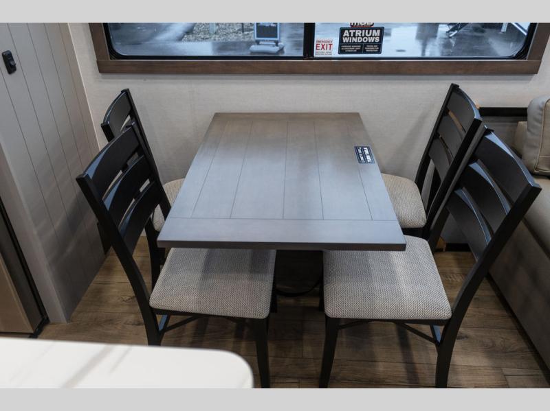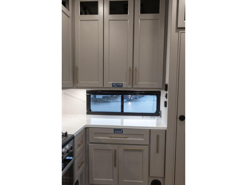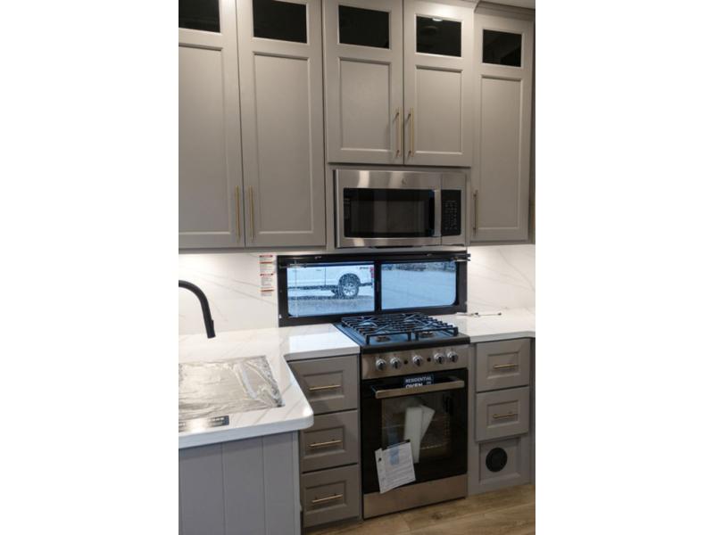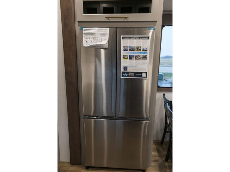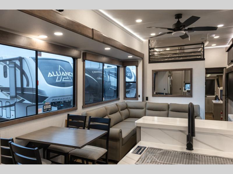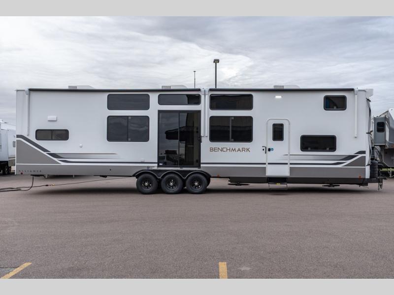 With any Benchmark destination trailer by Alliance RV, you will enjoy luxury features at every turn! The high gloss fiberglass exterior is ultra sleek, and the Azdel composite fiberglass sidewalls add durability so you can camp for years to come. You'll also find a residential exterior garden hose connection outside, along with a powder coated aluminum rear ladder, and an auxiliary LP tank hook up if you want to bring your grill along. Head inside to find hardwood cabinetry, solid surface countertops throughout, oversized windows in all rooms, and MCD roller shades throughout. The 45,000 BTU A/C and 60,000 BTU furnace will keep you comfortable year around, and there is a stackable washer and dryer to make full-time RV living easier than ever!