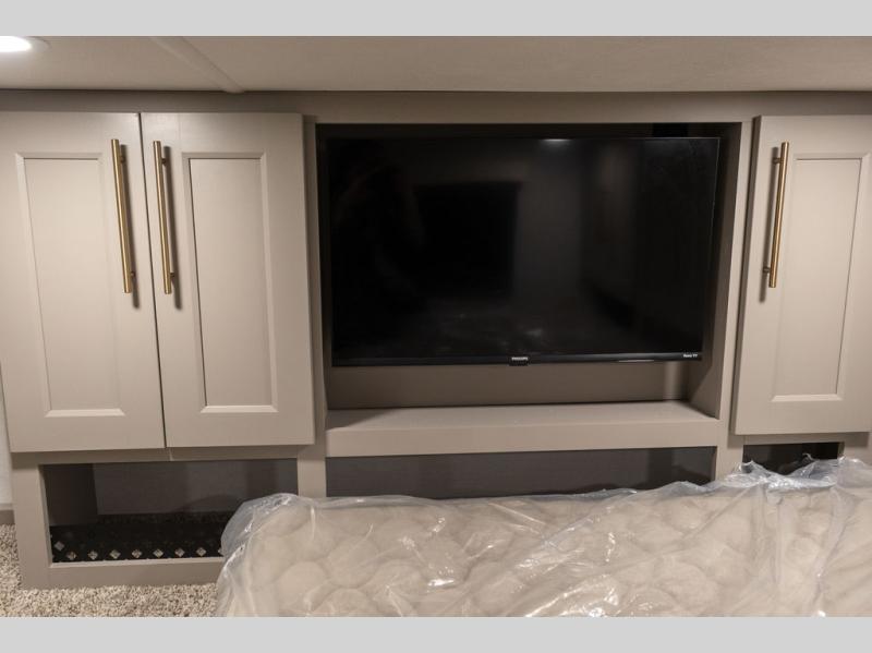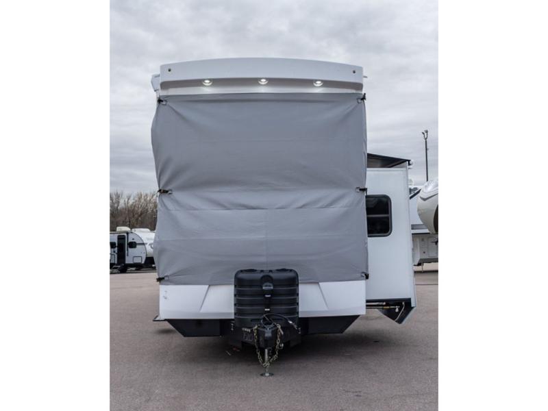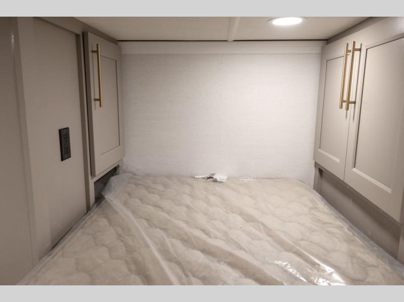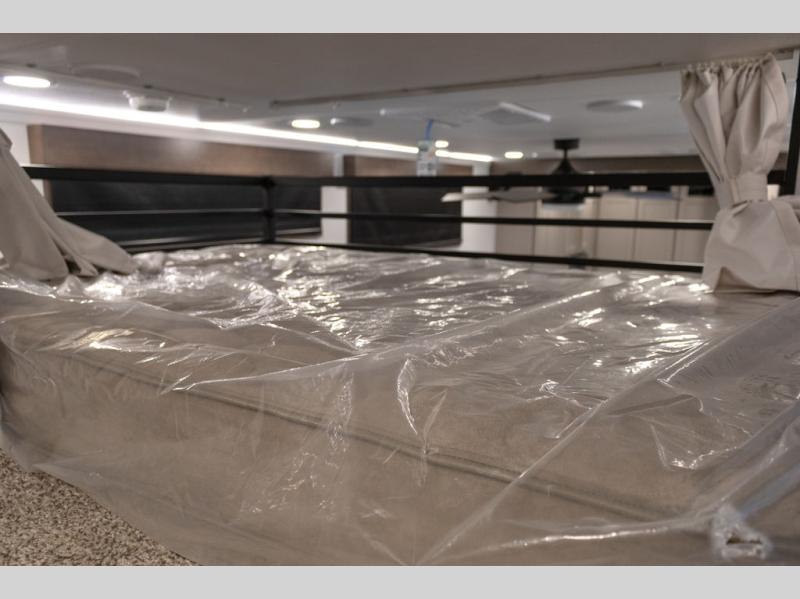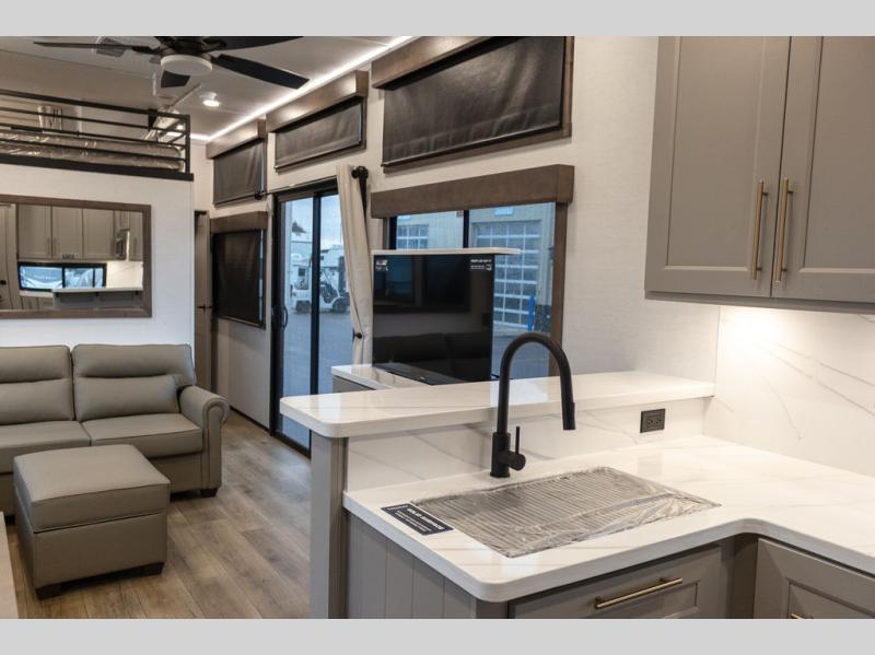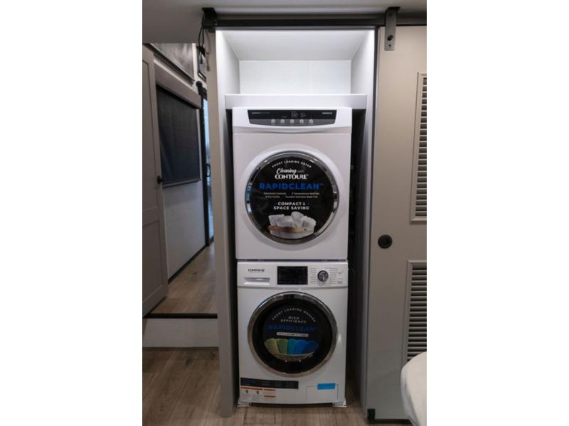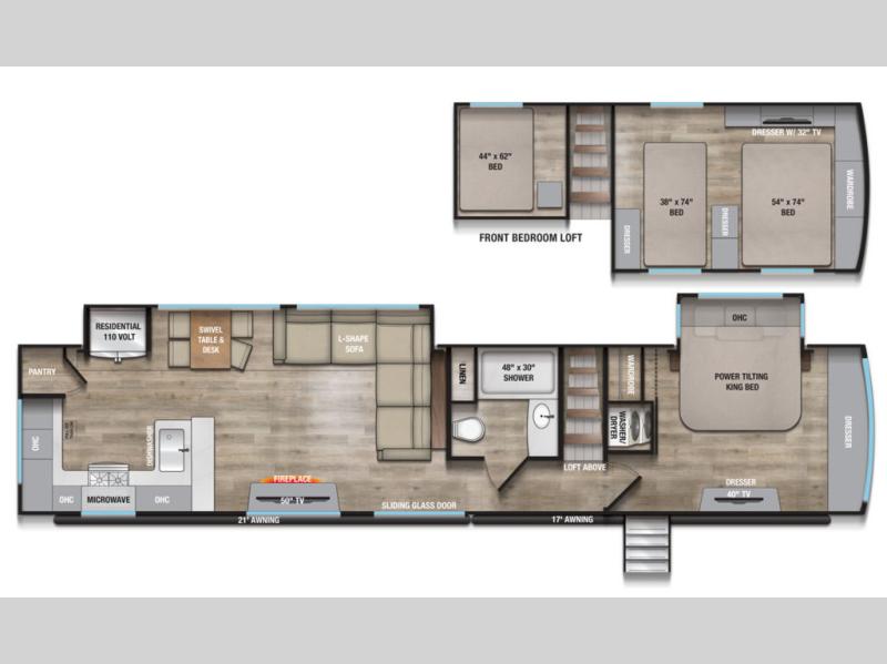 Plan to stay awhile in this spacious destination trailer! Once you enter the unit, you can kick your feet up on the L-shaped sofa and enjoy the 50" TV and fireplace. The chef of your group can make lunch in the rear kitchen with a U-shaped counter plus a bartop with stools. The swivel table and desk will give you a place to dine together and play a board game in the evening. A set of stairs leads to the front bedroom loft that includes a 38" x 74" bed and 54" x 74" bed on one side, plus a 44" x 62" bed on the other, along with storage space! You'll find a front private bedroom with a power tilting king bed slide out, a large front dresser plus a second dresser, and a washer and dryer to make life on the road easier than ever!