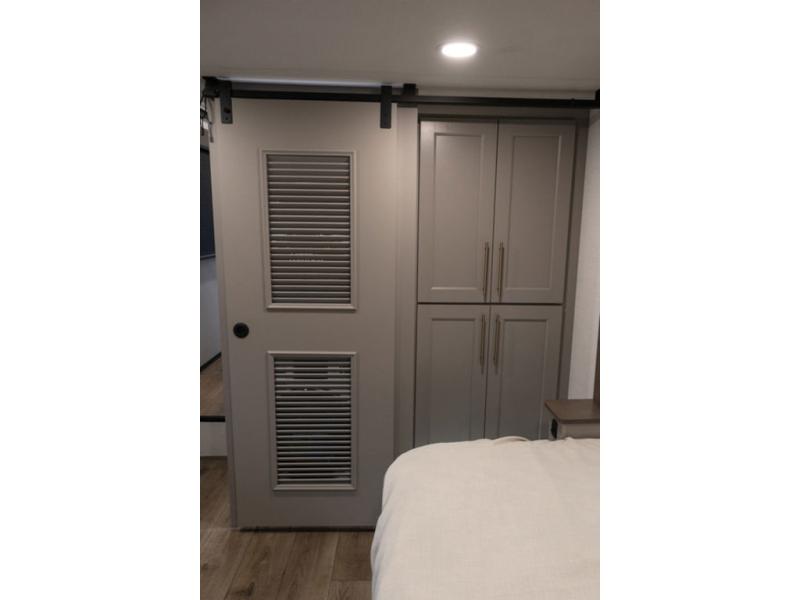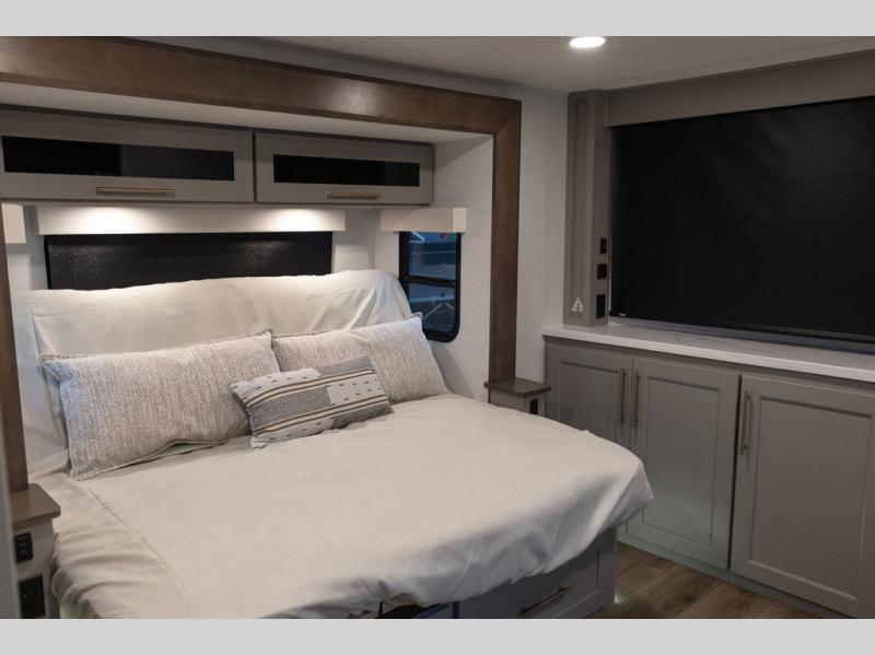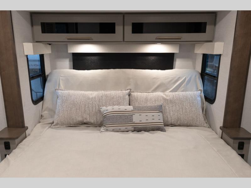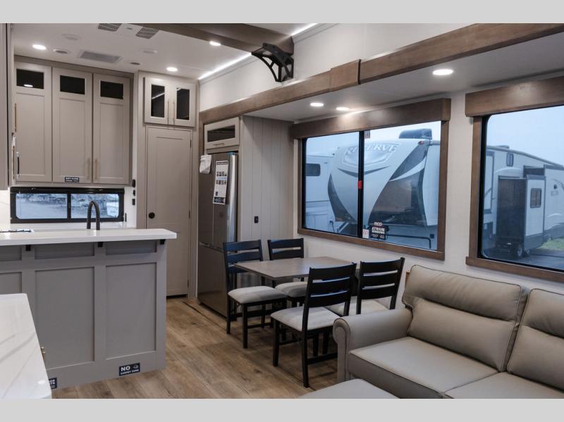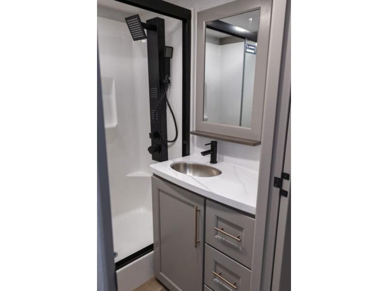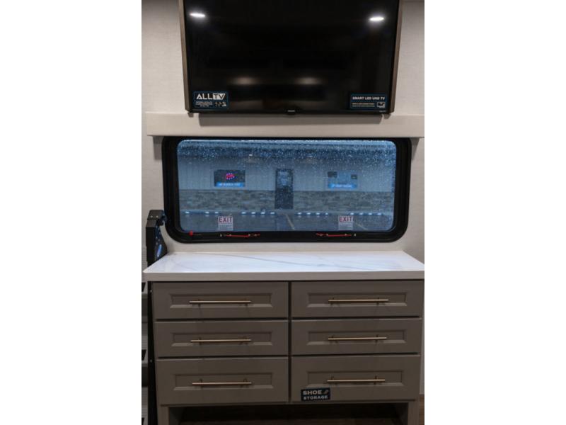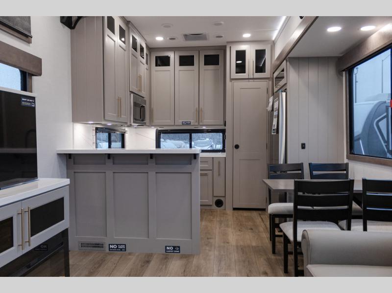 Plan to stay awhile in this spacious destination trailer! Once you enter the unit, you can kick your feet up on the L-shaped sofa and enjoy the 50" TV and fireplace. The chef of your group can make lunch in the rear kitchen with a U-shaped counter plus a bartop with stools. The swivel table and desk will give you a place to dine together and play a board game in the evening. A set of stairs leads to the front bedroom loft that includes a 38" x 74" bed and 54" x 74" bed on one side, plus a 44" x 62" bed on the other, along with storage space! You'll find a front private bedroom with a power tilting king bed slide out, a large front dresser plus a second dresser, and a washer and dryer to make life on the road easier than ever!