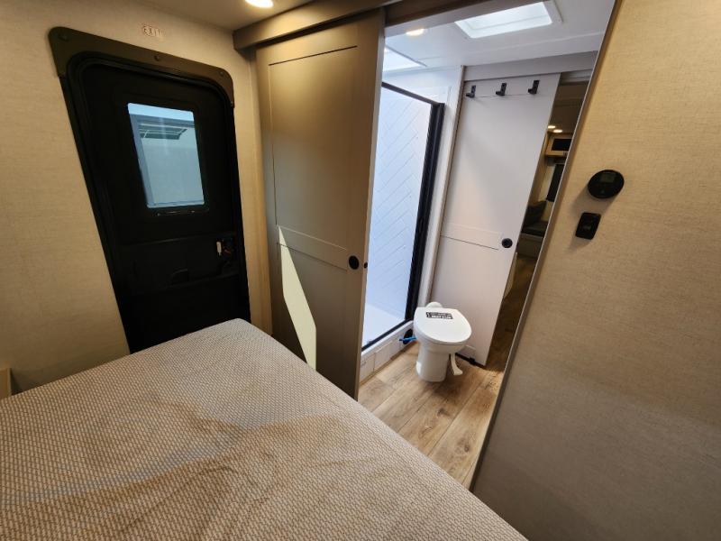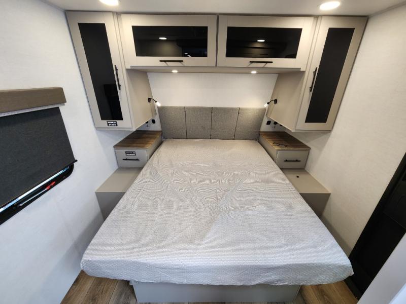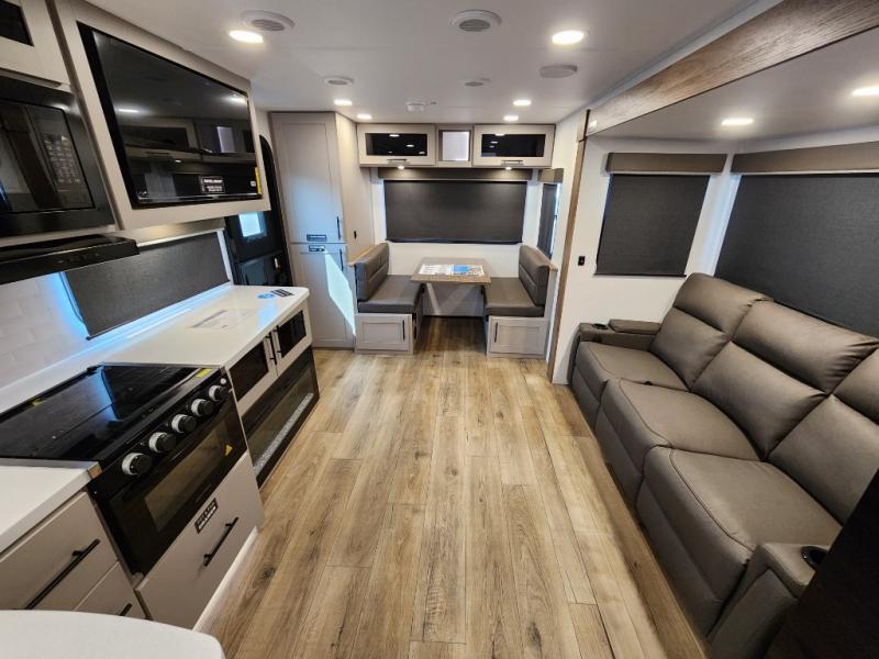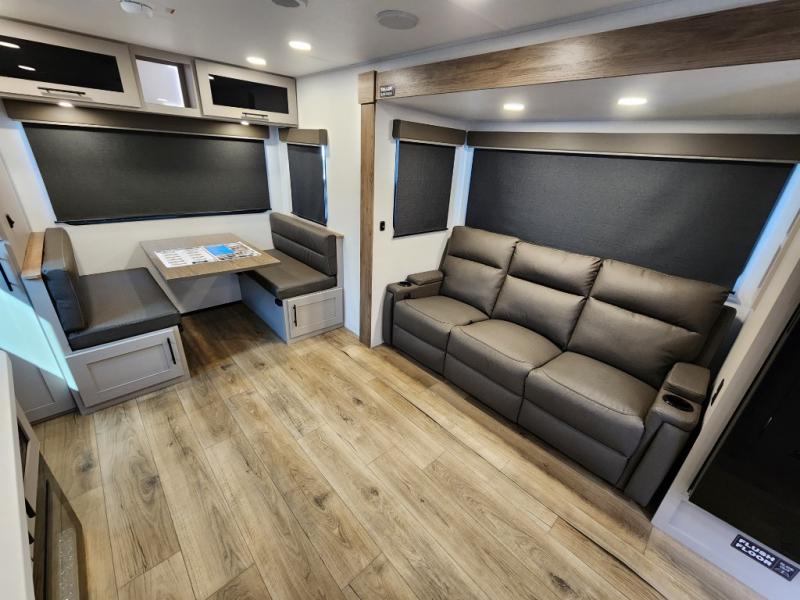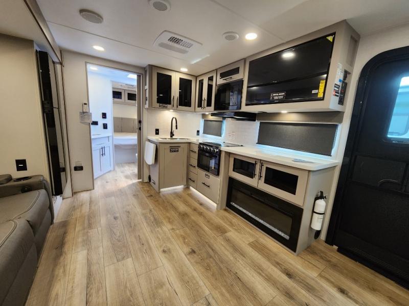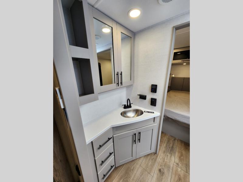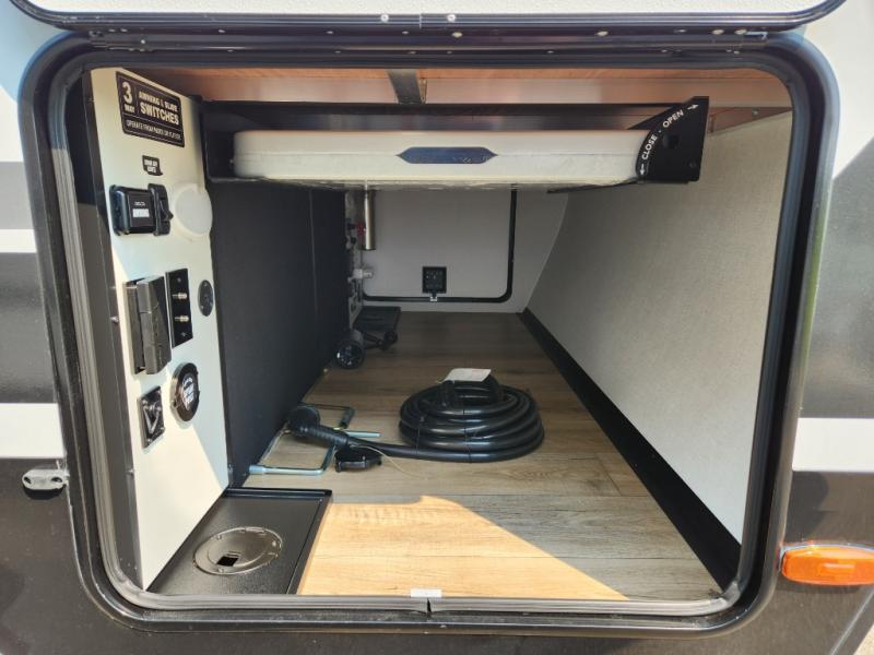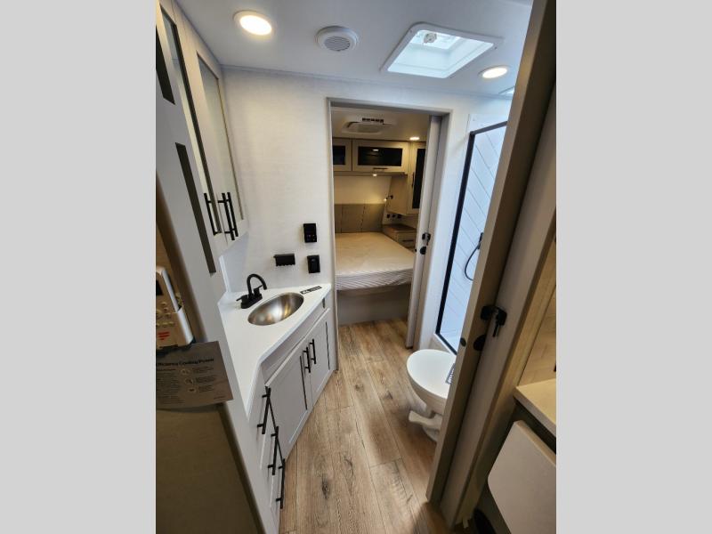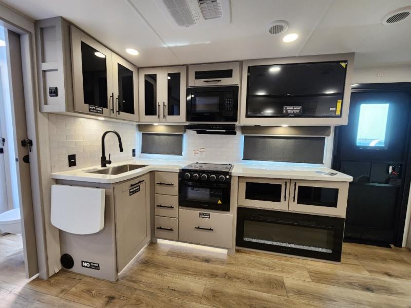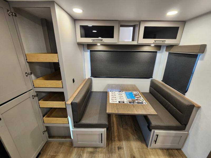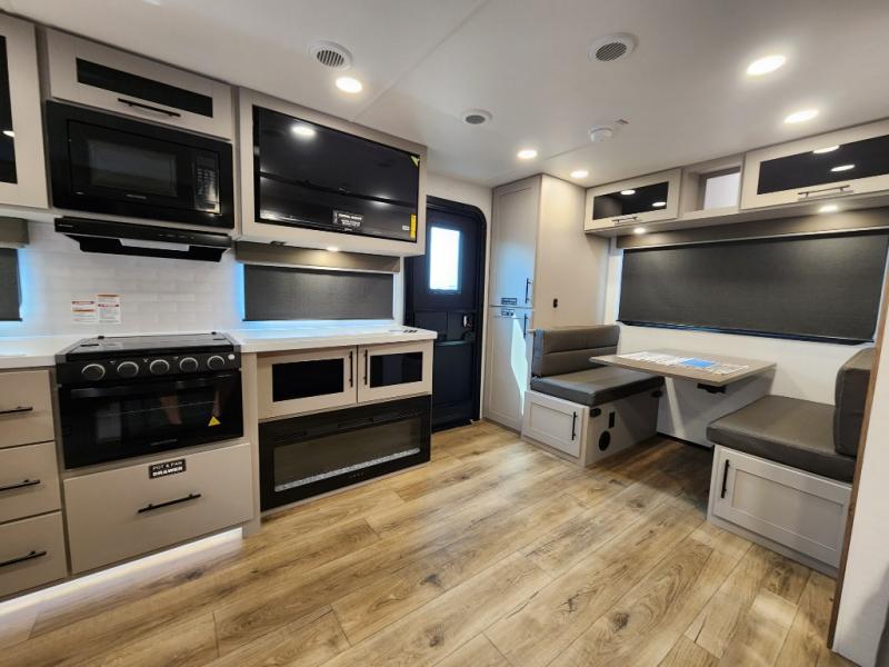 Grab your hiking boots and your sense of adventure for fun camping trips in this single slide out travel trailer. The rear booth dinette includes overhead storage for your things and the sofa slide out is in great view of the 40" HDTV. There is also a fireplace here that will make your space feel more like home plus more storage space, including an entryway pantry and storage above the 10 cu. ft. 12V refrigerator. A walk-through bath will take you to the front master bedroom with a queen bed, wardrobe nightstands, plus its own exterior entry door!