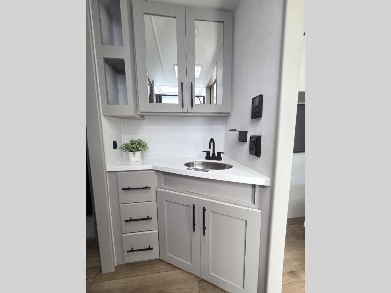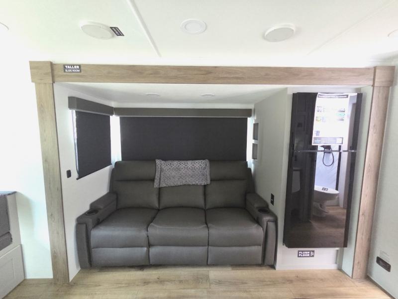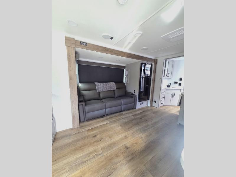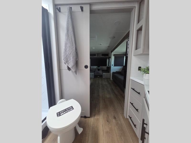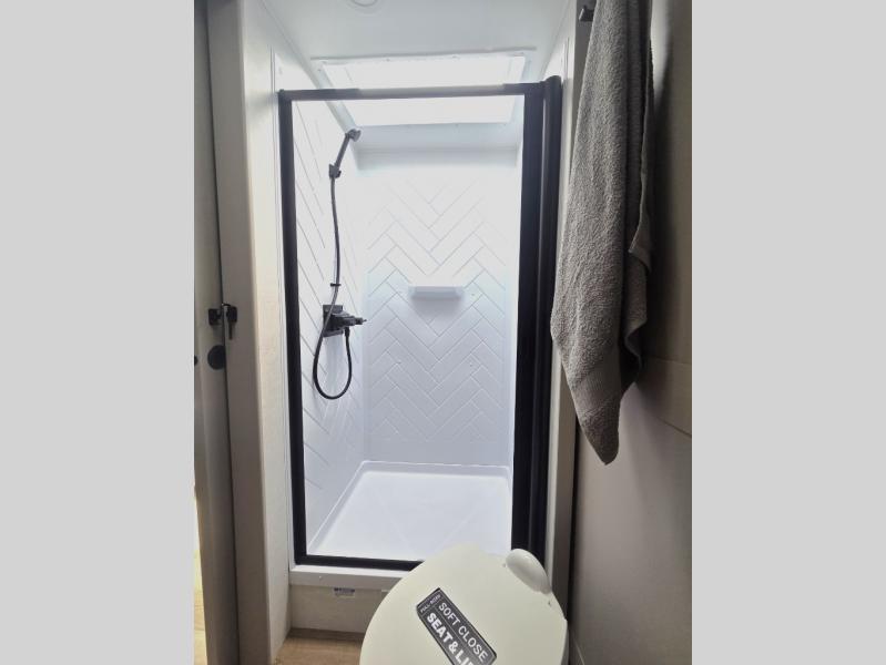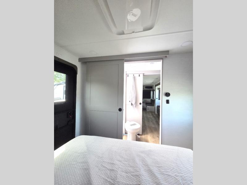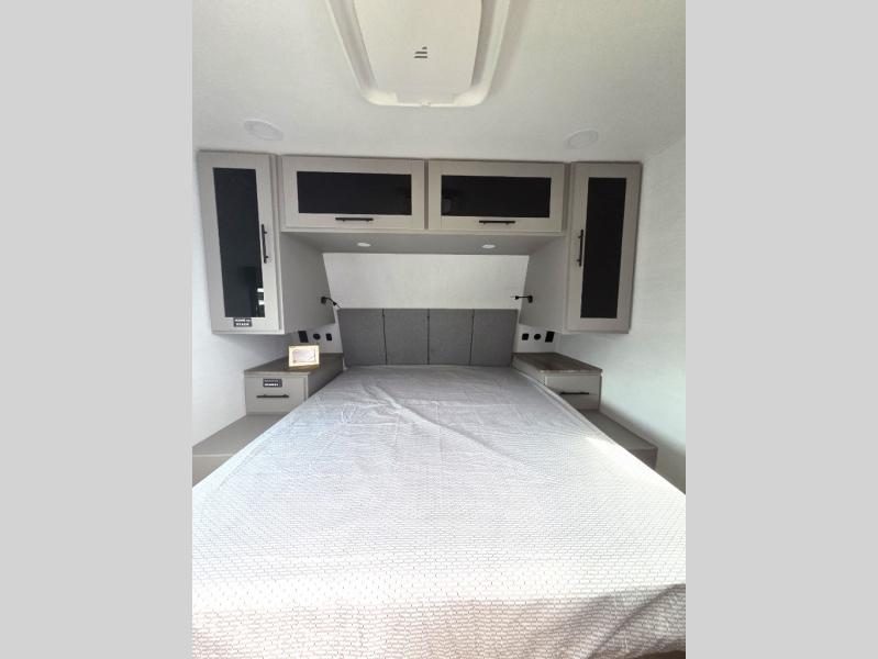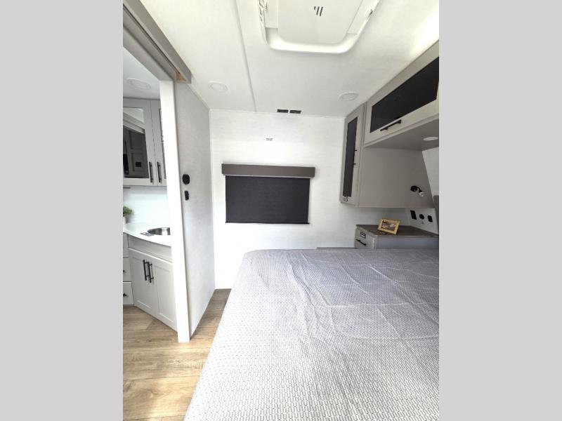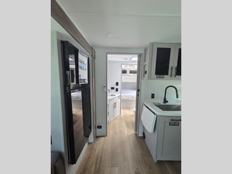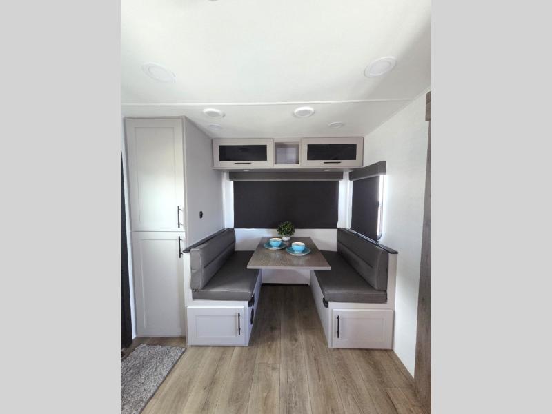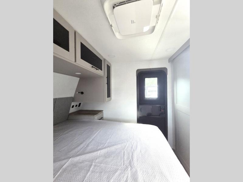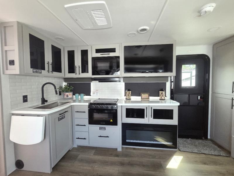 Grab your hiking boots and your sense of adventure for fun camping trips in this single slide out travel trailer. The rear booth dinette includes overhead storage for your things and the sofa slide out is in great view of the 40" HDTV. There is also a fireplace here that will make your space feel more like home plus more storage space, including an entryway pantry and storage above the 10 cu. ft. 12V refrigerator. A walk-through bath will take you to the front master bedroom with a queen bed, wardrobe nightstands, plus its own exterior entry door!