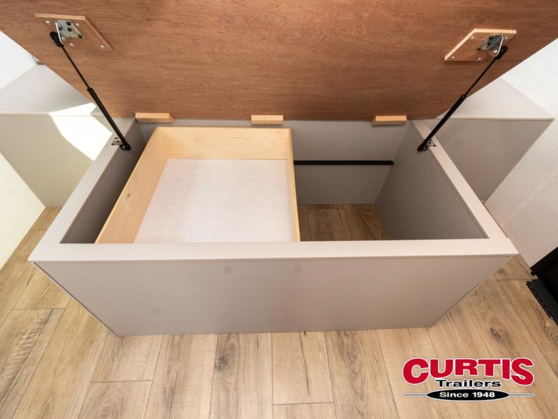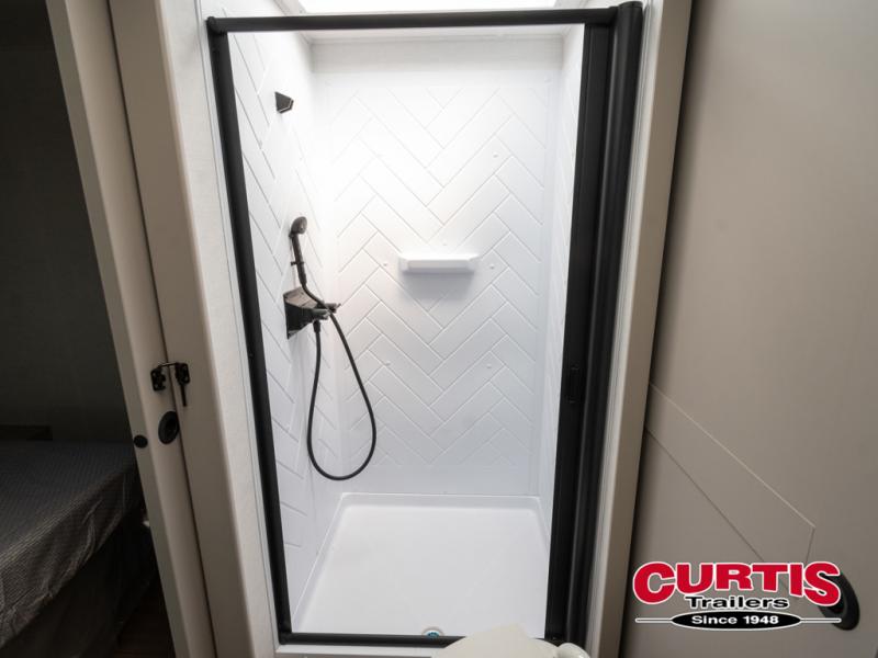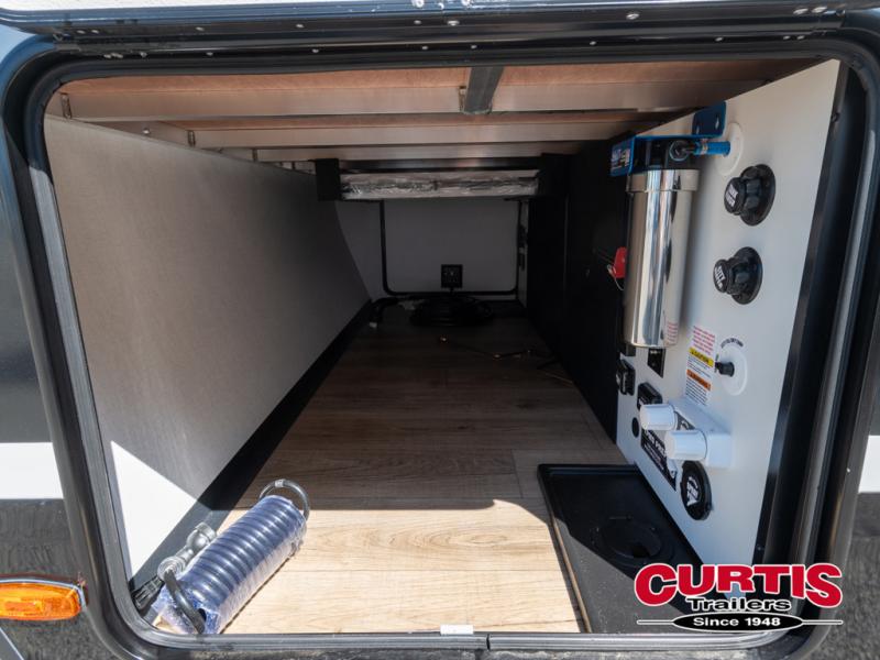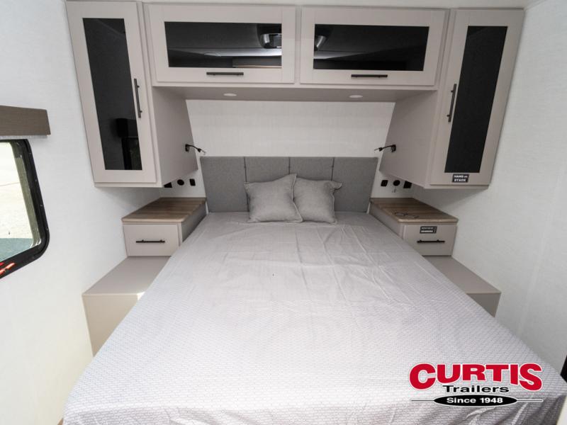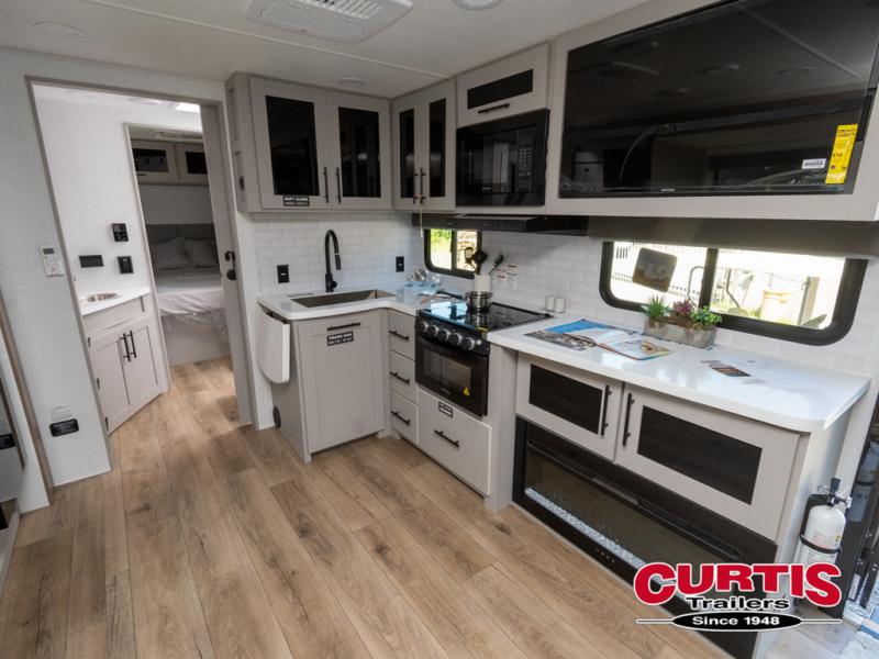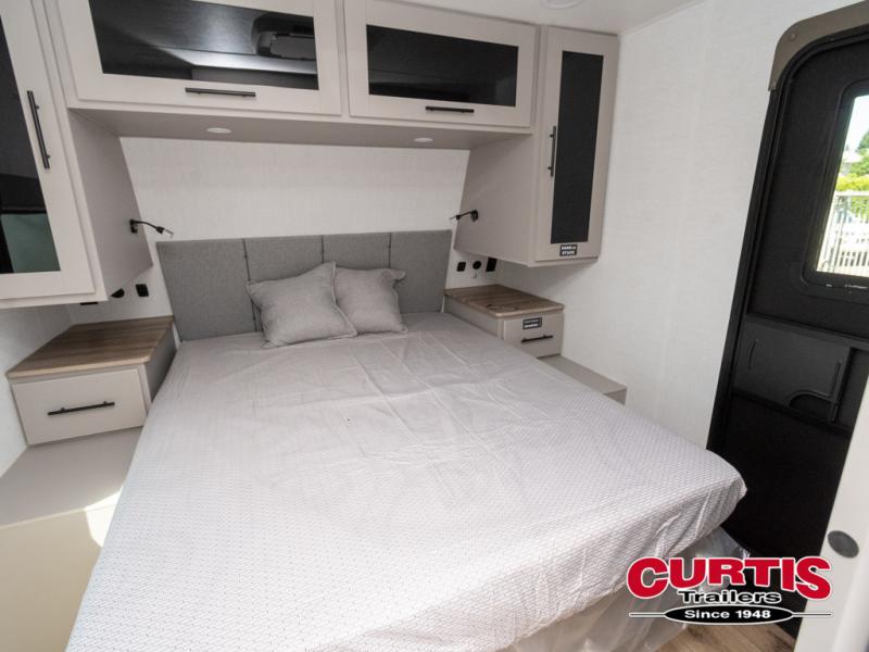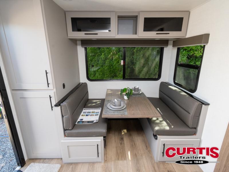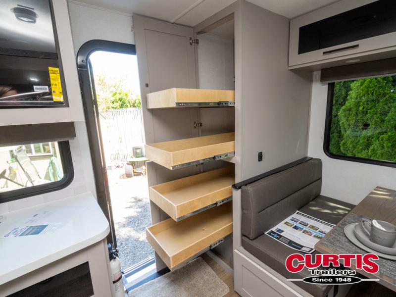 Grab your hiking boots and your sense of adventure for fun camping trips in this single slide out travel trailer. The rear booth dinette includes overhead storage for your things and the sofa slide out is in great view of the 40" HDTV. There is also a fireplace here that will make your space feel more like home plus more storage space, including an entryway pantry and storage above the 10 cu. ft. 12V refrigerator. A walk-through bath will take you to the front master bedroom with a queen bed, wardrobe nightstands, plus its own exterior entry door!