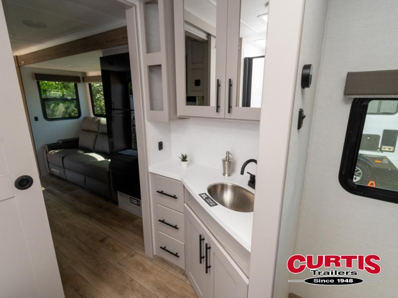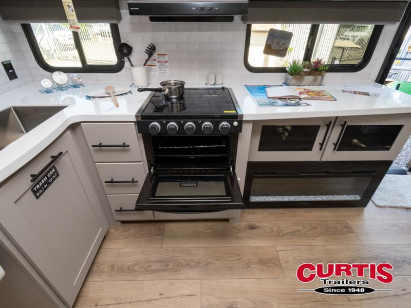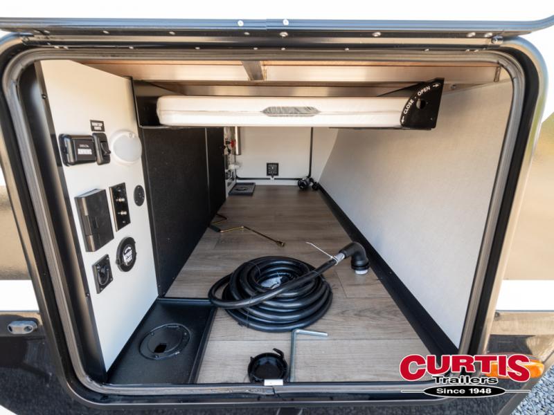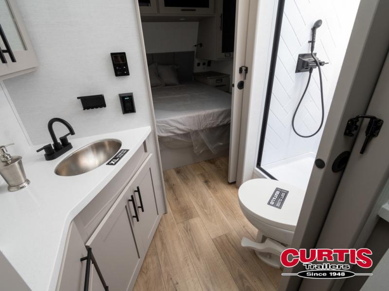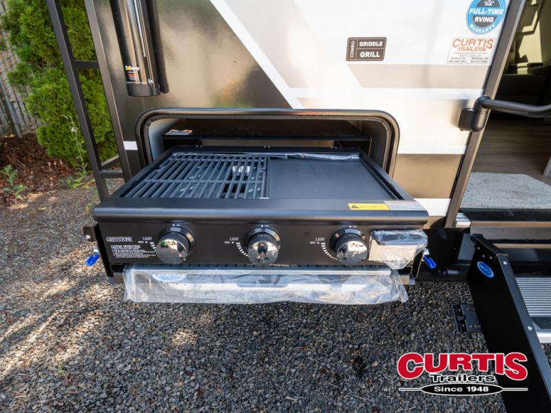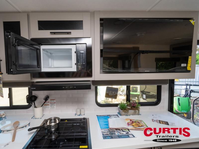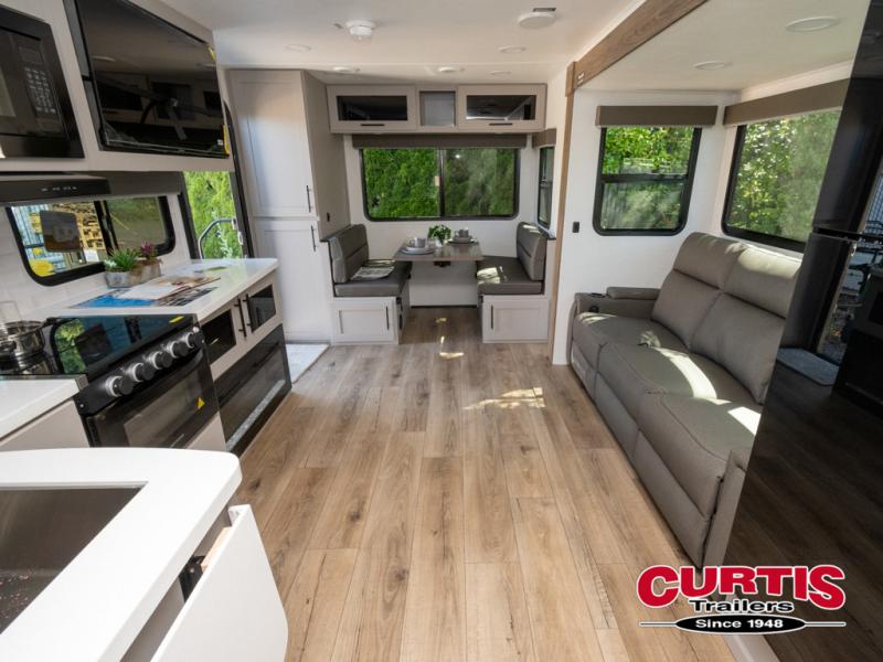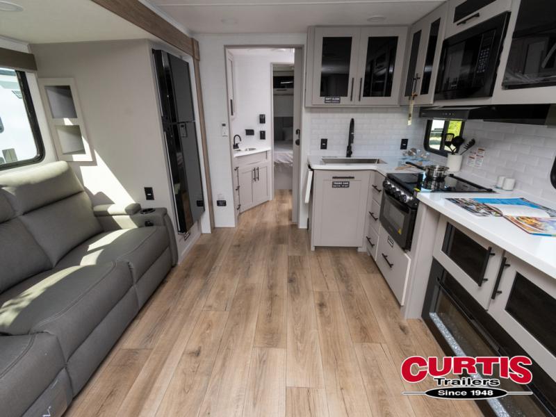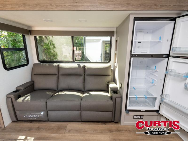 Grab your hiking boots and your sense of adventure for fun camping trips in this single slide out travel trailer. The rear booth dinette includes overhead storage for your things and the sofa slide out is in great view of the 40" HDTV. There is also a fireplace here that will make your space feel more like home plus more storage space, including an entryway pantry and storage above the 10 cu. ft. 12V refrigerator. A walk-through bath will take you to the front master bedroom with a queen bed, wardrobe nightstands, plus its own exterior entry door!