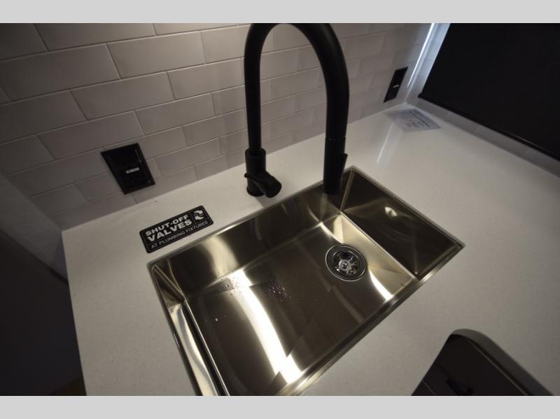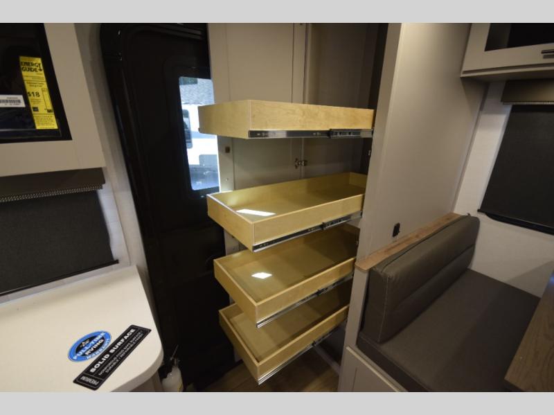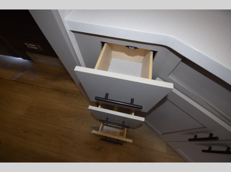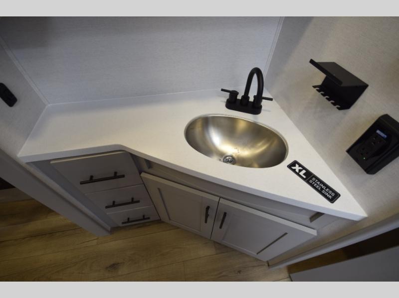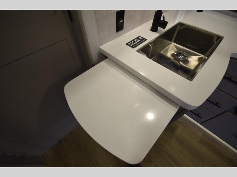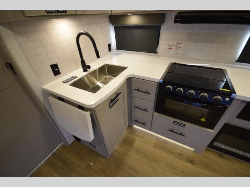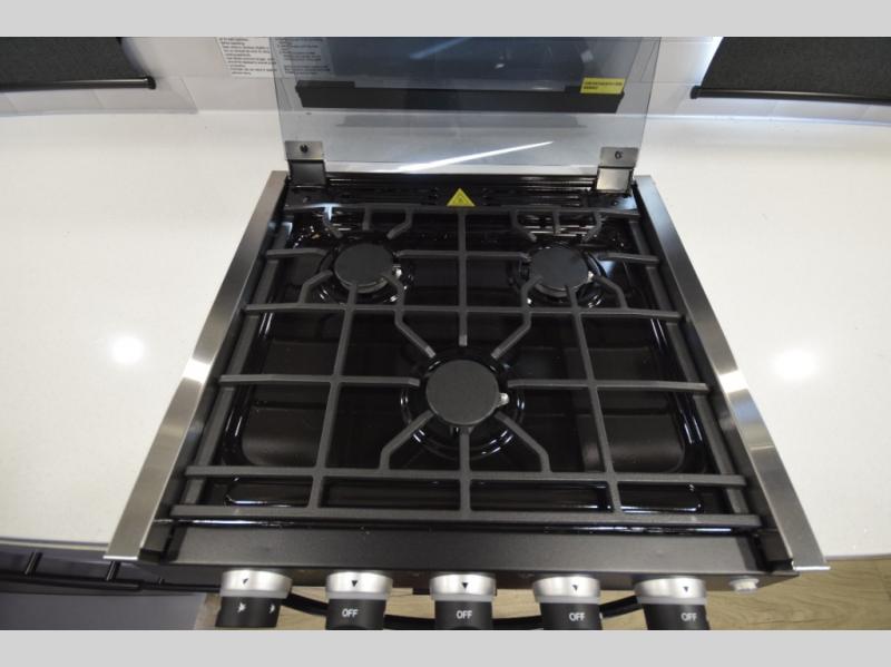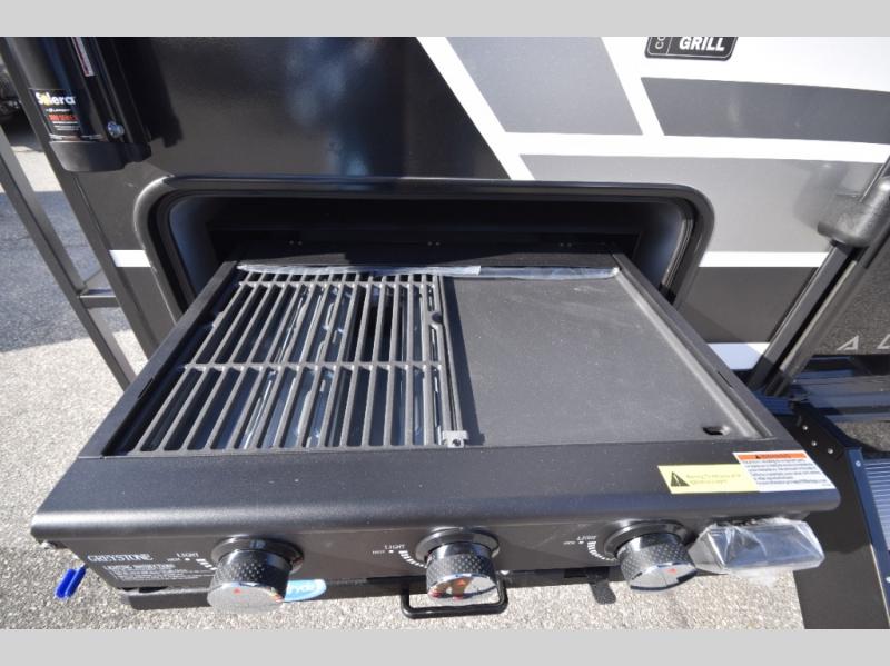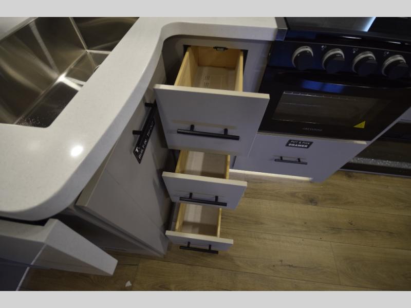 Whip up your favorite meals with full kitchen amenities inside, or fire up the exterior griddle for outdoor breakfasts and evening BBQs. The 10 cu. ft. 12V refrigerator keeps food and drinks fresh, while clever features like the pull-out trash can make cleanup a breeze.