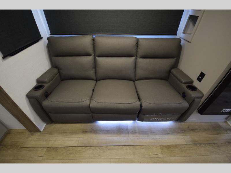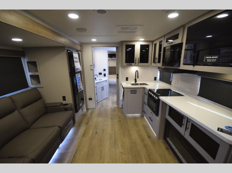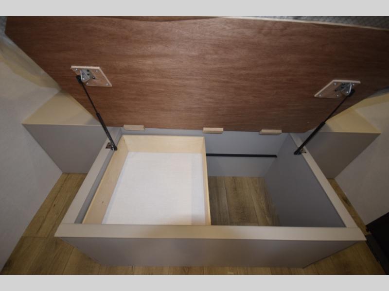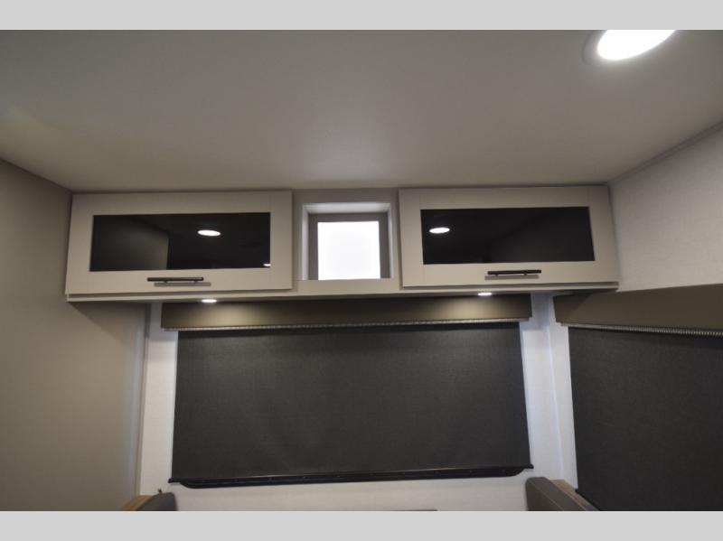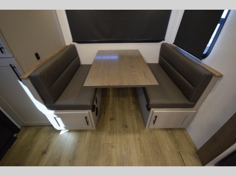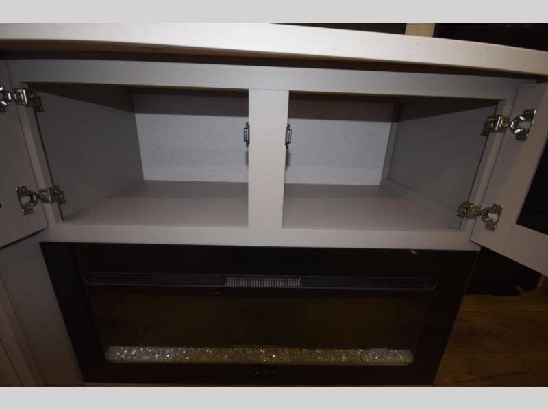 Step inside and find a spacious rear booth dinette, perfect for morning coffee, meals, or game night—with plenty of overhead storage for your essentials. The sofa slide-out expands your living area and gives you the perfect view of the 40” HDTV and cozy electric fireplace, adding that warm, residential feel wherever you roam.