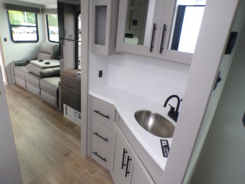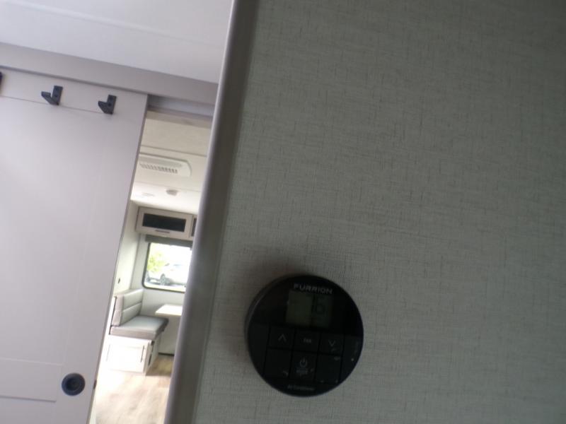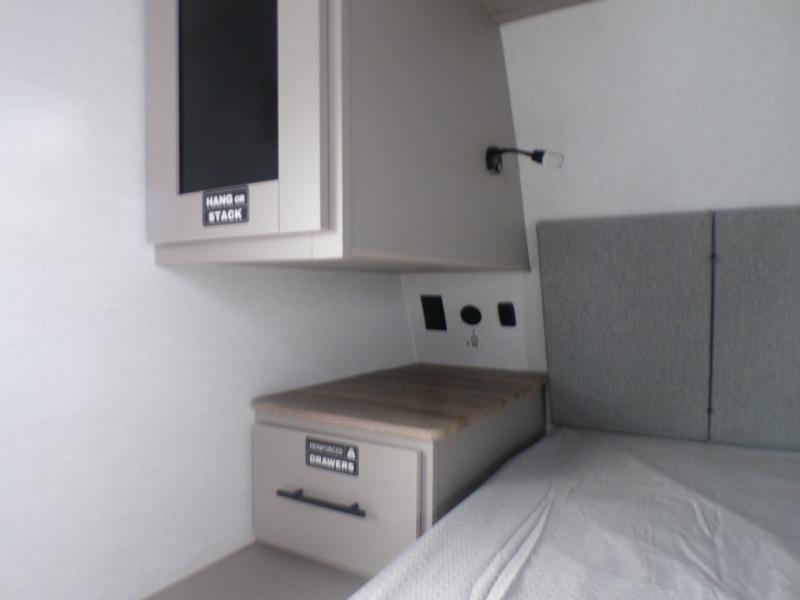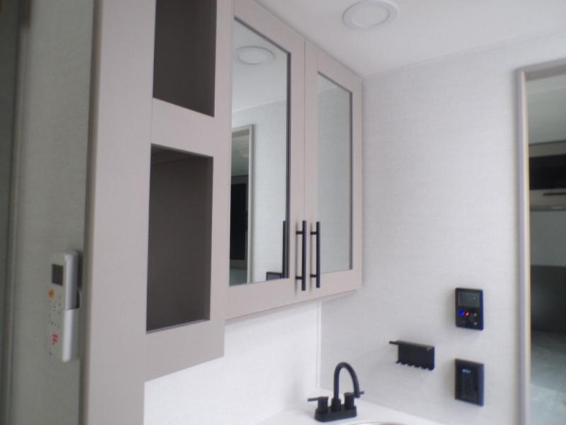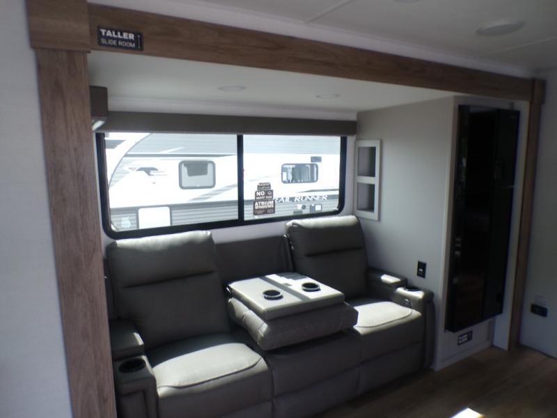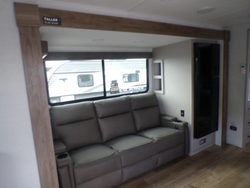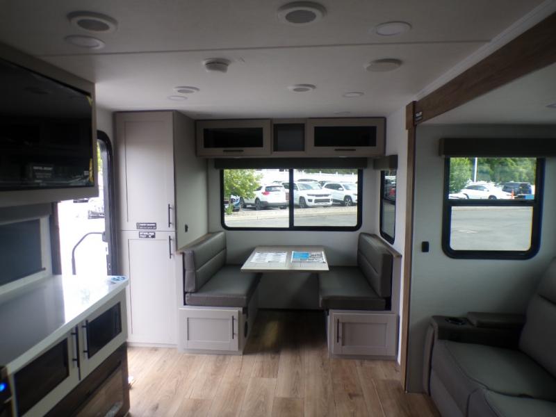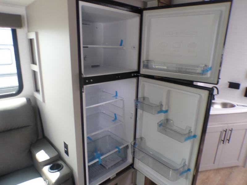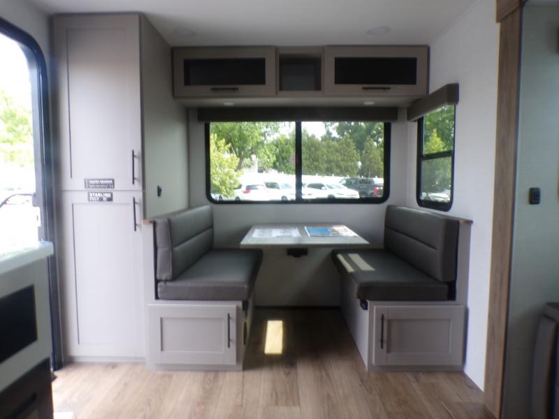 Grab your hiking boots and your sense of adventure for fun camping trips in this single slide out travel trailer. The rear booth dinette includes overhead storage for your things and the sofa slide out is in great view of the 40" HDTV. There is also a fireplace here that will make your space feel more like home plus more storage space, including an entryway pantry and storage above the 10 cu. ft. 12V refrigerator. A walk-through bath will take you to the front master bedroom with a queen bed, wardrobe nightstands, plus its own exterior entry door!
