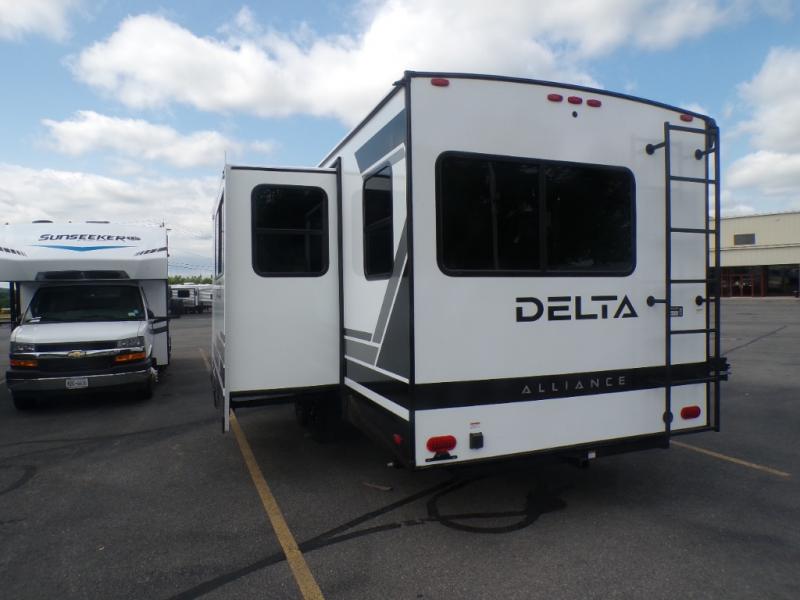 Form and function works together with every one of these Alliance RV Delta travel trailers! They are built with a walk-on roof with a seamless PVC roof covering, Mylar reinforced exterior seals, and a heated and enclosed underbelly to protect your unit in all seasons. The commercial grade vinyl flooring will be easy to clean and the oversized atrium windows throughout let in plenty of natural sunlight. With 62 cu. ft. of drop frame pass-through storage, you can bring along all of your essential camping gear plus it has USB charging for more convenience. There are many at home interior conveniences including a Bluetooth speaker, USB charging throughout, and even a pull-out kitchen trash can. Come find your favorite model today!