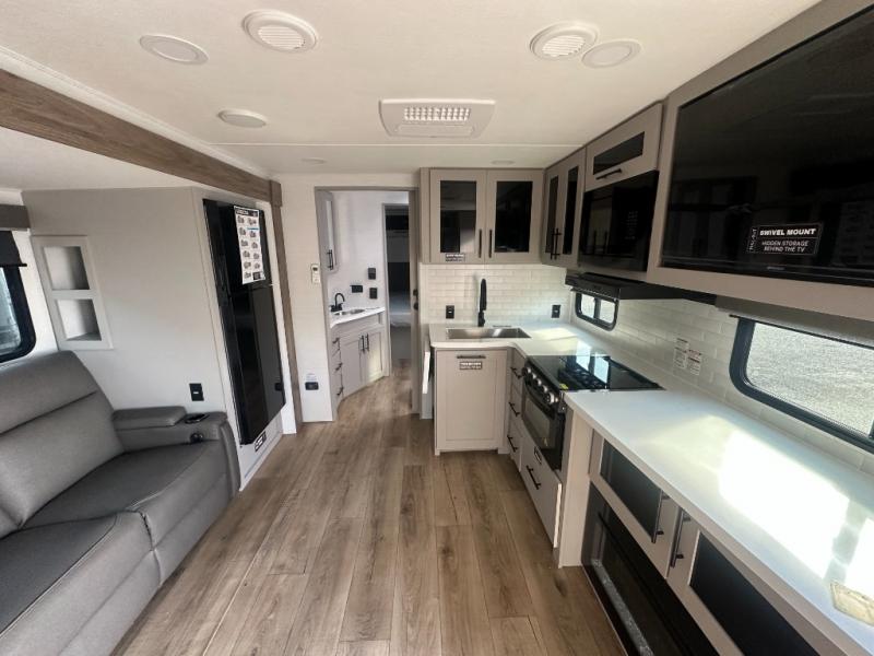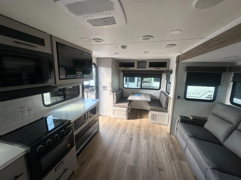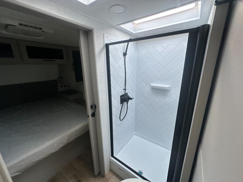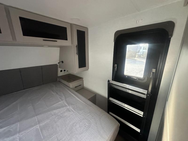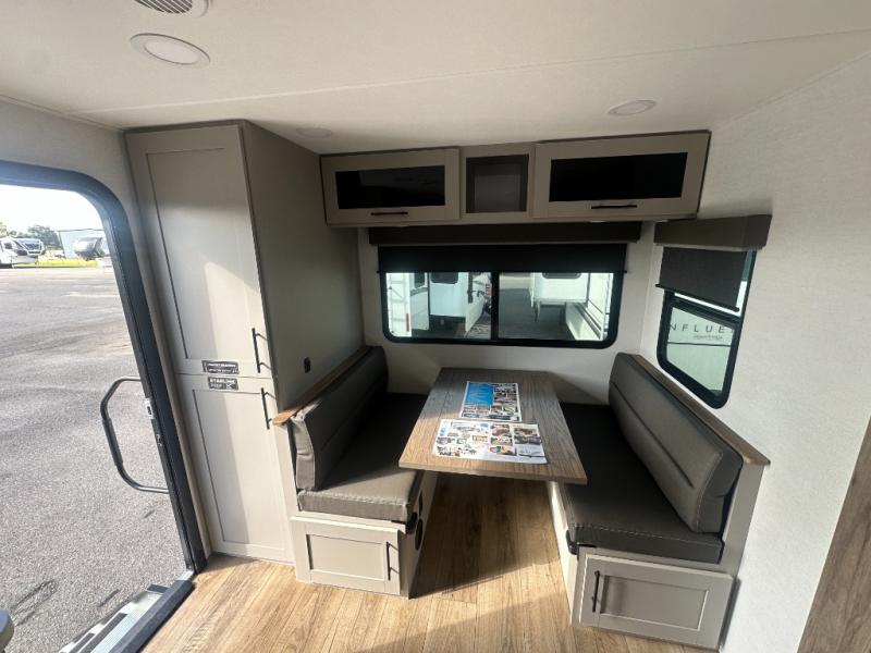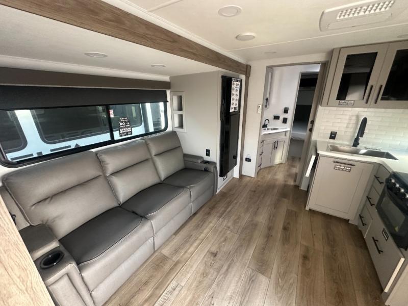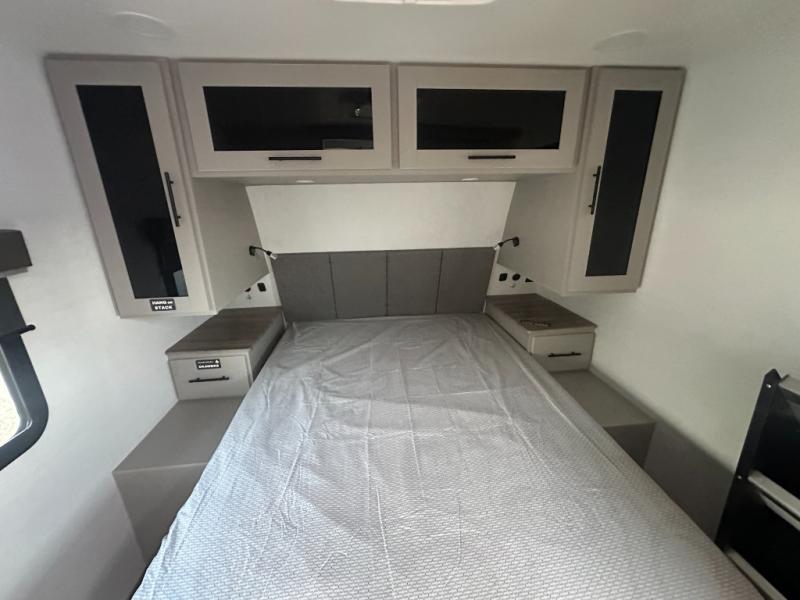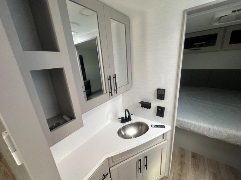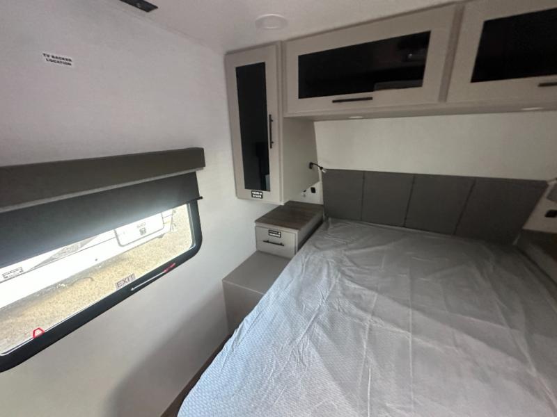 Grab your hiking boots and your sense of adventure for fun camping trips in this single slide out travel trailer. The rear booth dinette includes overhead storage for your things and the sofa slide out is in great view of the 40" HDTV. There is also a fireplace here that will make your space feel more like home plus more storage space, including an entryway pantry and storage above the 10 cu. ft. 12V refrigerator. A walk-through bath will take you to the front master bedroom with a queen bed, wardrobe nightstands, plus its own exterior entry door!
