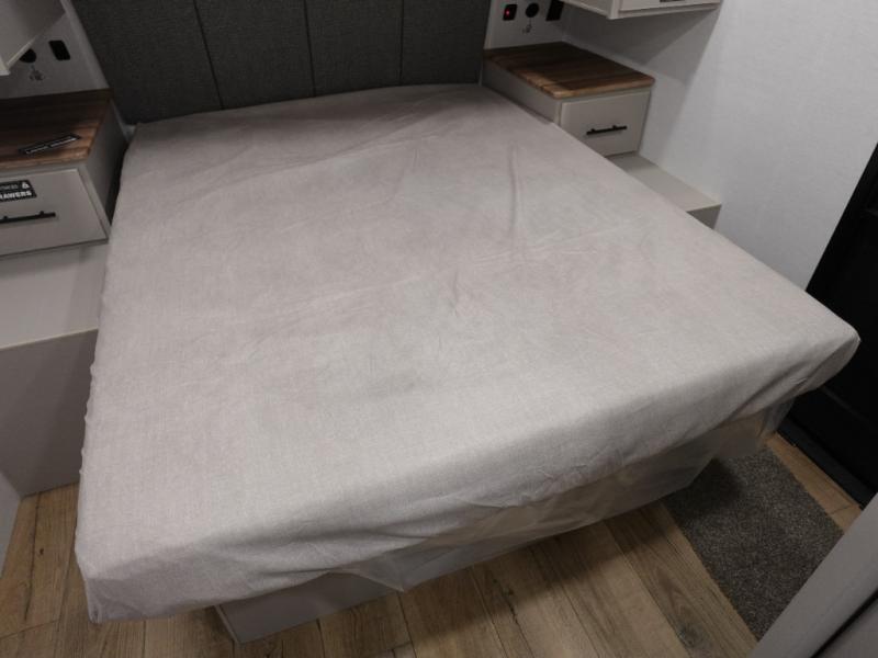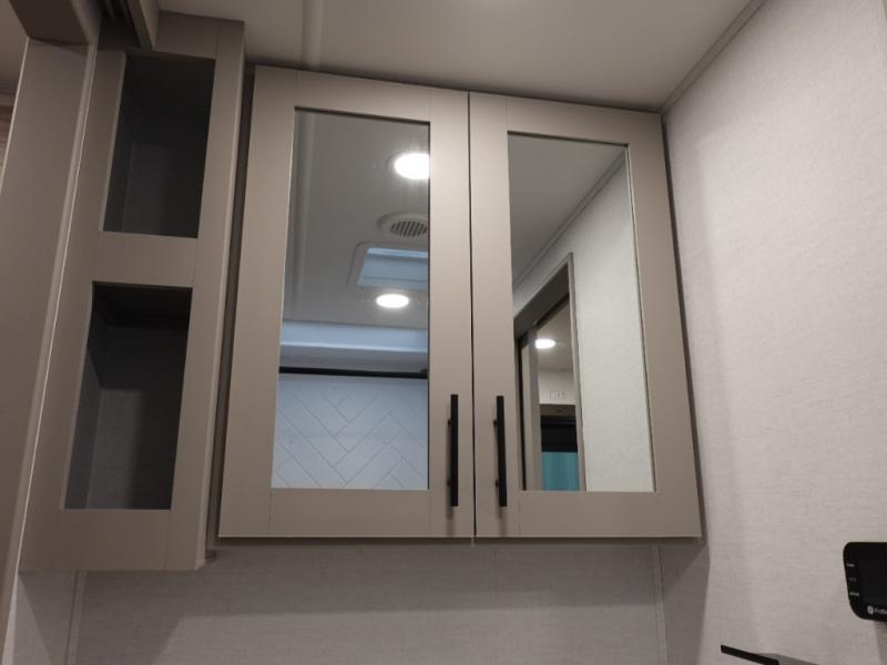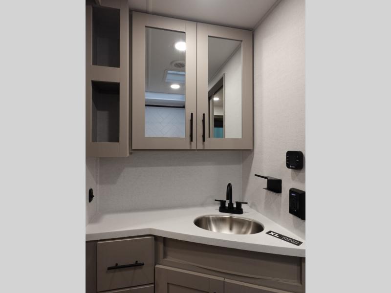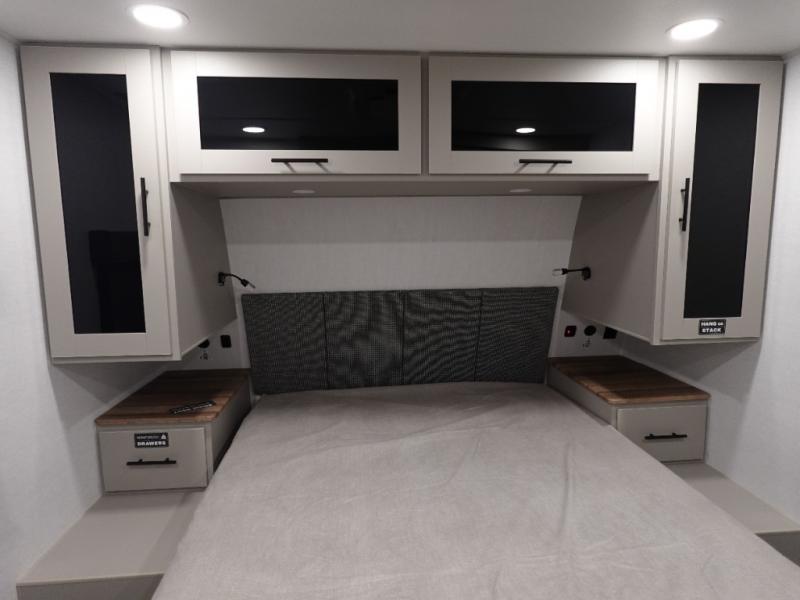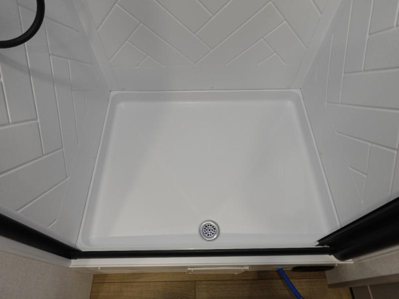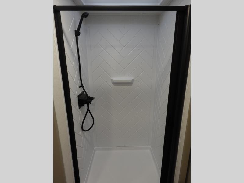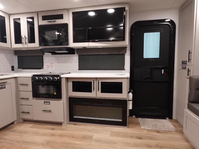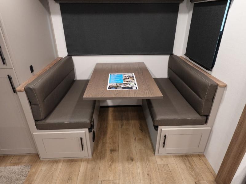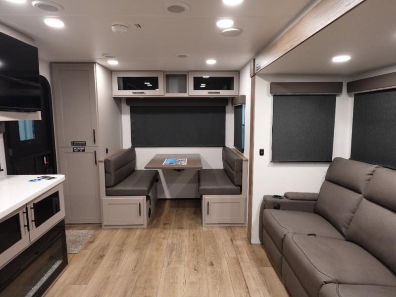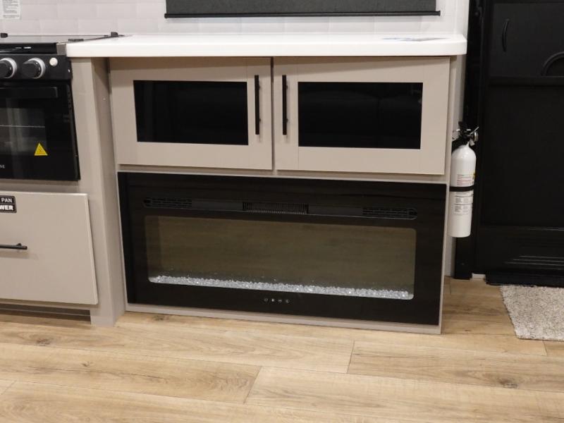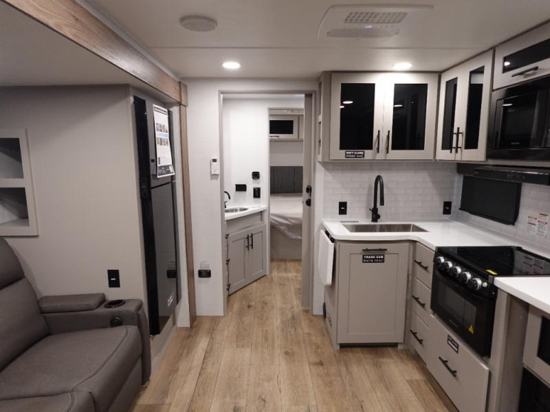 Grab your hiking boots and your sense of adventure for fun camping trips in this single slide out travel trailer. The rear booth dinette includes overhead storage for your things and the sofa slide out is in great view of the 40" HDTV. There is also a fireplace here that will make your space feel more like home plus more storage space, including an entryway pantry and storage above the 10 cu. ft. 12V refrigerator. A walk-through bath will take you to the front master bedroom with a queen bed, wardrobe nightstands, plus its own exterior entry door!