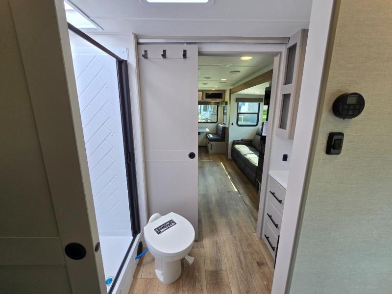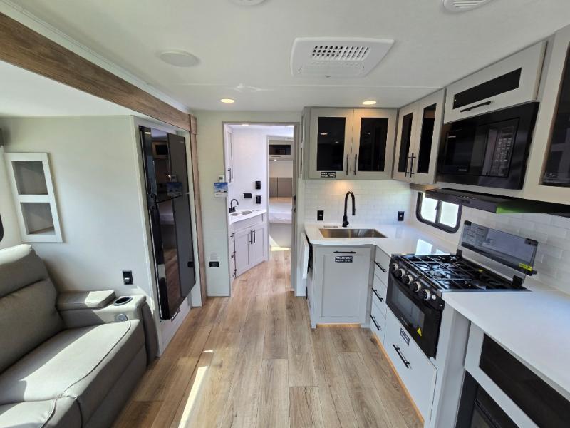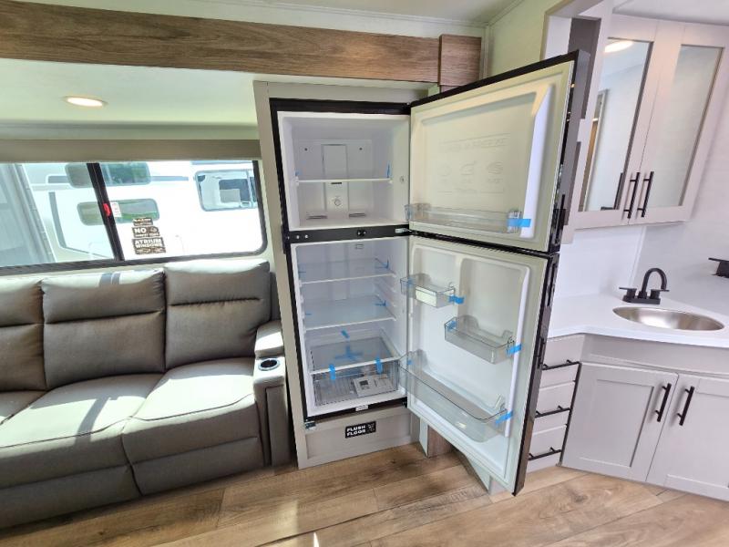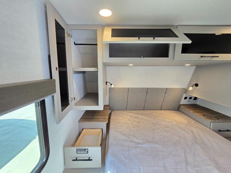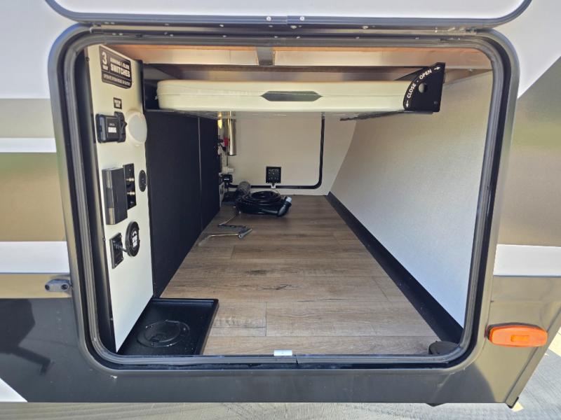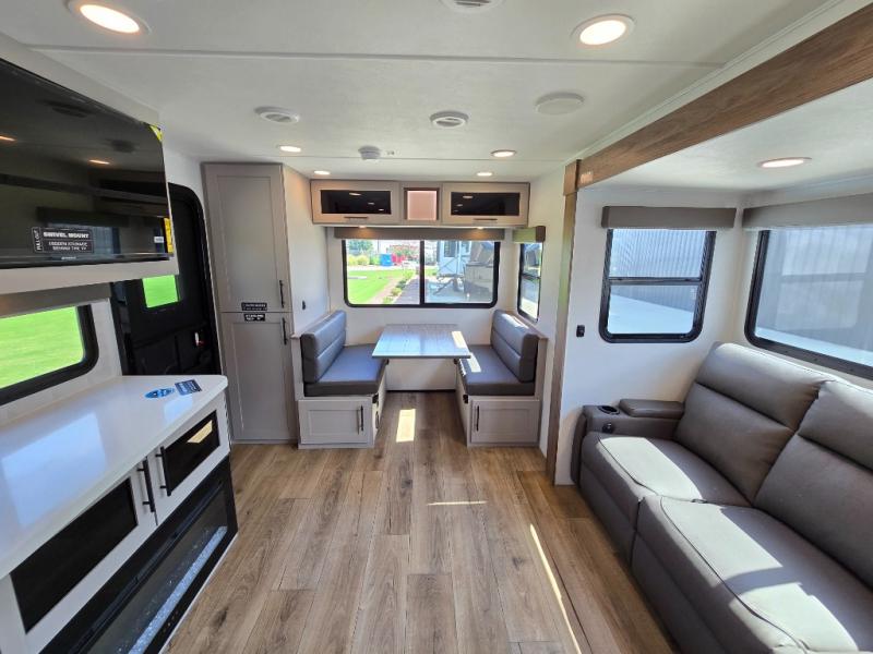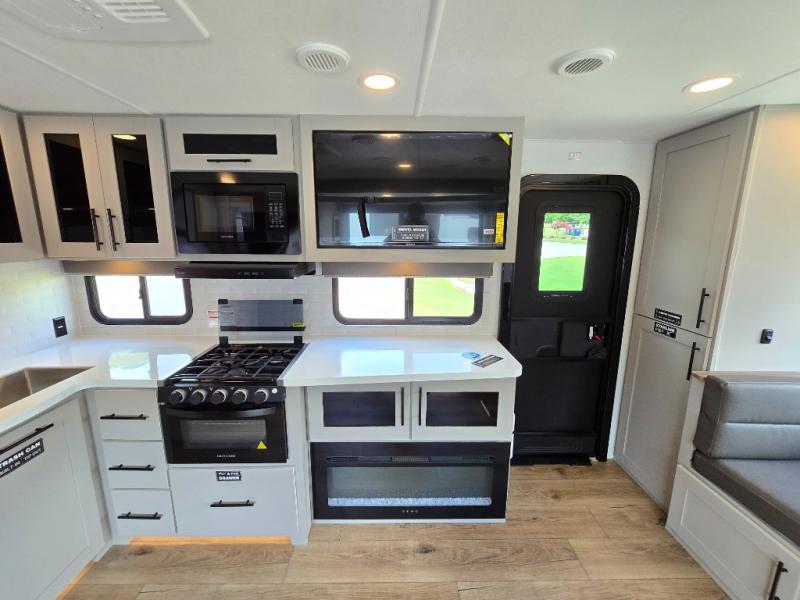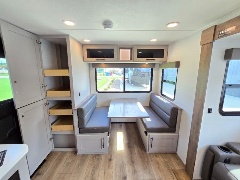 Grab your hiking boots and your sense of adventure for fun camping trips in this single slide out travel trailer. The rear booth dinette includes overhead storage for your things and the sofa slide out is in great view of the 40" HDTV. There is also a fireplace here that will make your space feel more like home plus more storage space, including an entryway pantry and storage above the 10 cu. ft. 12V refrigerator. A walk-through bath will take you to the front master bedroom with a queen bed, wardrobe nightstands, plus its own exterior entry door!