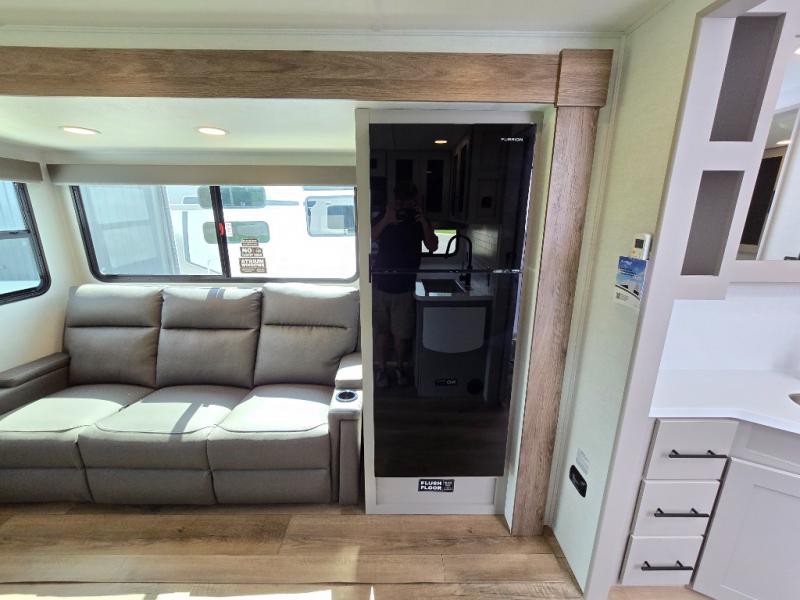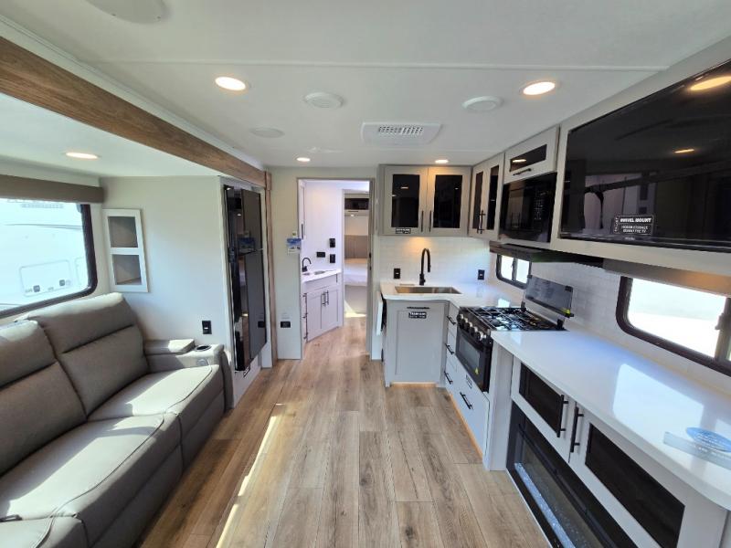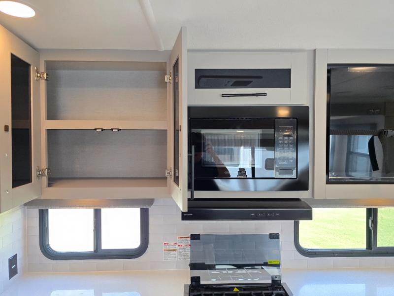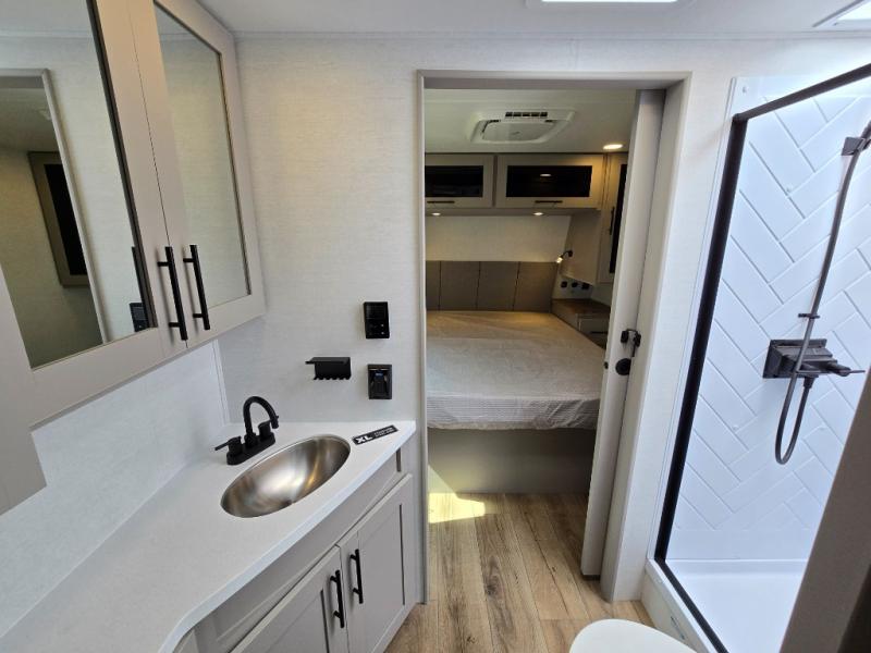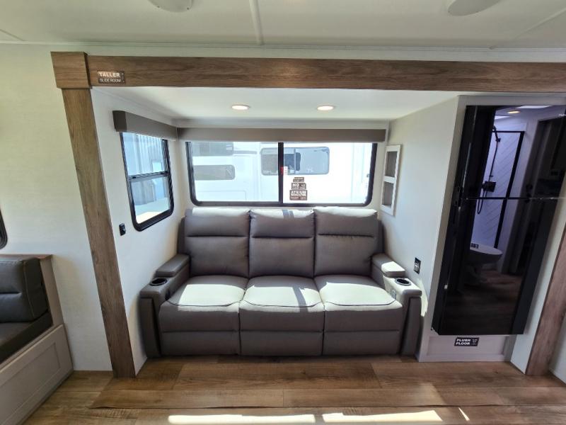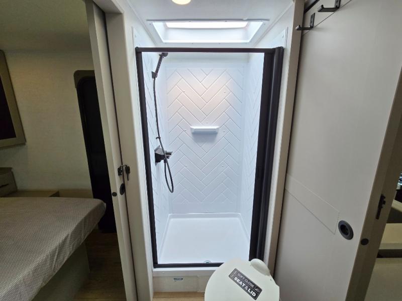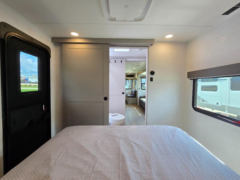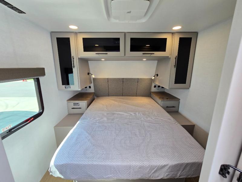 Grab your hiking boots and your sense of adventure for fun camping trips in this single slide out travel trailer. The rear booth dinette includes overhead storage for your things and the sofa slide out is in great view of the 40" HDTV. There is also a fireplace here that will make your space feel more like home plus more storage space, including an entryway pantry and storage above the 10 cu. ft. 12V refrigerator. A walk-through bath will take you to the front master bedroom with a queen bed, wardrobe nightstands, plus its own exterior entry door!