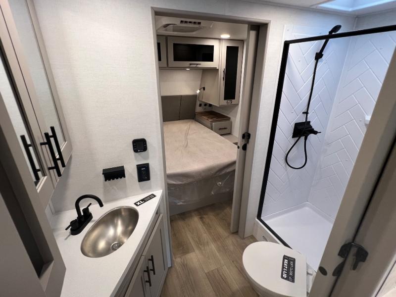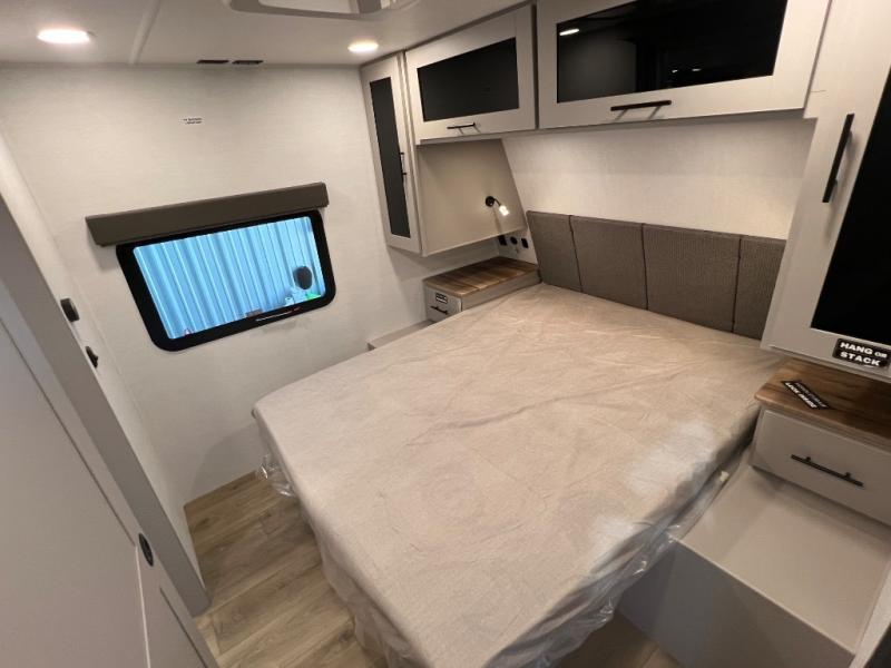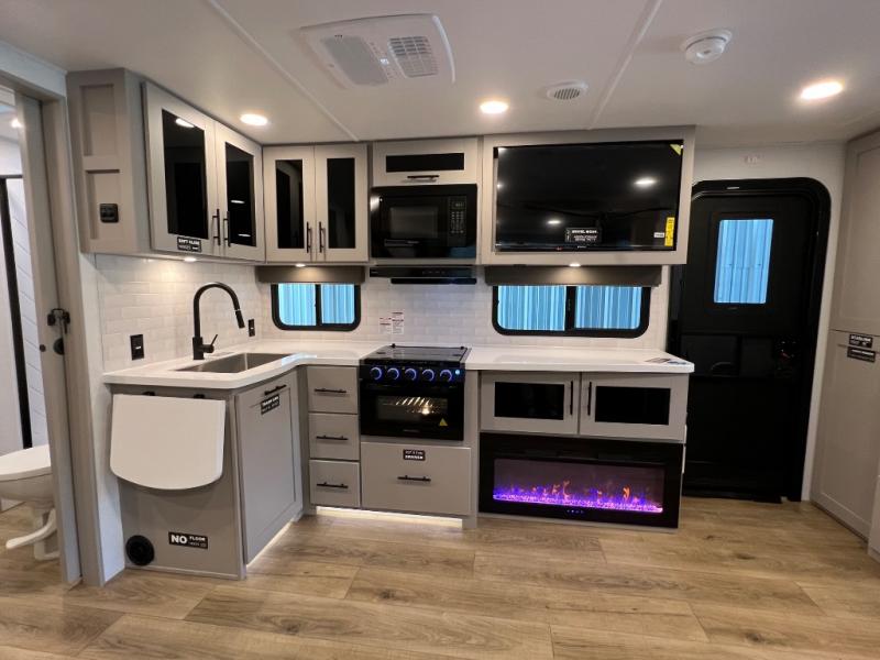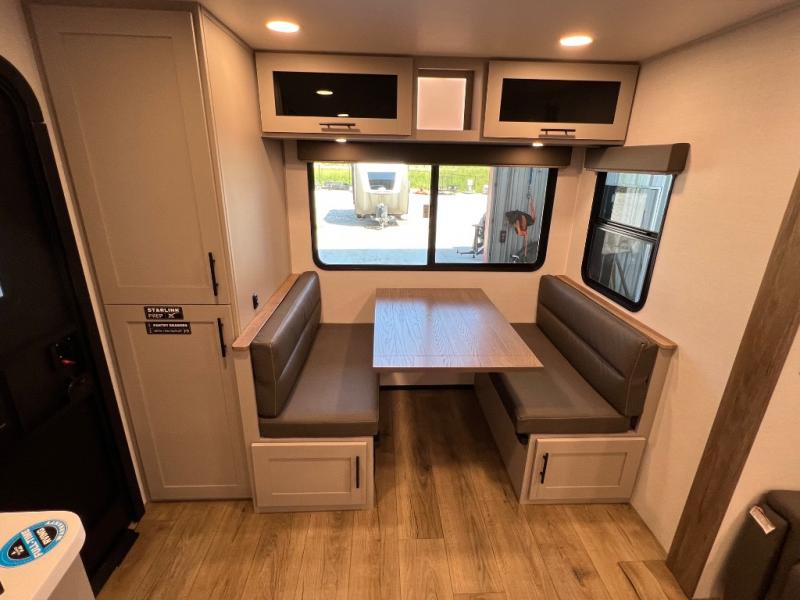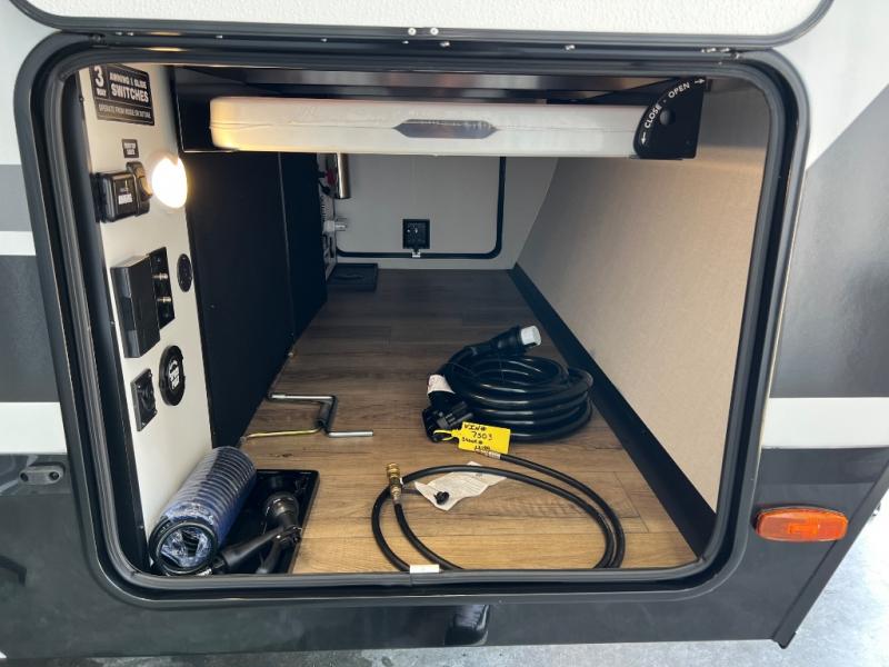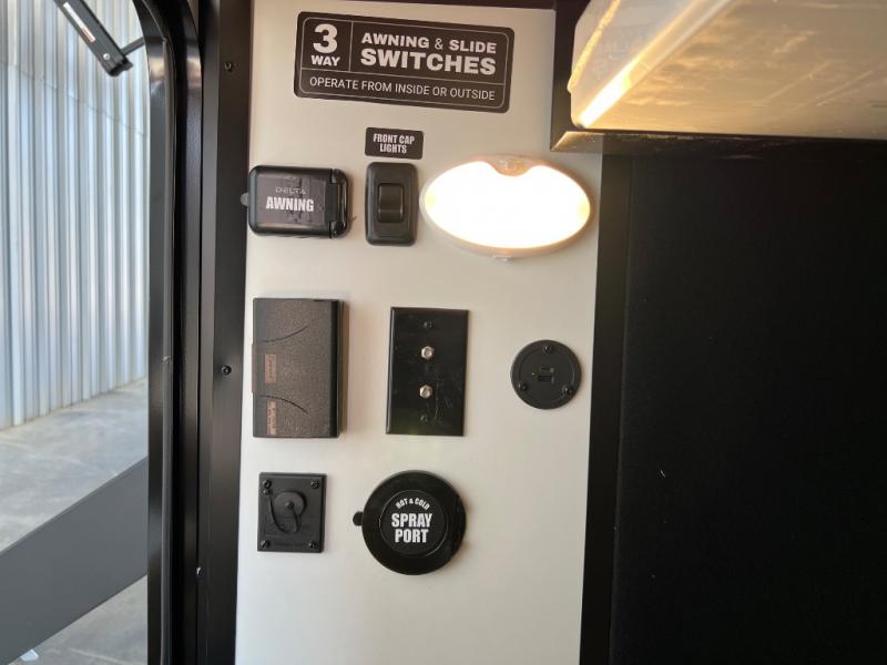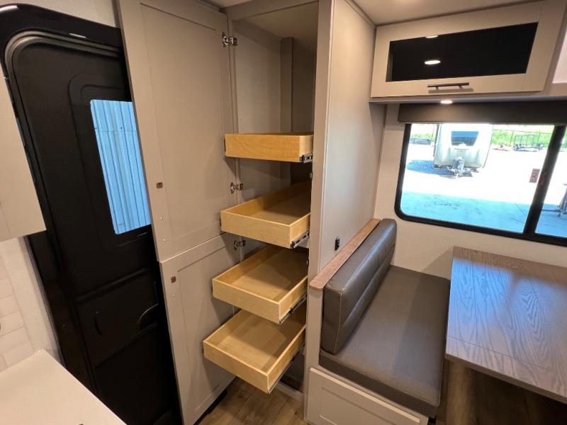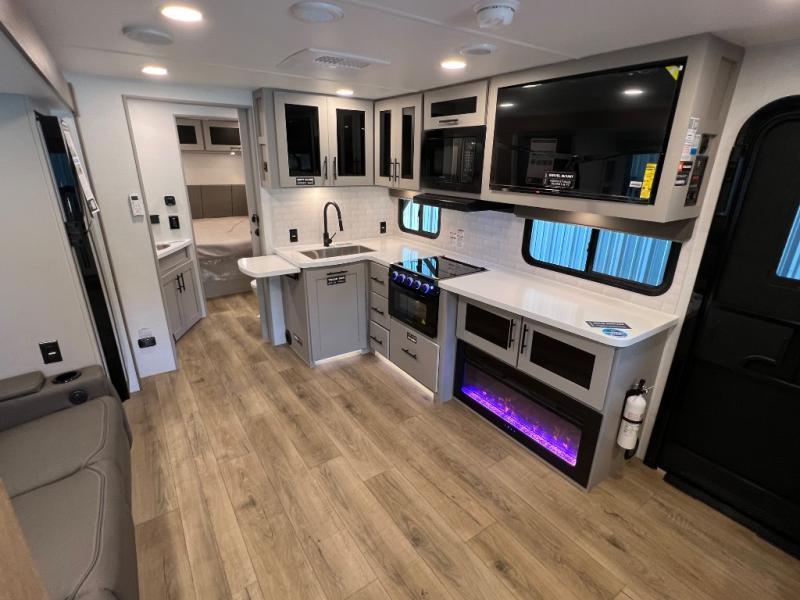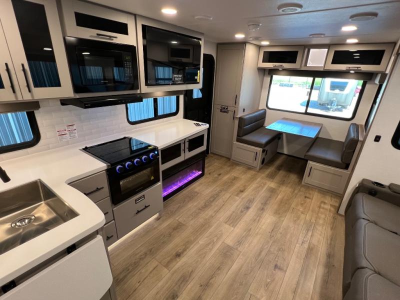 Grab your hiking boots and your sense of adventure for fun camping trips in this single slide out travel trailer. The rear booth dinette includes overhead storage for your things and the sofa slide out is in great view of the 40" HDTV. There is also a fireplace here that will make your space feel more like home plus more storage space, including an entryway pantry and storage above the 10 cu. ft. 12V refrigerator. A walk-through bath will take you to the front master bedroom with a queen bed, wardrobe nightstands, plus its own exterior entry door!