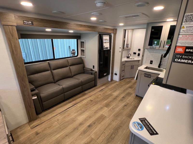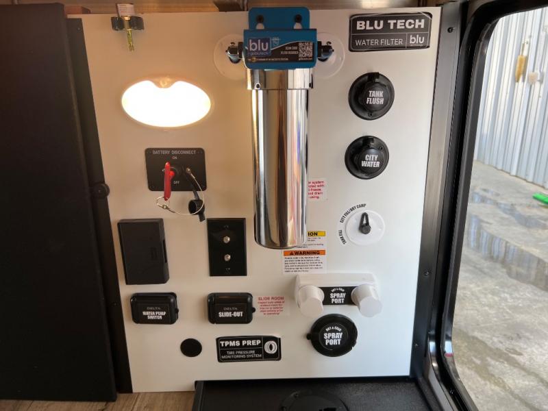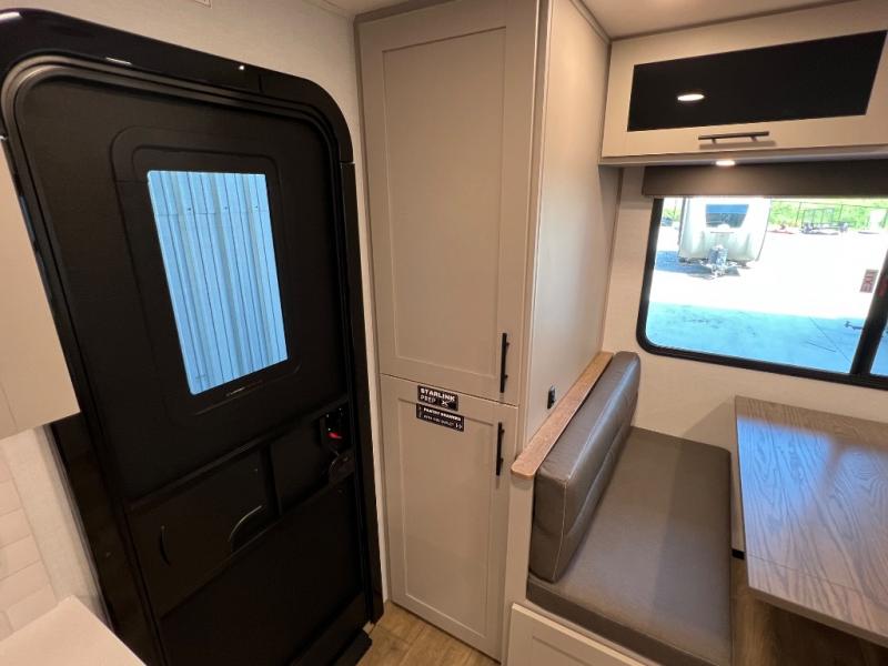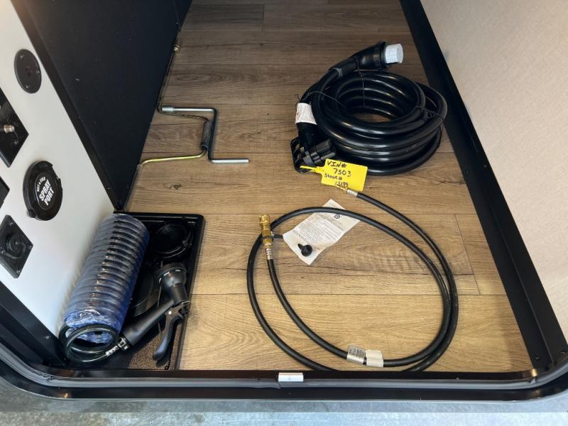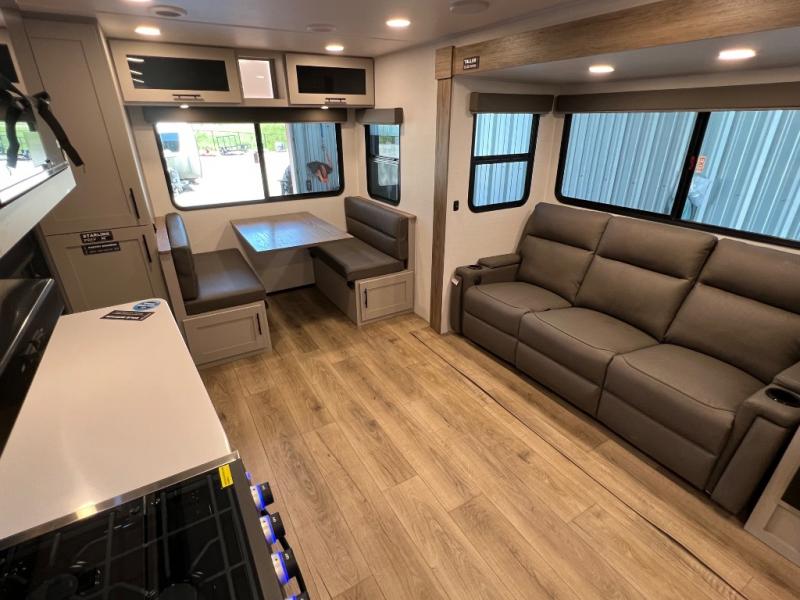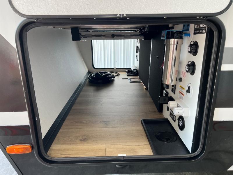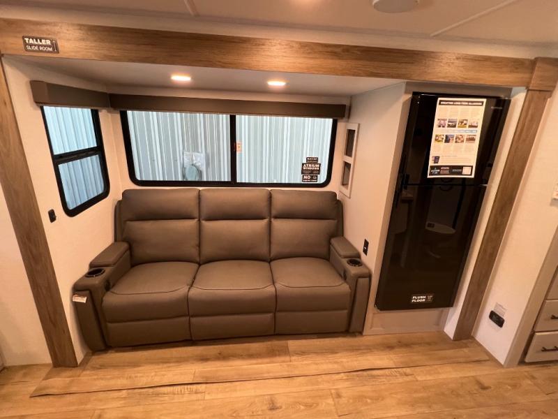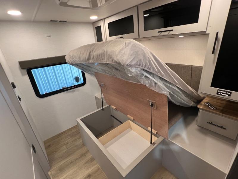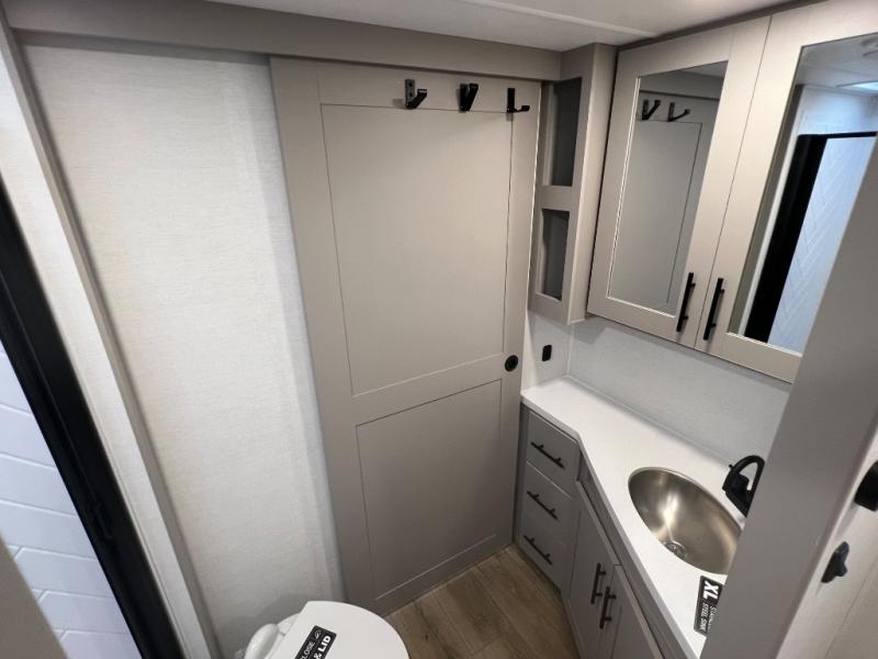 Grab your hiking boots and your sense of adventure for fun camping trips in this single slide out travel trailer. The rear booth dinette includes overhead storage for your things and the sofa slide out is in great view of the 40" HDTV. There is also a fireplace here that will make your space feel more like home plus more storage space, including an entryway pantry and storage above the 10 cu. ft. 12V refrigerator. A walk-through bath will take you to the front master bedroom with a queen bed, wardrobe nightstands, plus its own exterior entry door!