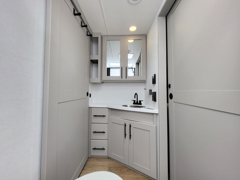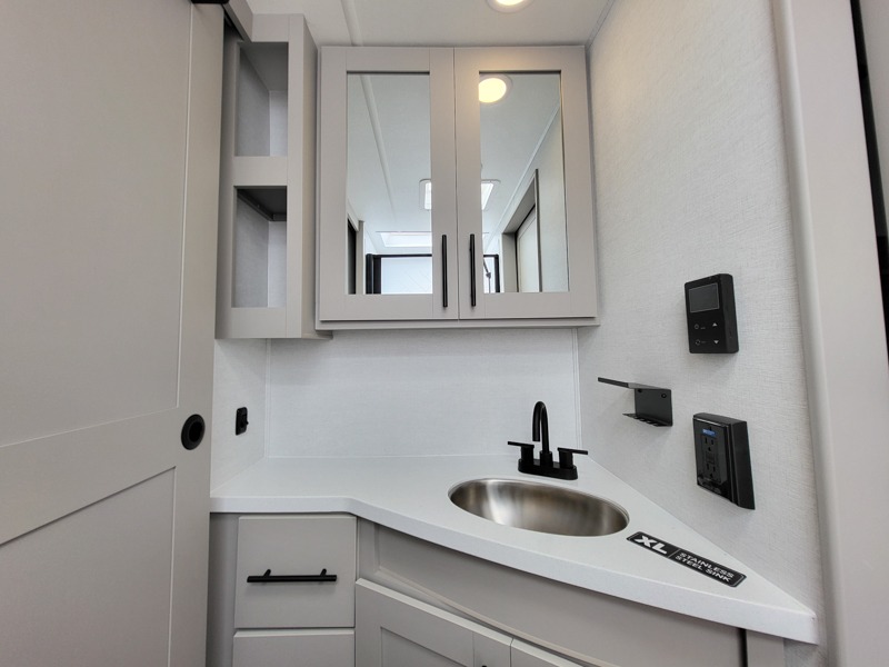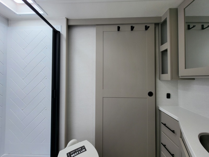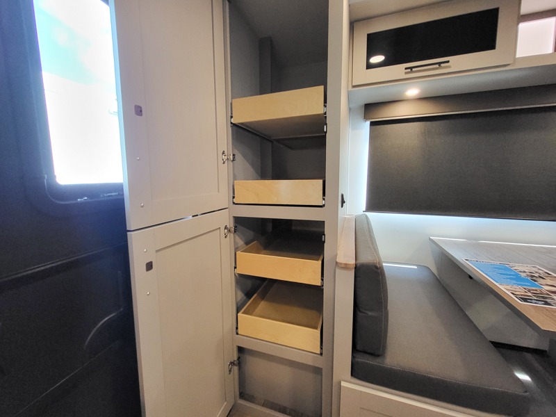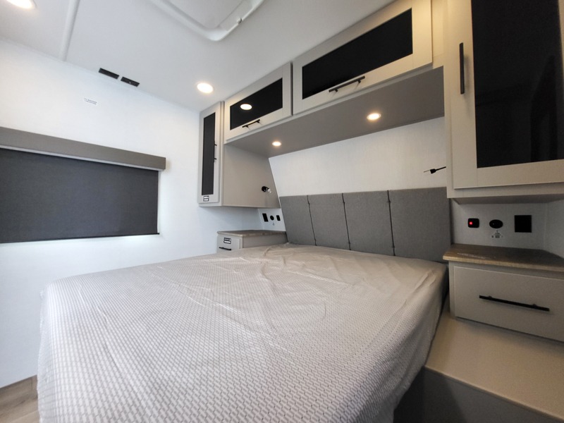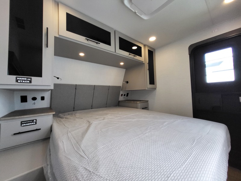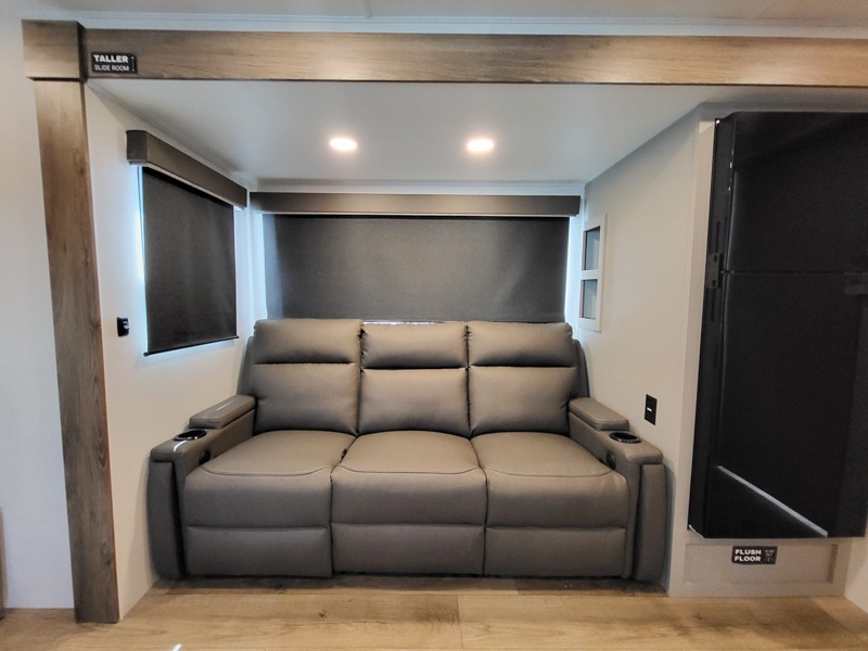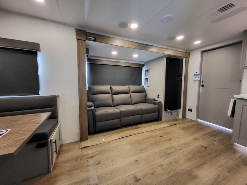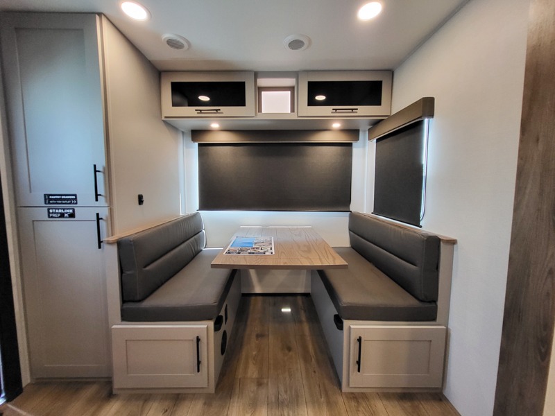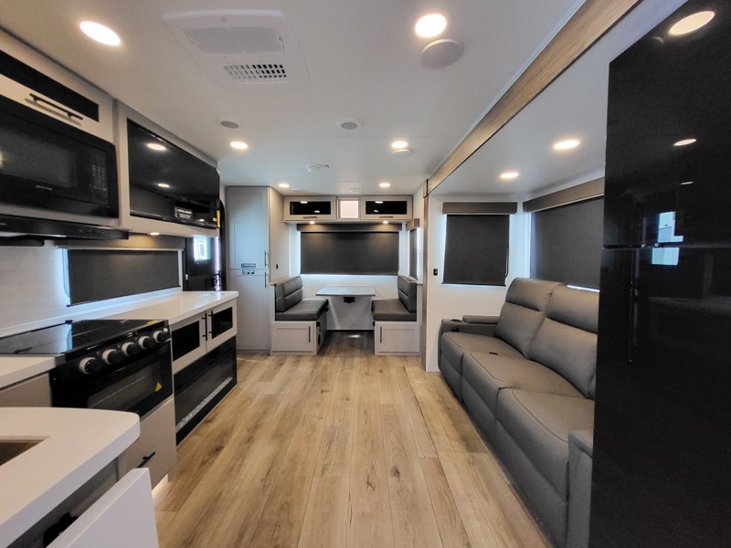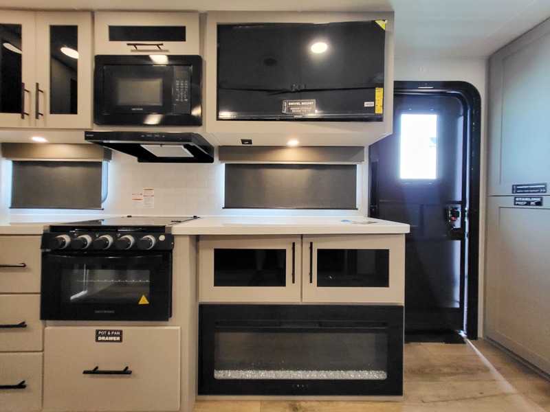 Grab your hiking boots and your sense of adventure for fun camping trips in this single slide out travel trailer. The rear booth dinette includes overhead storage for your things and the sofa slide out is in great view of the 40" HDTV. There is also a fireplace here that will make your space feel more like home plus more storage space, including an entryway pantry and storage above the 10 cu. ft. 12V refrigerator. A walk-through bath will take you to the front master bedroom with a queen bed, wardrobe nightstands, plus its own exterior entry door!