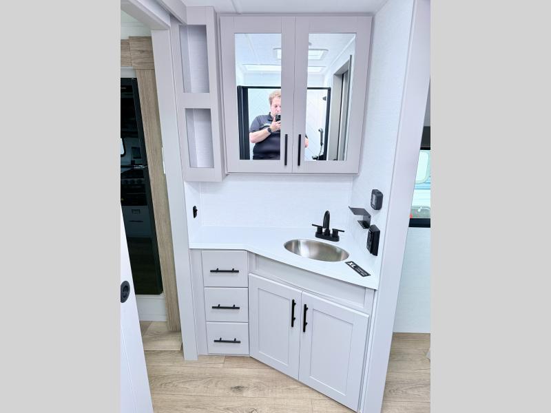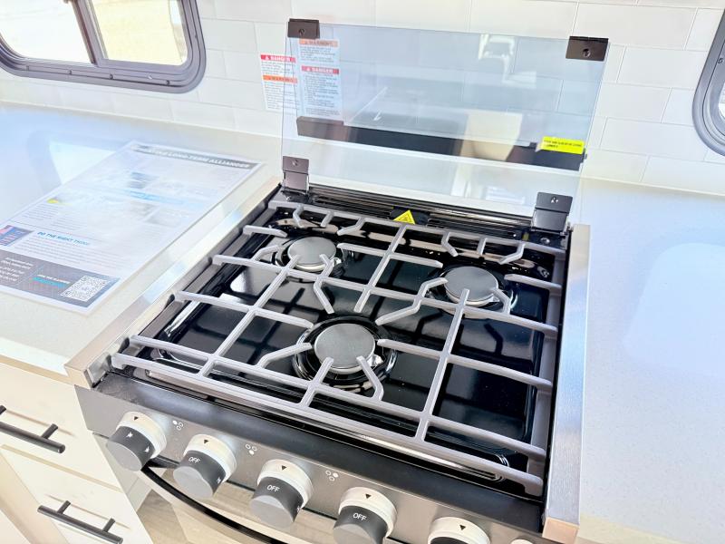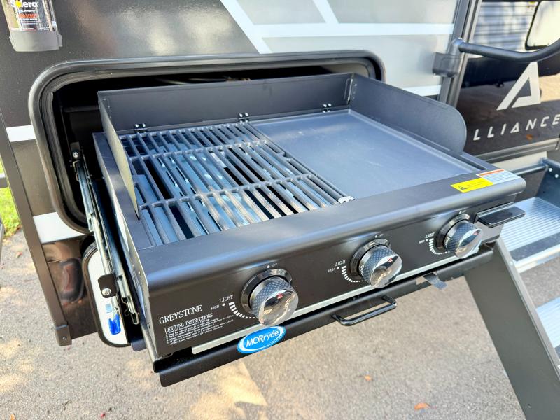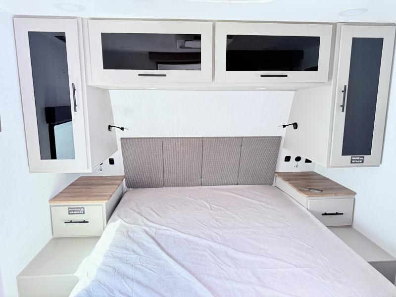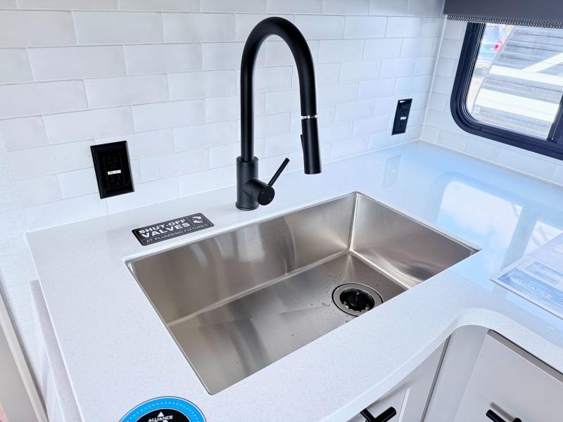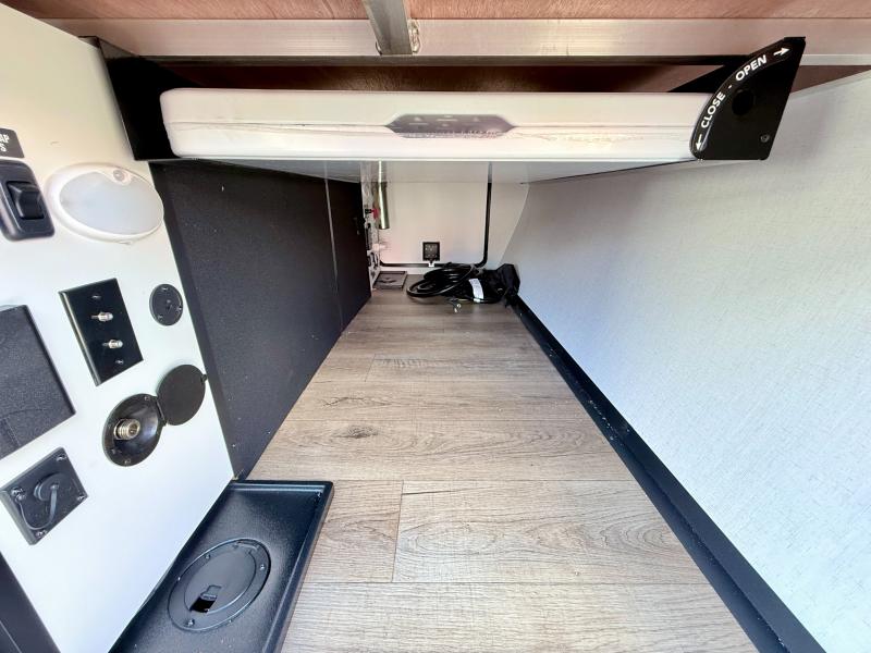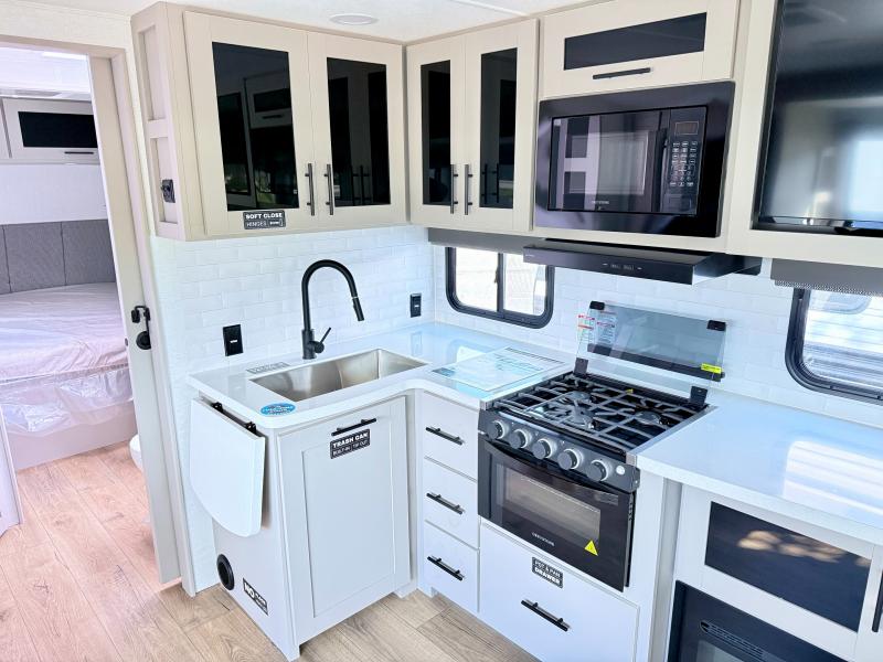 Convenient Camping Package: 62 cu. ft. drop-frame pass-through storage; exterior switches for slideout and awning control; dual convenience centers; full-size 6' camping table; multiple hot/cold spray ports; full-width oversized exterior ladder with built-in towel rack; USB charging in pass-through; hidden pull-out kitchen trash can; carpet-free interior; slide box exterior storage (most models); 12V heat pads on tanks; 2" accessory hitch; solid triple entry steps; easy-access water pump for winterization.
