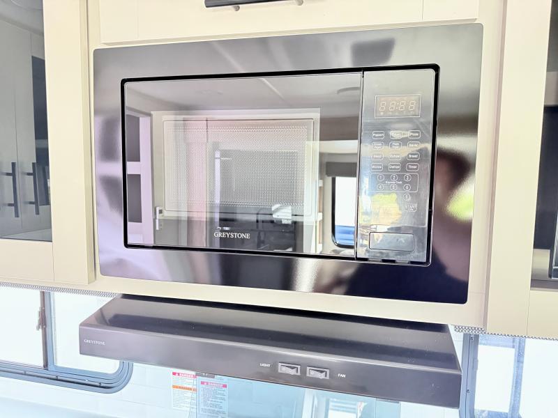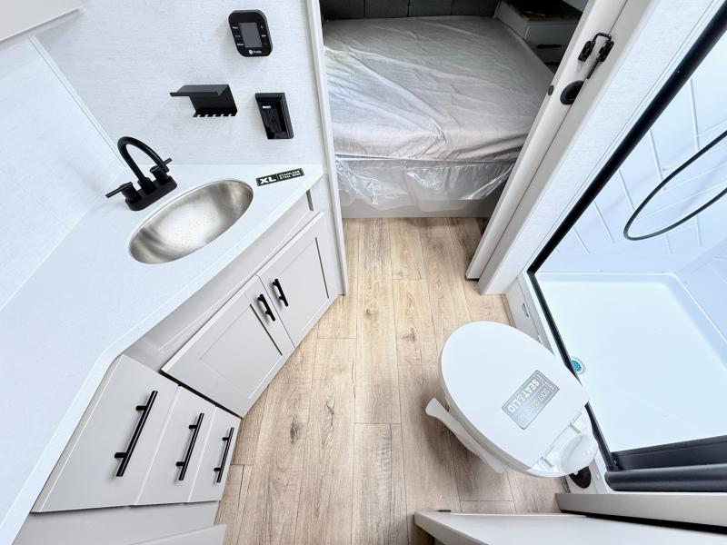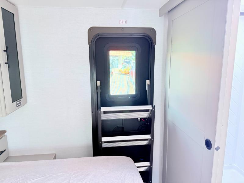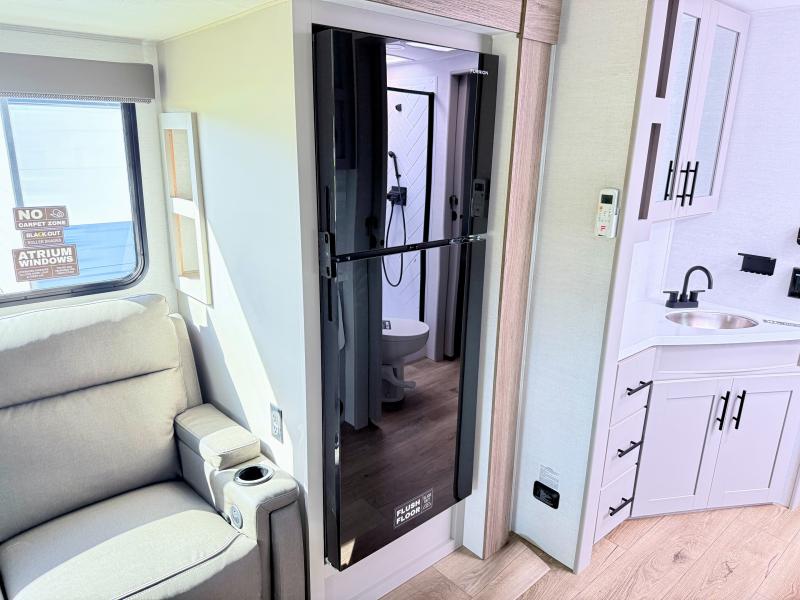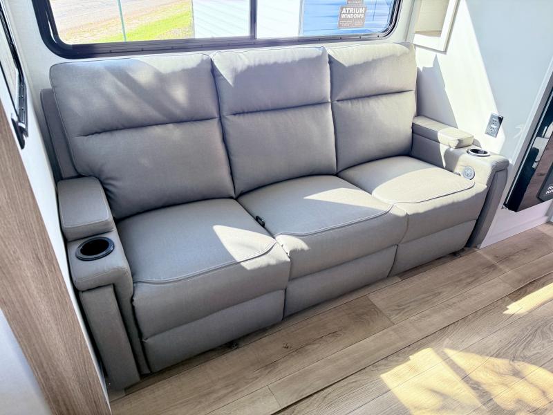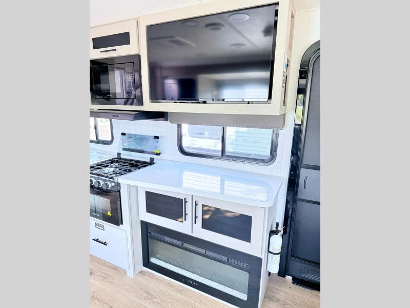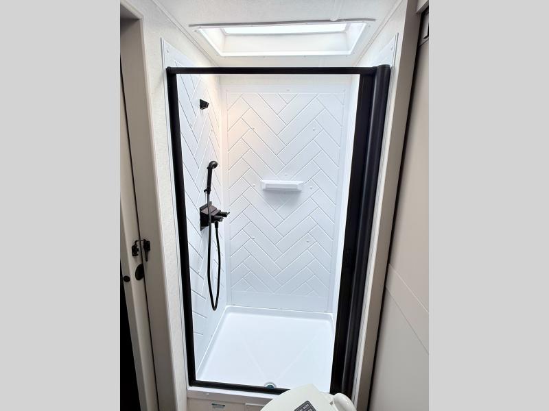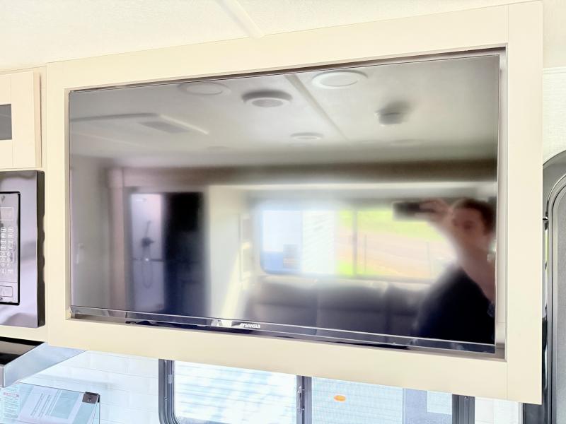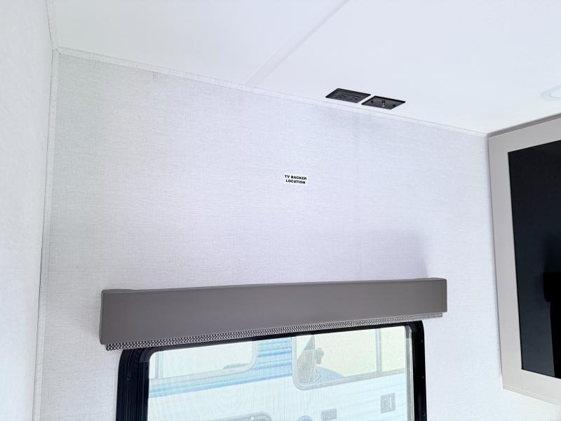 Independence Package: Goodyear Endurance tires on aluminum rims with spare tire and carrier; keyed-alike compartment doors; oversized atrium windows; Smart TV with swing arm; walk-on roof with seamless PVC covering; commercial-grade vinyl flooring; residential cabinet doors with magnetic catches and soft-close hidden hinges; porcelain toilet with foot flush; roller shades throughout; residential can-style LED ceiling lights; matte black cabinetry hardware; no in-floor heat vents; Mylar-reinforced exterior seals; LP quick connect; heated and enclosed underbelly; black tank flush; pre-wired for backup camera; Bluetooth speaker; tire monitor prep; color-coded and numbered wiring; shut-off valves at major plumbing locations; slide topper prep; Starlink prep; USB charge ports throughout.