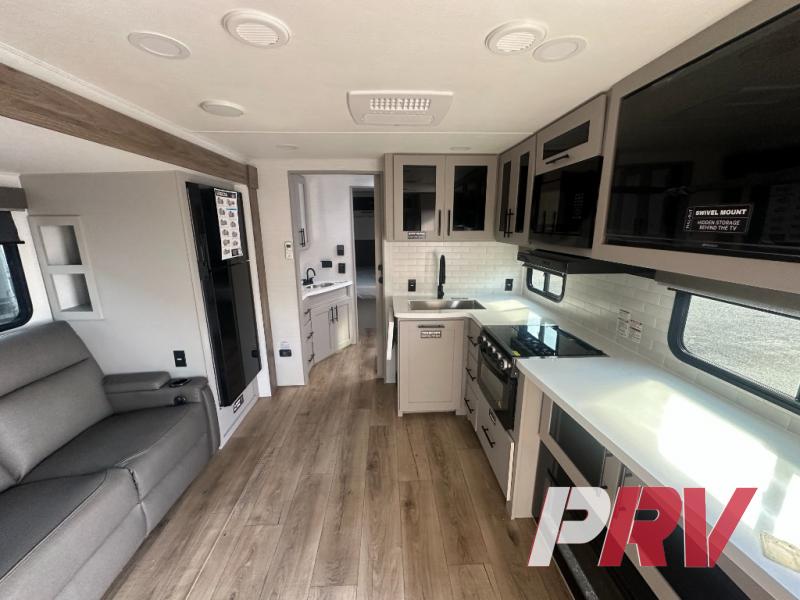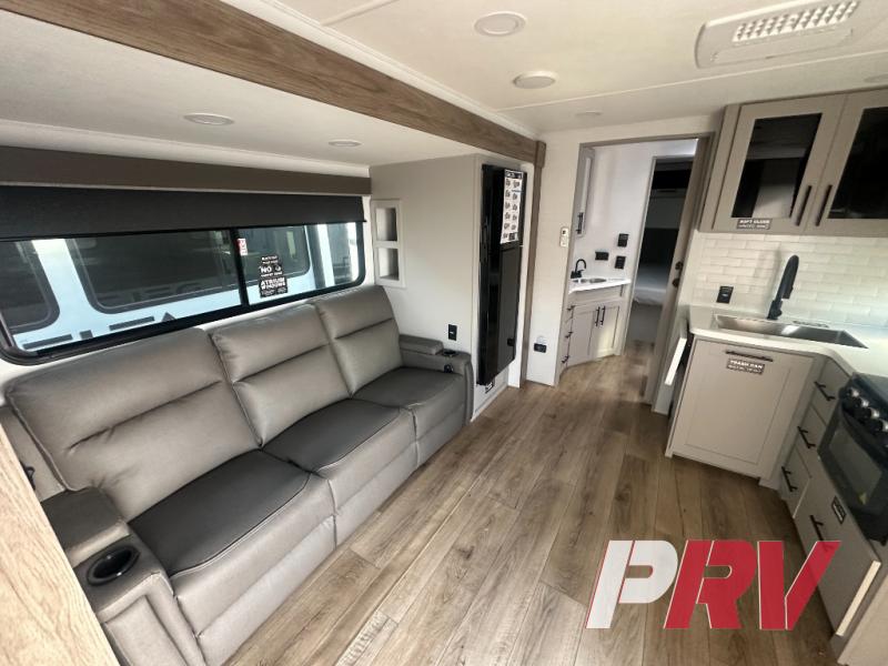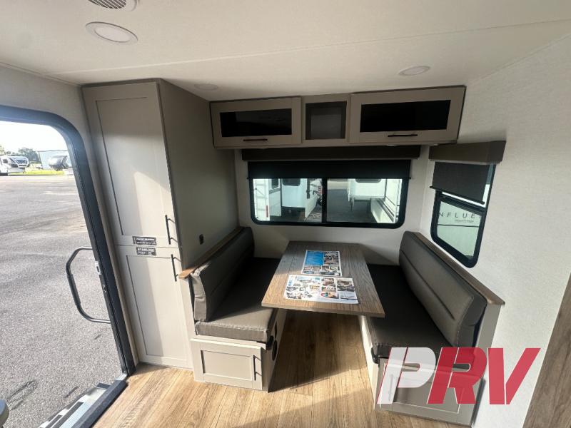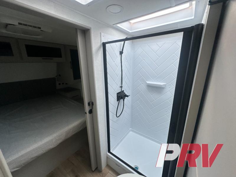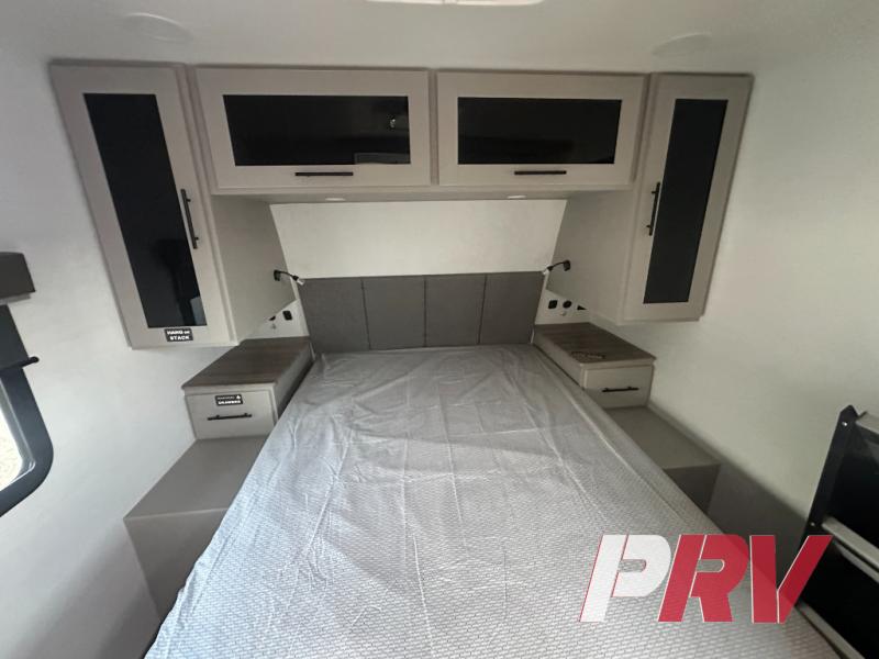 Grab your hiking boots and your sense of adventure for fun camping trips in this single slide out travel trailer. The rear booth dinette includes overhead storage for your things and the sofa slide out is in great view of the 40" HDTV. There is also a fireplace here that will make your space feel more like home plus more storage space, including an entryway pantry and storage above the 10 cu. ft. 12V refrigerator. A walk-through bath will take you to the front master bedroom with a queen bed, wardrobe nightstands, plus its own exterior entry door!