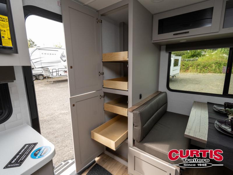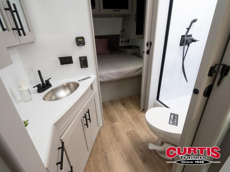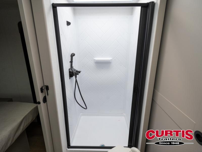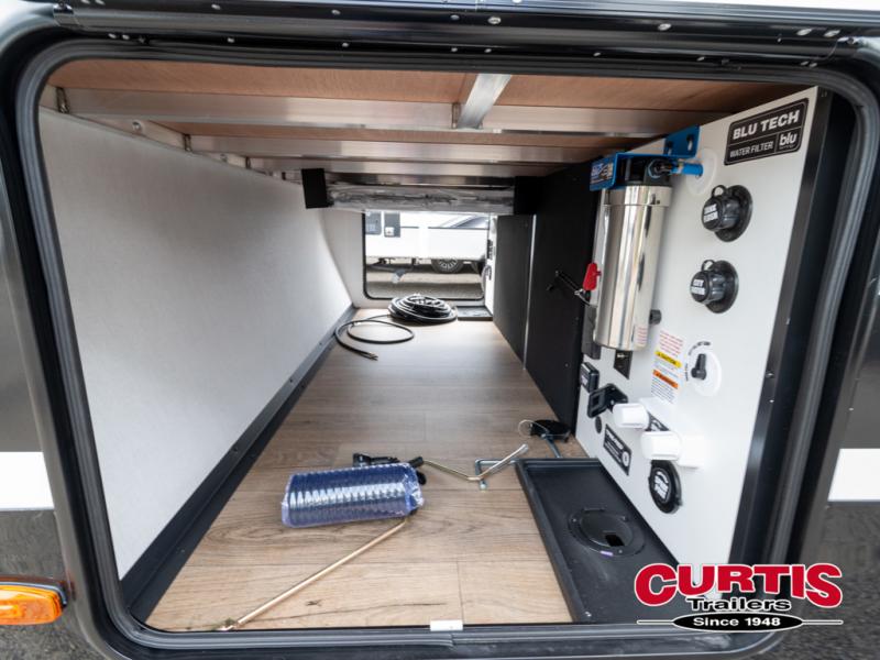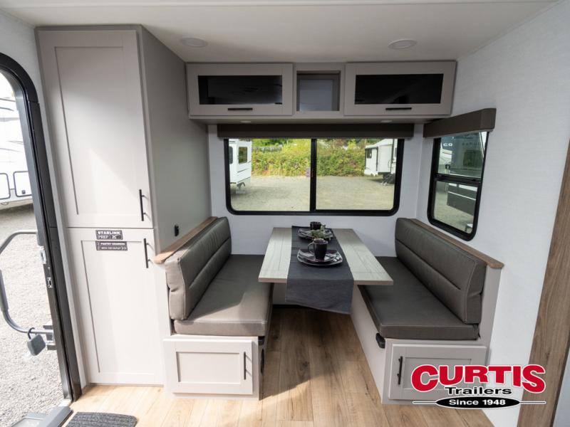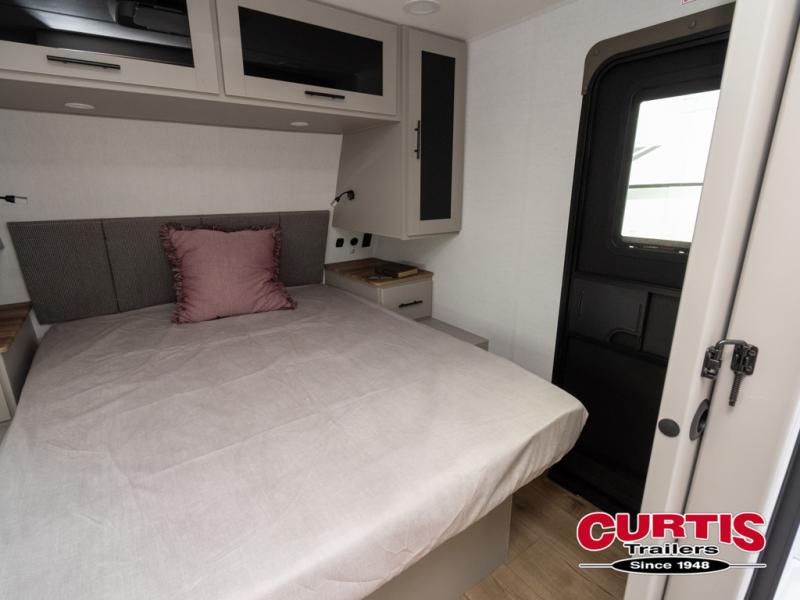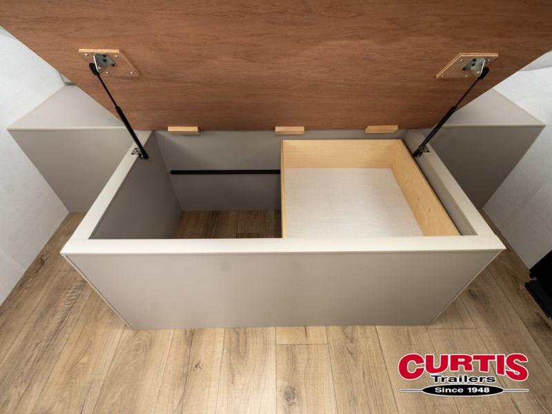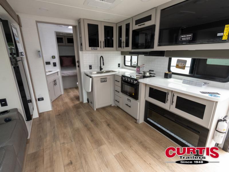 Grab your hiking boots and your sense of adventure for fun camping trips in this single slide out travel trailer. The rear booth dinette includes overhead storage for your things and the sofa slide out is in great view of the 40" HDTV. There is also a fireplace here that will make your space feel more like home plus more storage space, including an entryway pantry and storage above the 10 cu. ft. 12V refrigerator. A walk-through bath will take you to the front master bedroom with a queen bed, wardrobe nightstands, plus its own exterior entry door!