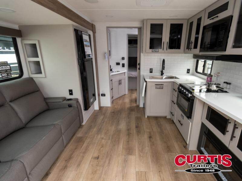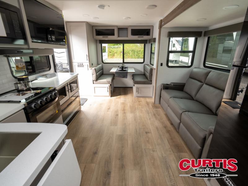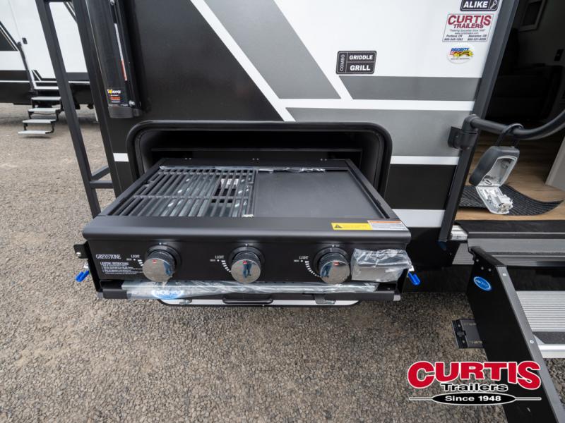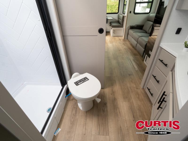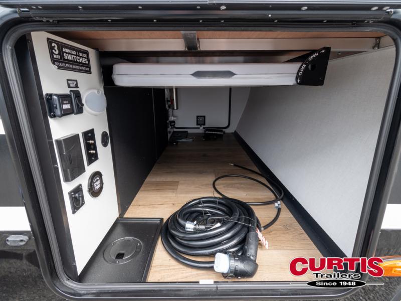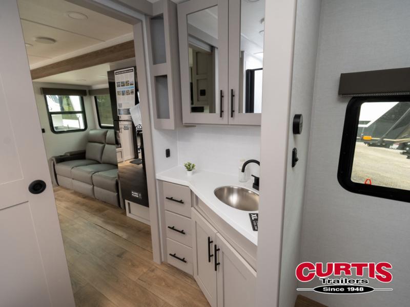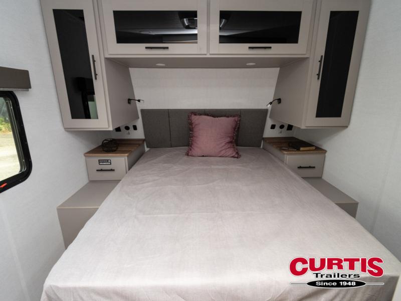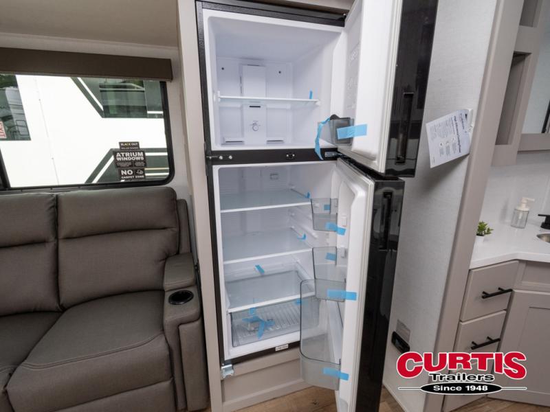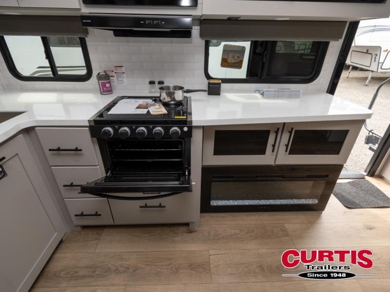Grab your hiking boots and your sense of adventure for fun camping trips in this single slide out travel trailer. The rear booth dinette includes overhead storage for your things and the sofa slide out is in great view of the 40" HDTV. There is also a fireplace here that will make your space feel more like home plus more storage space, including an entryway pantry and storage above the 10 cu. ft. 12V refrigerator. A walk-through bath will take you to the front master bedroom with a queen bed, wardrobe nightstands, plus its own exterior entry door!