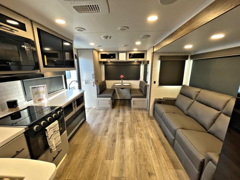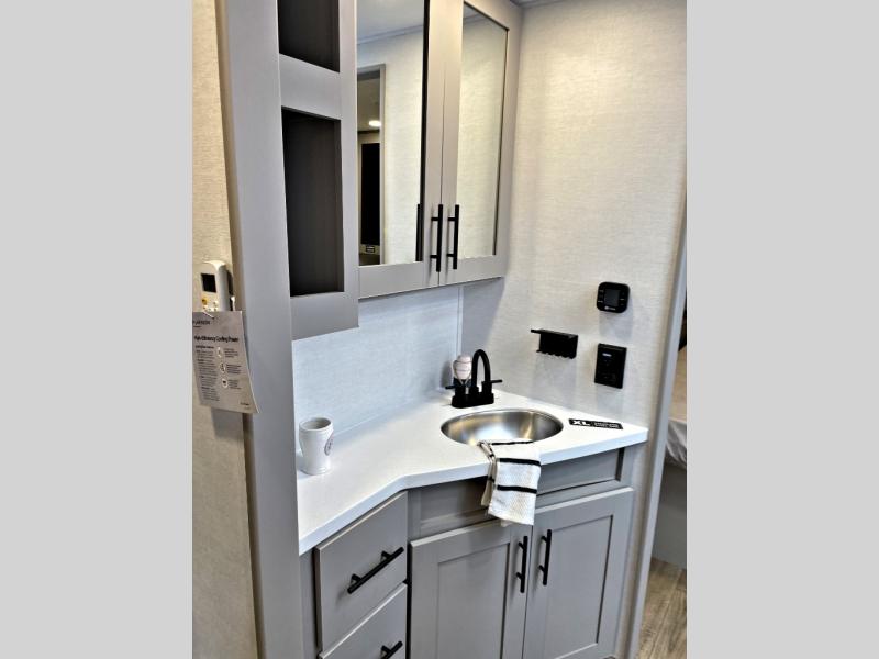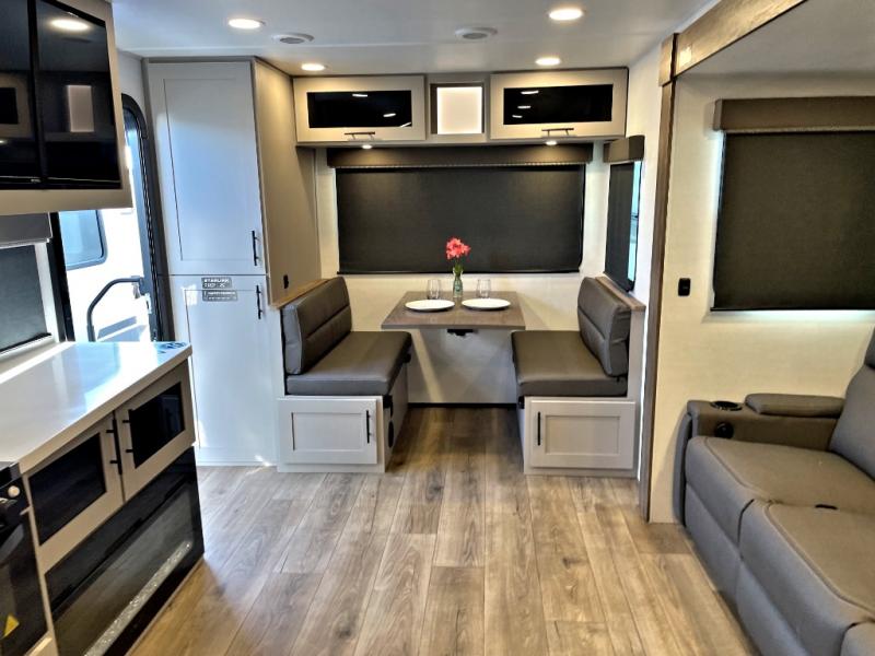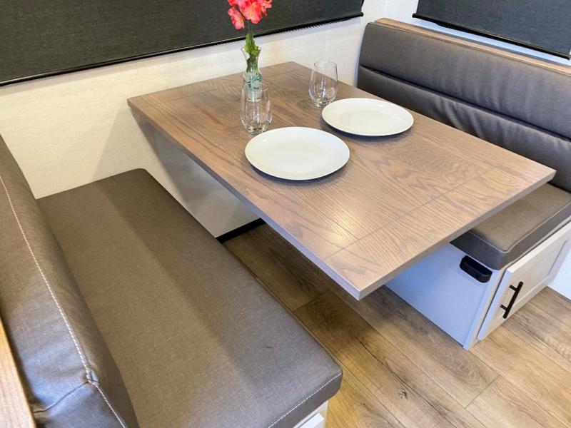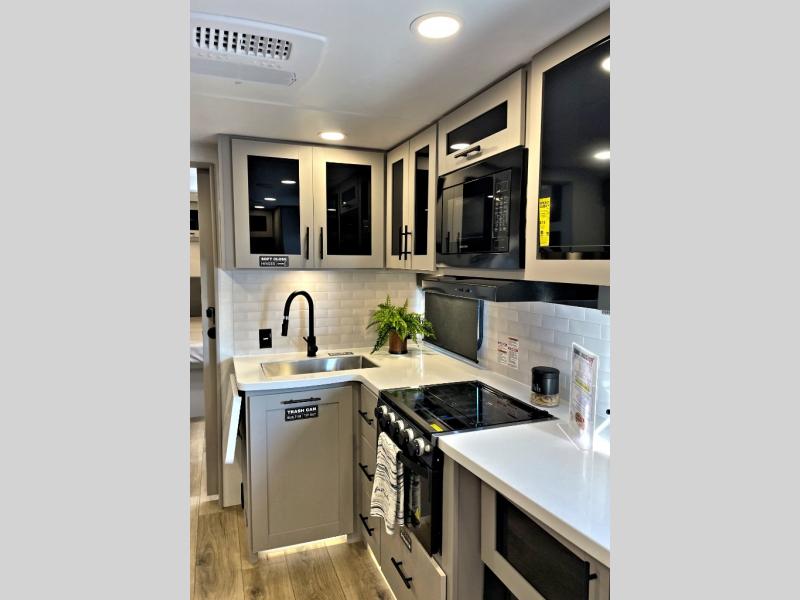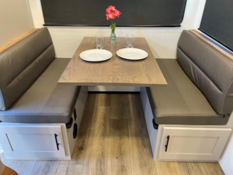 Grab your hiking boots and your sense of adventure for fun camping trips in this single slide out travel trailer. The rear booth dinette includes overhead storage for your things and the sofa slide out is in great view of the 40" HDTV. There is also a fireplace here that will make your space feel more like home plus more storage space, including an entryway pantry and storage above the 10 cu. ft. 12V refrigerator. A walk-through bath will take you to the front master bedroom with a queen bed, wardrobe nightstands, plus its own exterior entry door!