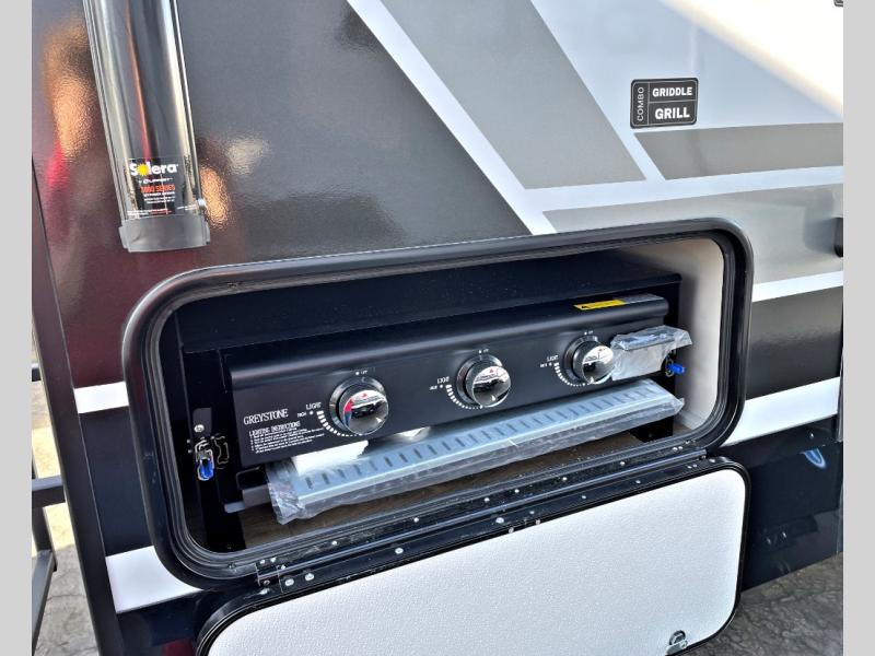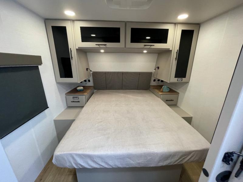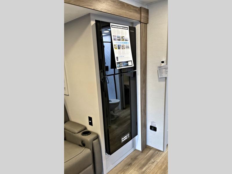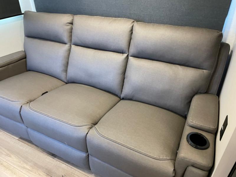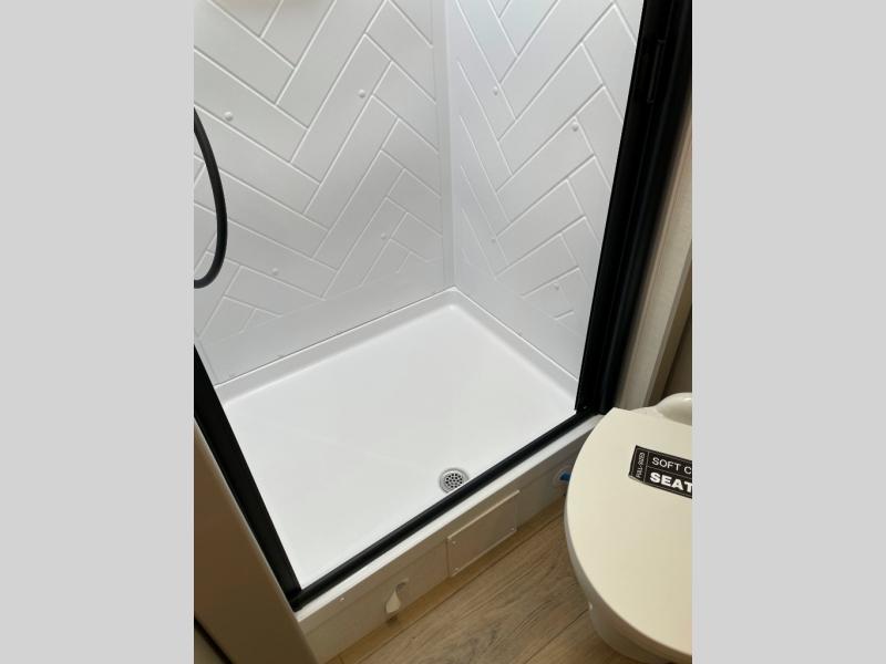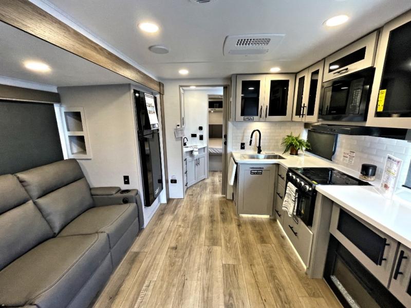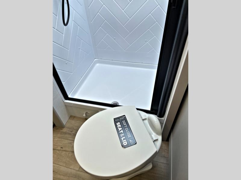 Grab your hiking boots and your sense of adventure for fun camping trips in this single slide out travel trailer. The rear booth dinette includes overhead storage for your things and the sofa slide out is in great view of the 40" HDTV. There is also a fireplace here that will make your space feel more like home plus more storage space, including an entryway pantry and storage above the 10 cu. ft. 12V refrigerator. A walk-through bath will take you to the front master bedroom with a queen bed, wardrobe nightstands, plus its own exterior entry door!