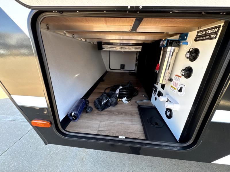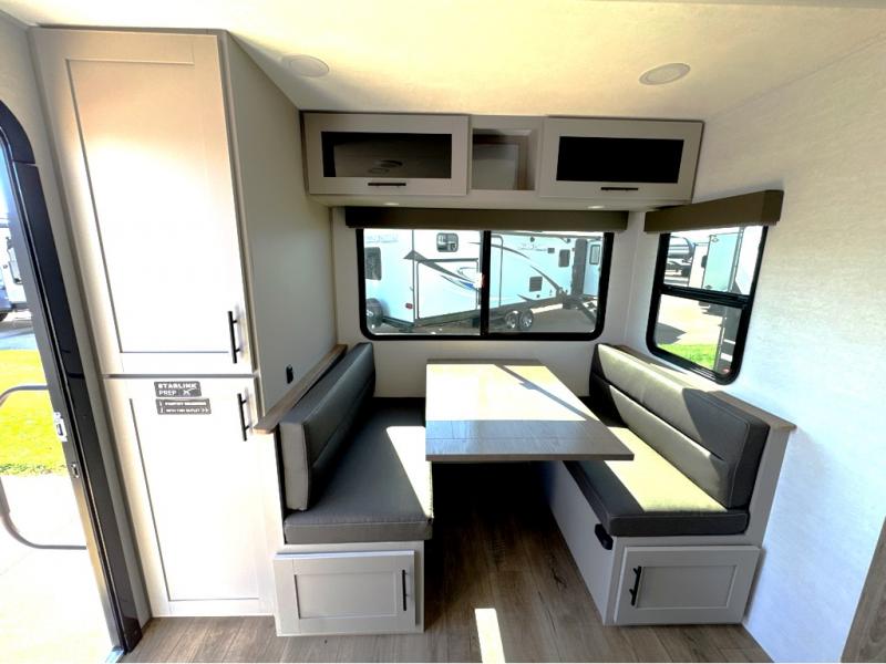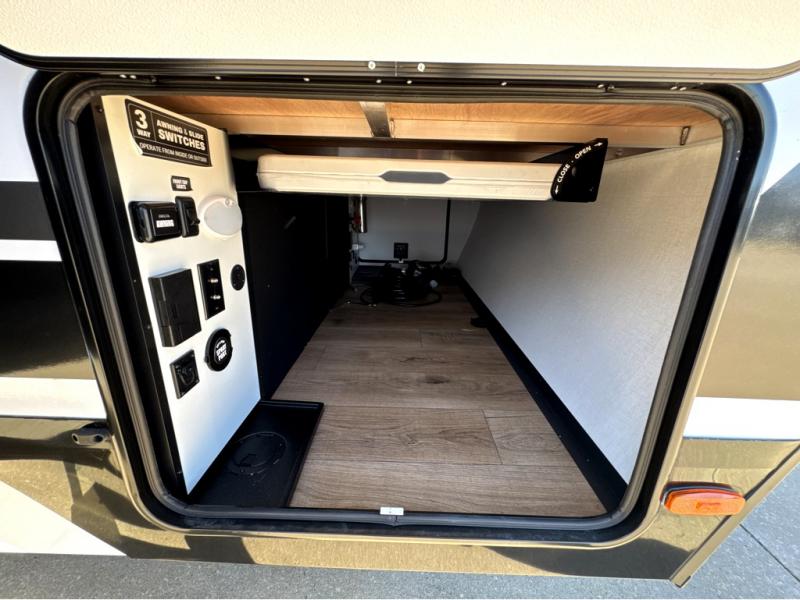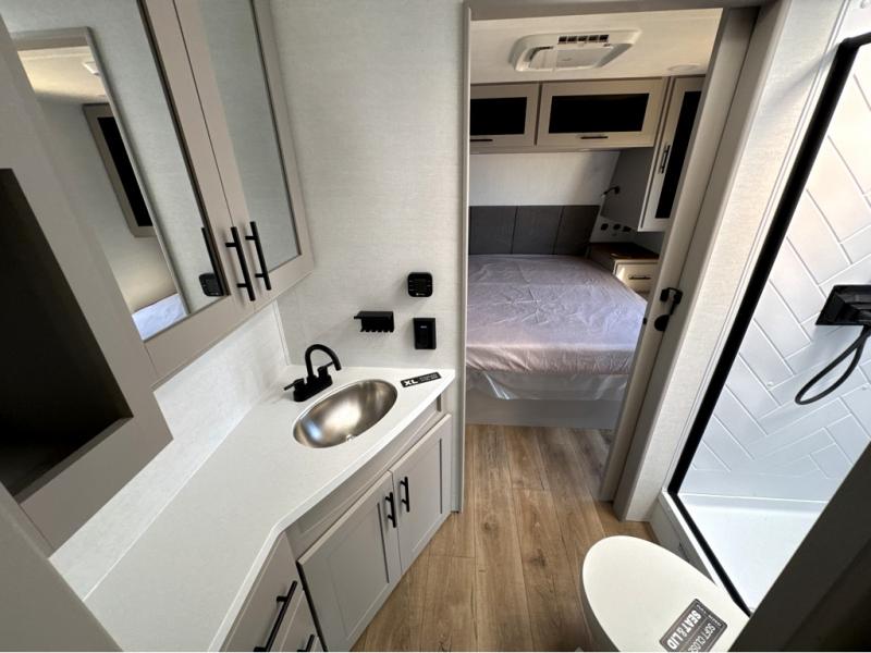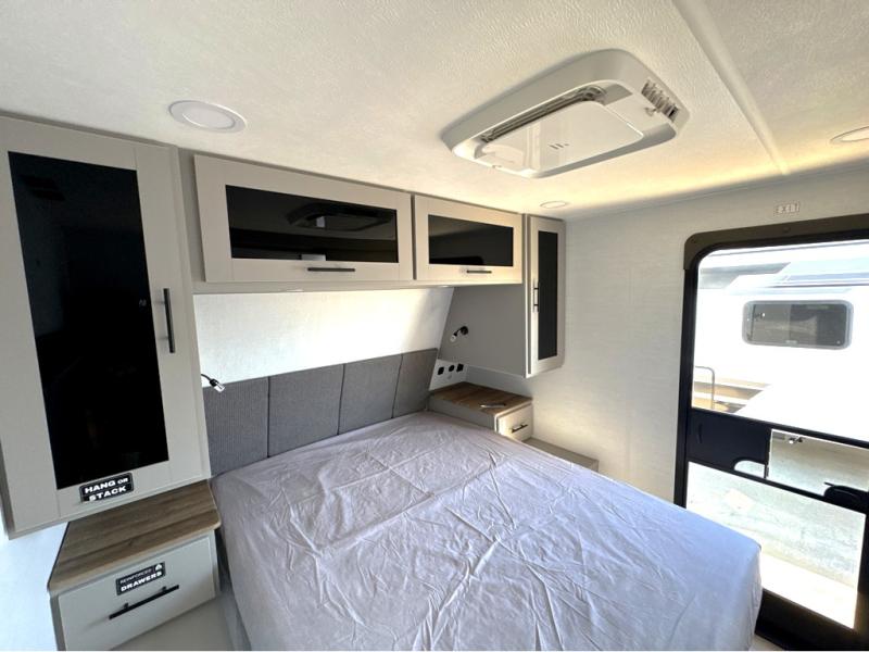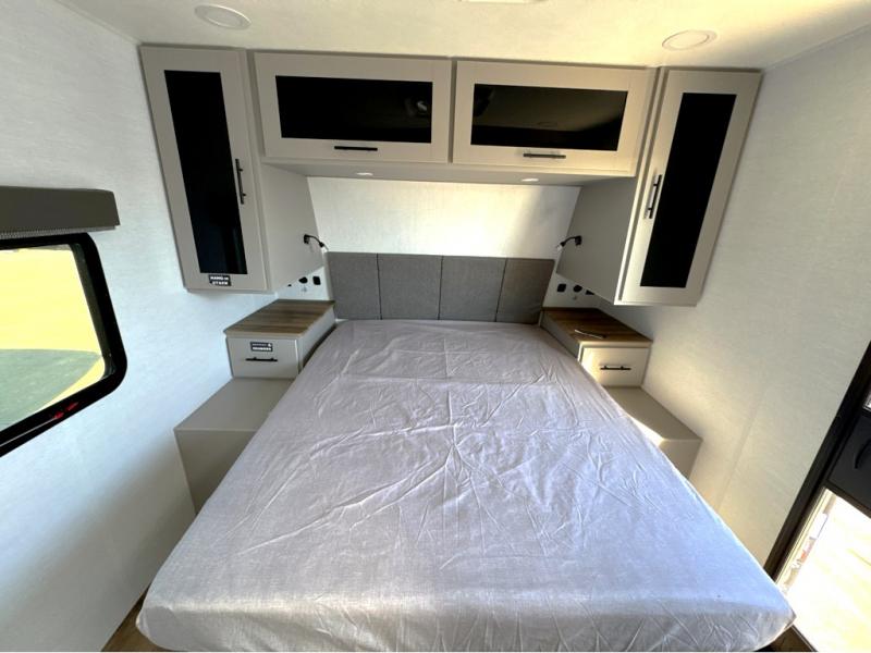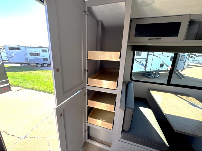 Grab your hiking boots and your sense of adventure for fun camping trips in this single slide out travel trailer. The rear booth dinette includes overhead storage for your things and the sofa slide out is in great view of the 40" HDTV. There is also a fireplace here that will make your space feel more like home plus more storage space, including an entryway pantry and storage above the 10 cu. ft. 12V refrigerator. A walk-through bath will take you to the front master bedroom with a queen bed, wardrobe nightstands, plus its own exterior entry door!
