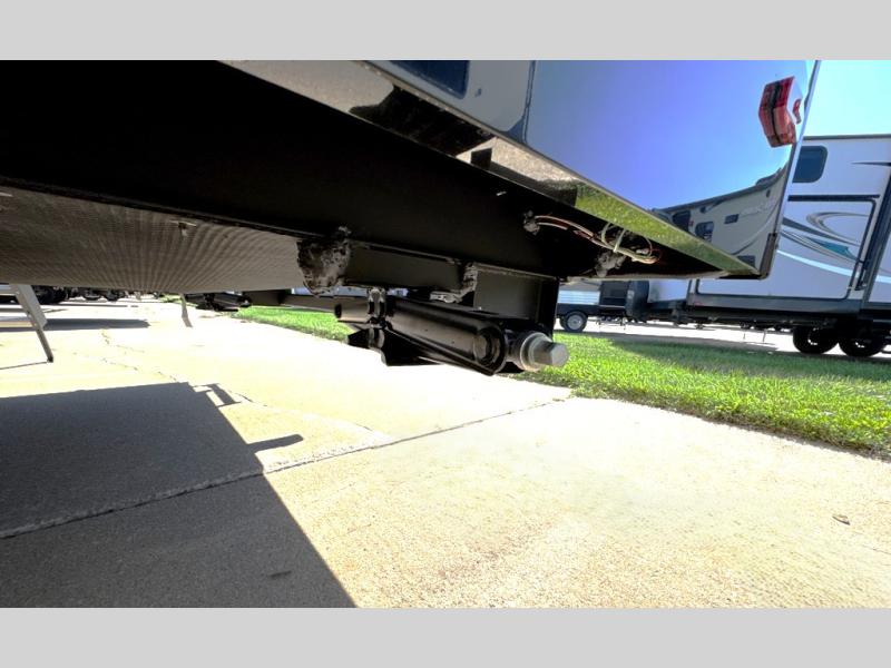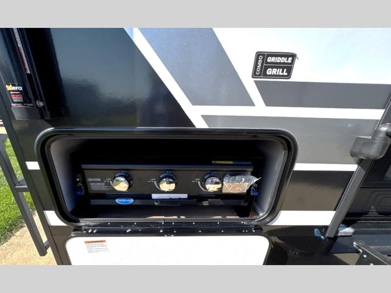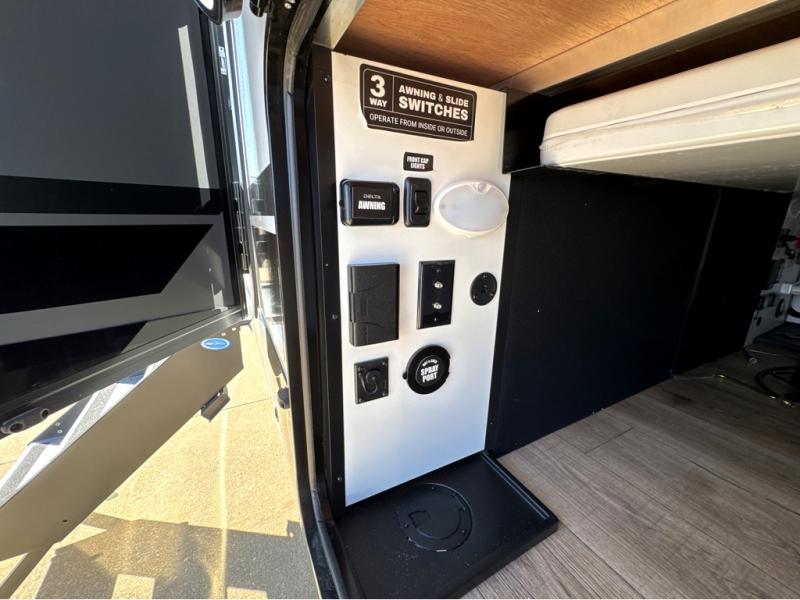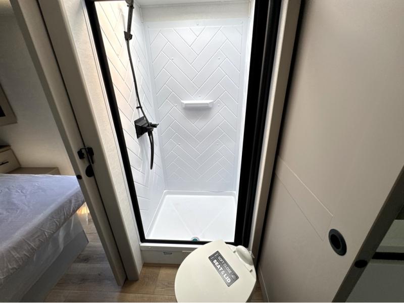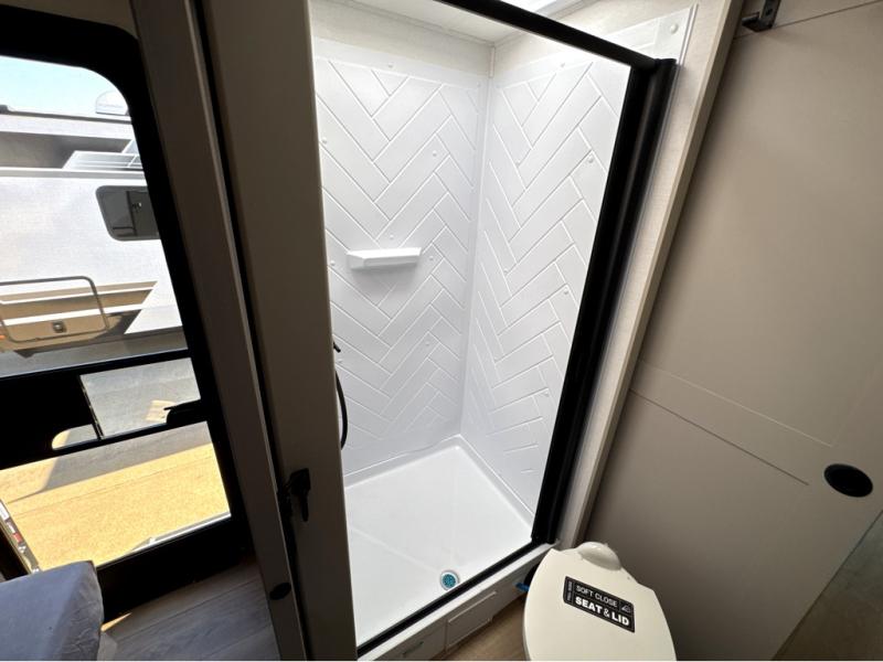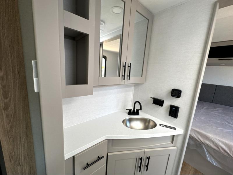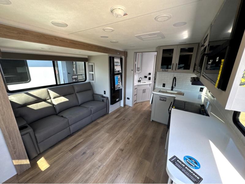 Grab your hiking boots and your sense of adventure for fun camping trips in this single slide out travel trailer. The rear booth dinette includes overhead storage for your things and the sofa slide out is in great view of the 40" HDTV. There is also a fireplace here that will make your space feel more like home plus more storage space, including an entryway pantry and storage above the 10 cu. ft. 12V refrigerator. A walk-through bath will take you to the front master bedroom with a queen bed, wardrobe nightstands, plus its own exterior entry door!