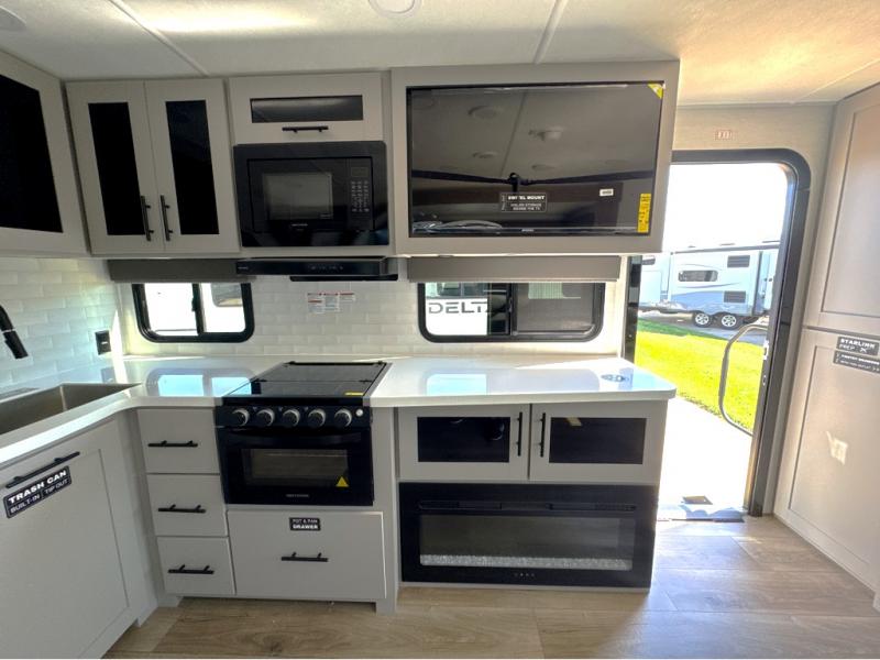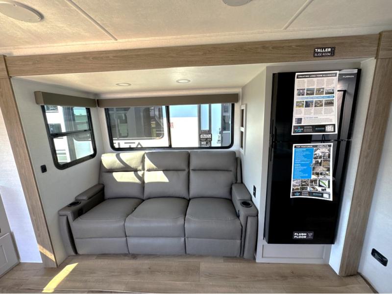Form and function works together with every one of these Alliance RV Delta travel trailers! They are built with a walk-on roof with a seamless PVC roof covering, Mylar reinforced exterior seals, and a heated and enclosed underbelly to protect your unit in all seasons. The commercial grade vinyl flooring will be easy to clean and the oversized atrium windows throughout let in plenty of natural sunlight. With 62 cu. ft. of drop frame pass-through storage, you can bring along all of your essential camping gear plus it has USB charging for more convenience. There are many at home interior conveniences including a Bluetooth speaker, USB charging throughout, and even a pull-out kitchen trash can. Come find your favorite model today!
