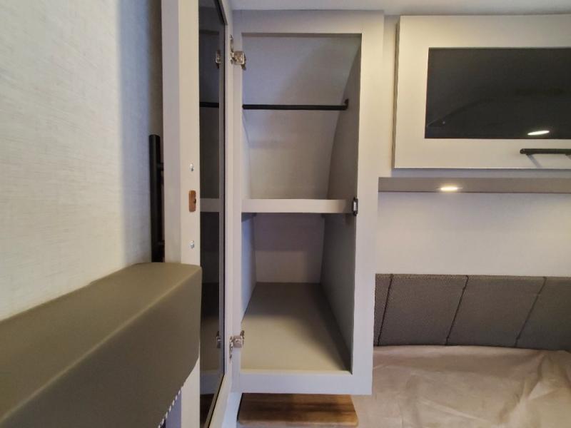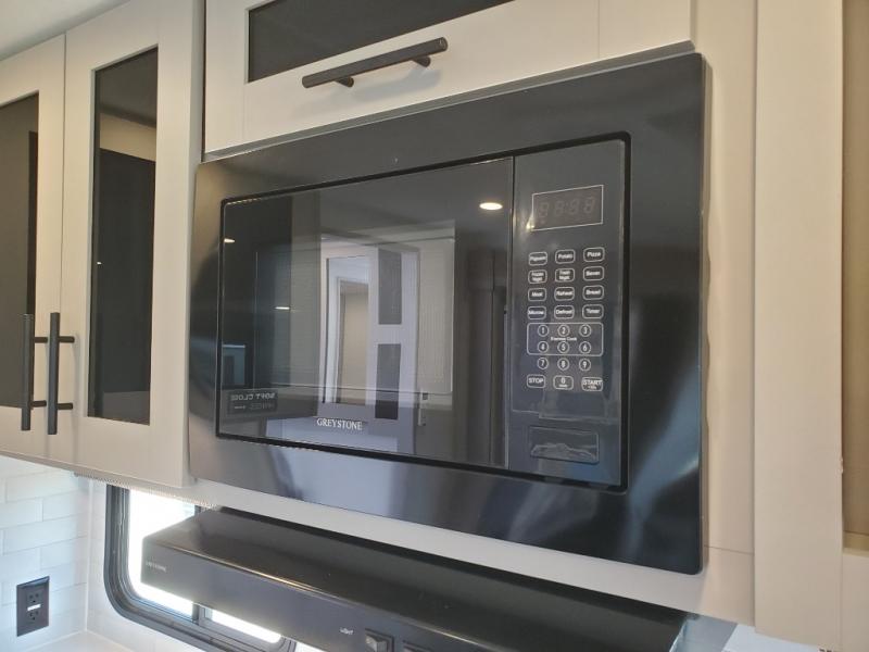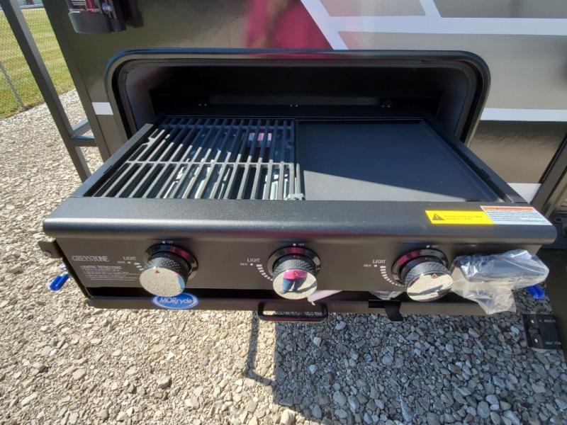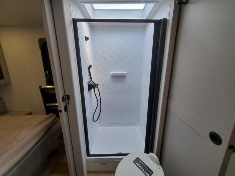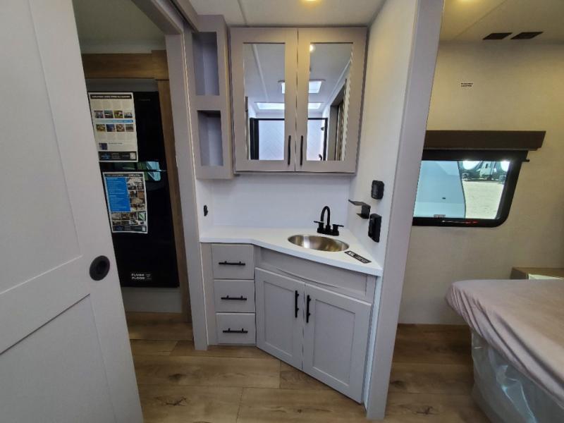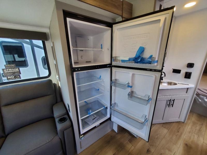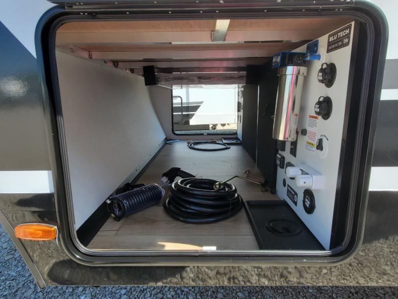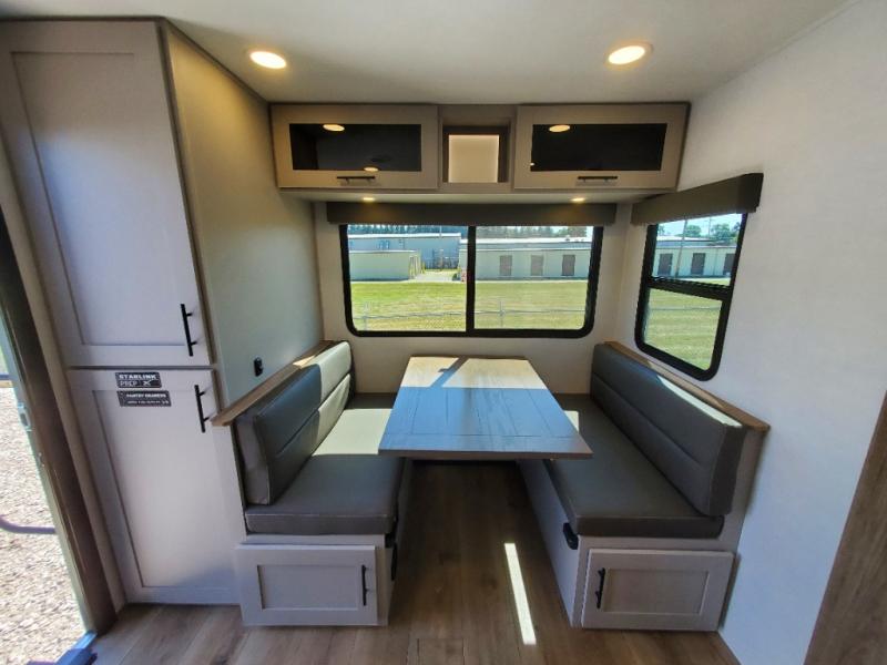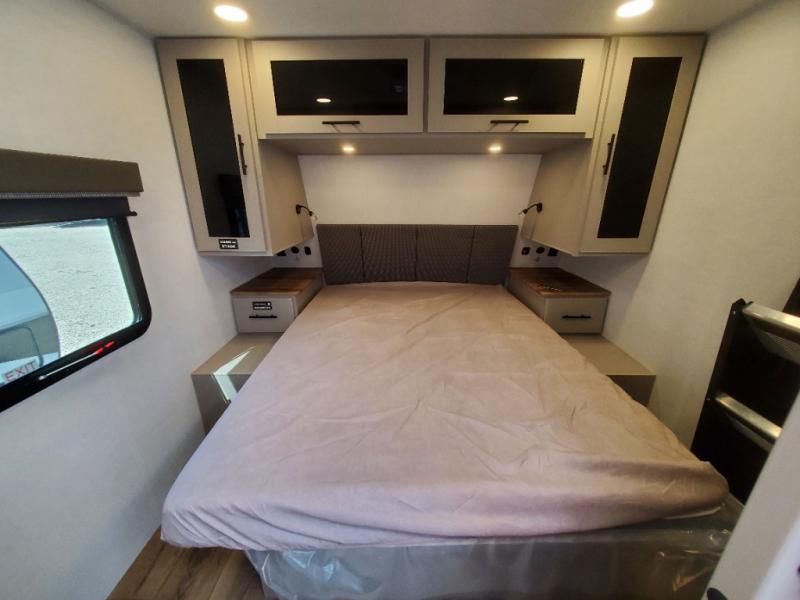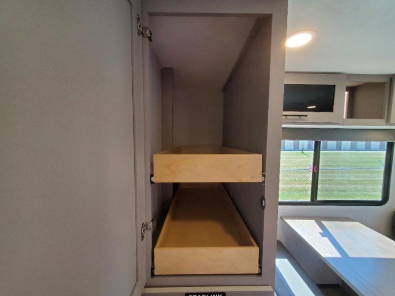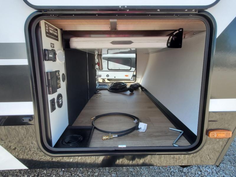 Grab your hiking boots and your sense of adventure for fun camping trips in this single slide out travel trailer. The rear booth dinette includes overhead storage for your things and the sofa slide out is in great view of the 40" HDTV. There is also a fireplace here that will make your space feel more like home plus more storage space, including an entryway pantry and storage above the 10 cu. ft. 12V refrigerator. A walk-through bath will take you to the front master bedroom with a queen bed, wardrobe nightstands, plus its own exterior entry door!