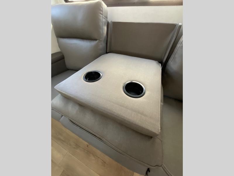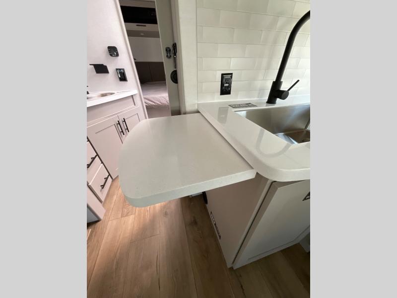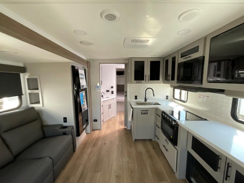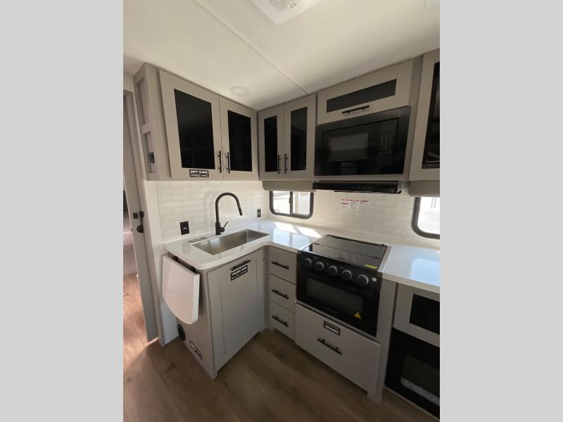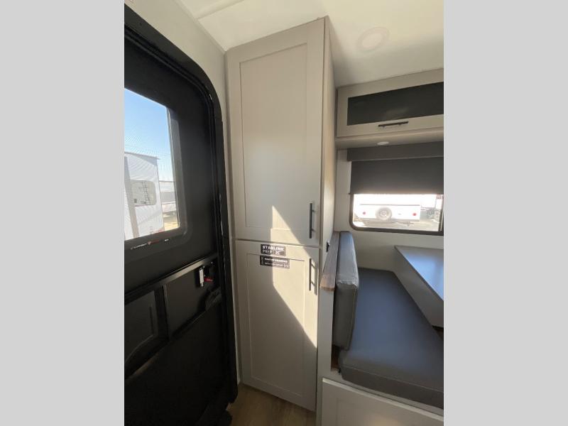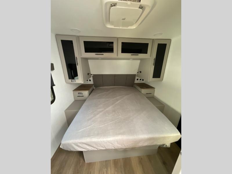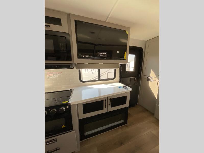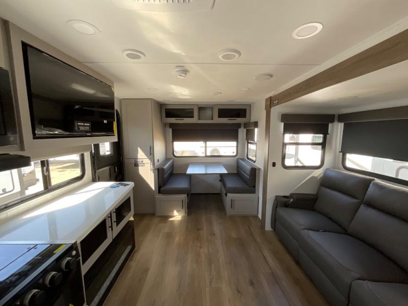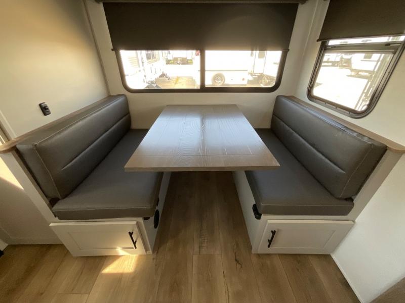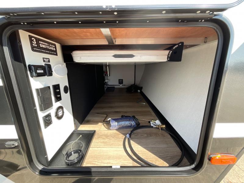 Grab your hiking boots and your sense of adventure for fun camping trips in this single slide out travel trailer. The rear booth dinette includes overhead storage for your things and the sofa slide out is in great view of the 40" HDTV. There is also a fireplace here that will make your space feel more like home plus more storage space, including an entryway pantry and storage above the 10 cu. ft. 12V refrigerator. A walk-through bath will take you to the front master bedroom with a queen bed, wardrobe nightstands, plus its own exterior entry door!