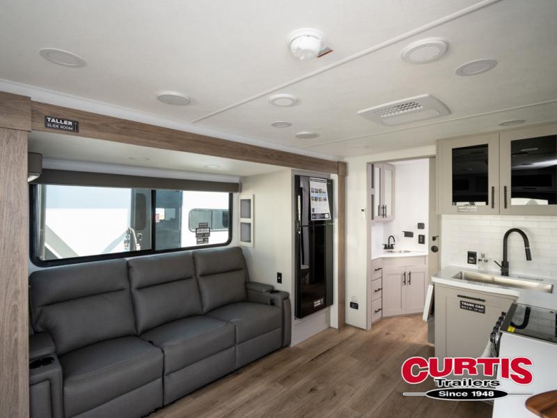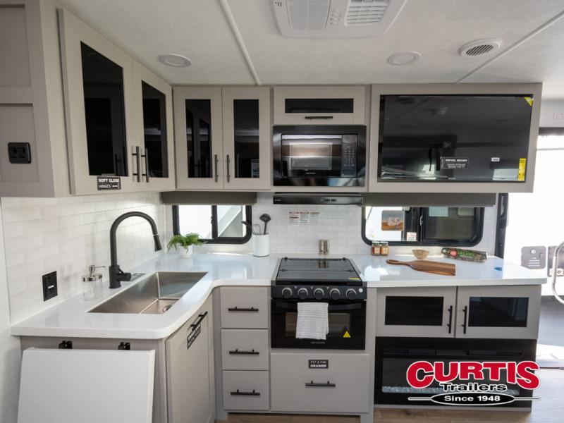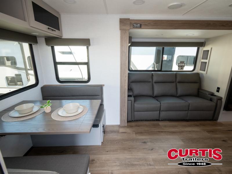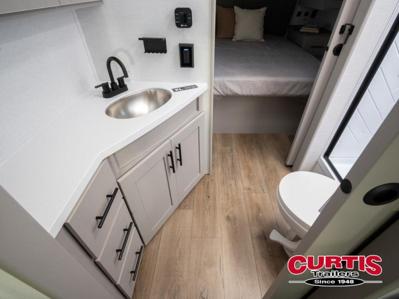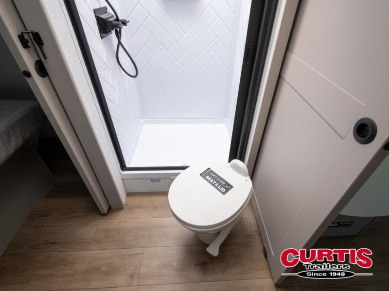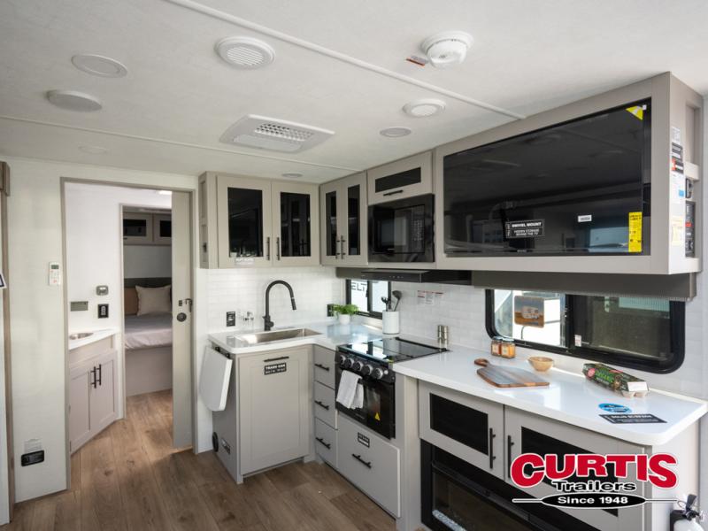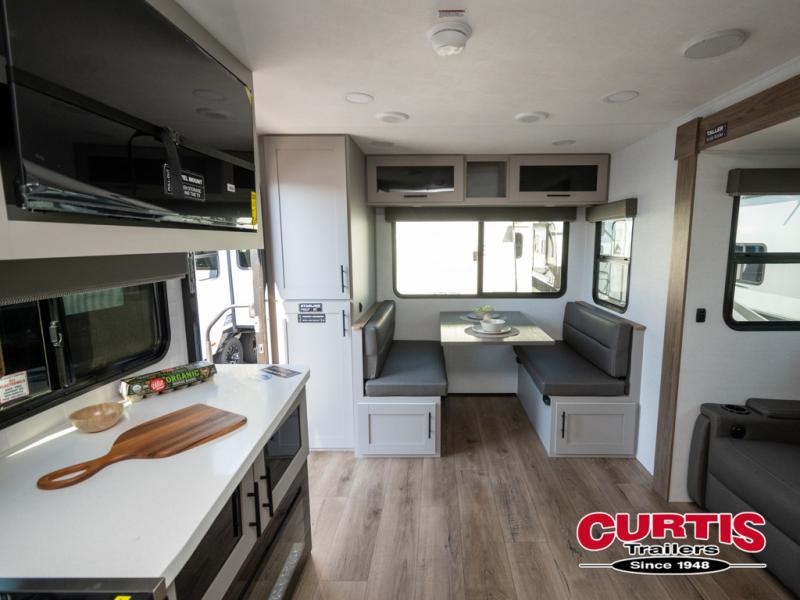 Grab your hiking boots and your sense of adventure for fun camping trips in this single slide out travel trailer. The rear booth dinette includes overhead storage for your things and the sofa slide out is in great view of the 40" HDTV. There is also a fireplace here that will make your space feel more like home plus more storage space, including an entryway pantry and storage above the 10 cu. ft. 12V refrigerator. A walk-through bath will take you to the front master bedroom with a queen bed, wardrobe nightstands, plus its own exterior entry door!