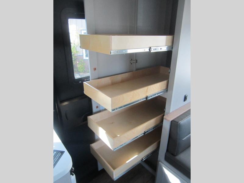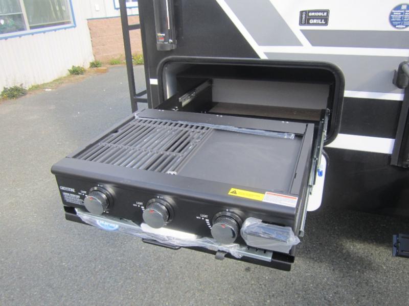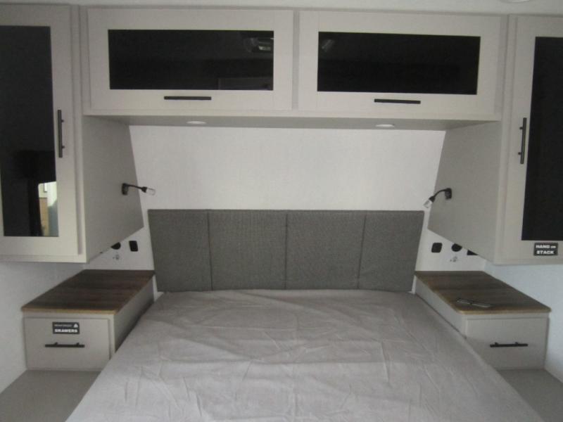 Grab your hiking boots and your sense of adventure for fun camping trips in this single slide out travel trailer. The rear booth dinette includes overhead storage for your things and the sofa slide out is in great view of the 40" HDTV. There is also a fireplace here that will make your space feel more like home plus more storage space, including a pantry with pull out trays and storage above the 10 cu. ft. 12V refrigerator. A walk-through bath will take you to the front master bedroom with a queen bed, wardrobe nightstands, plus its own exterior entry door!