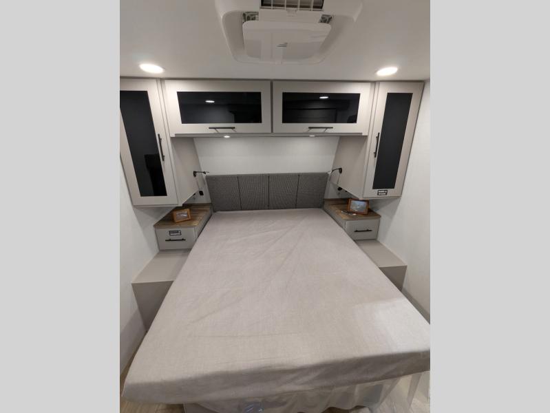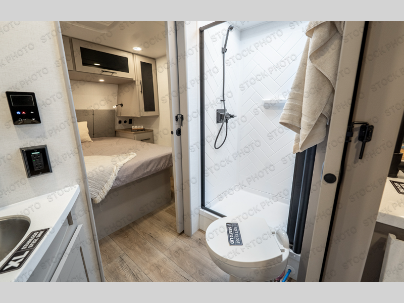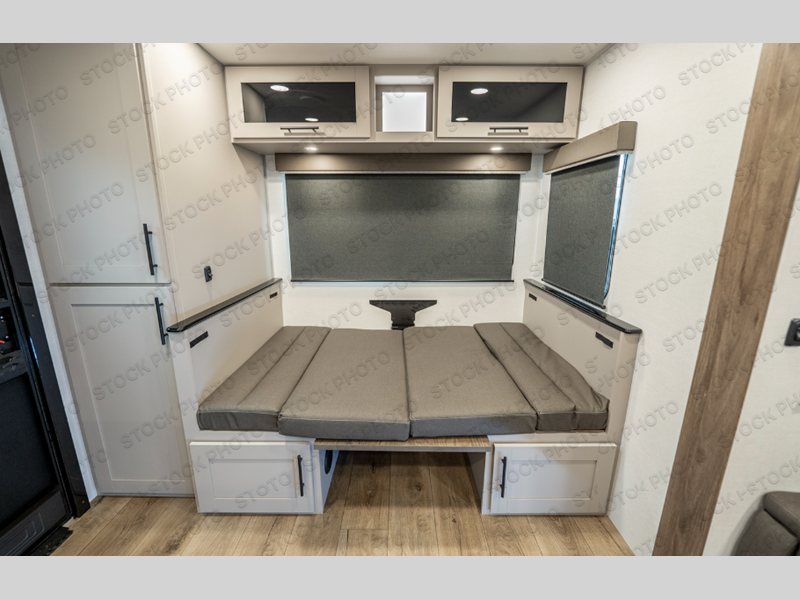 Grab your hiking boots and your sense of adventure for fun camping trips in this single slide out travel trailer. The rear booth dinette includes overhead storage for your things and the sofa slide out is in great view of the 40" HDTV. There is also a fireplace here that will make your space feel more like home plus more storage space, including a pantry with pull out trays and storage above the 10 cu. ft. 12V refrigerator. A walk-through bath will take you to the front master bedroom with a queen bed, wardrobe nightstands, plus its own exterior entry door!