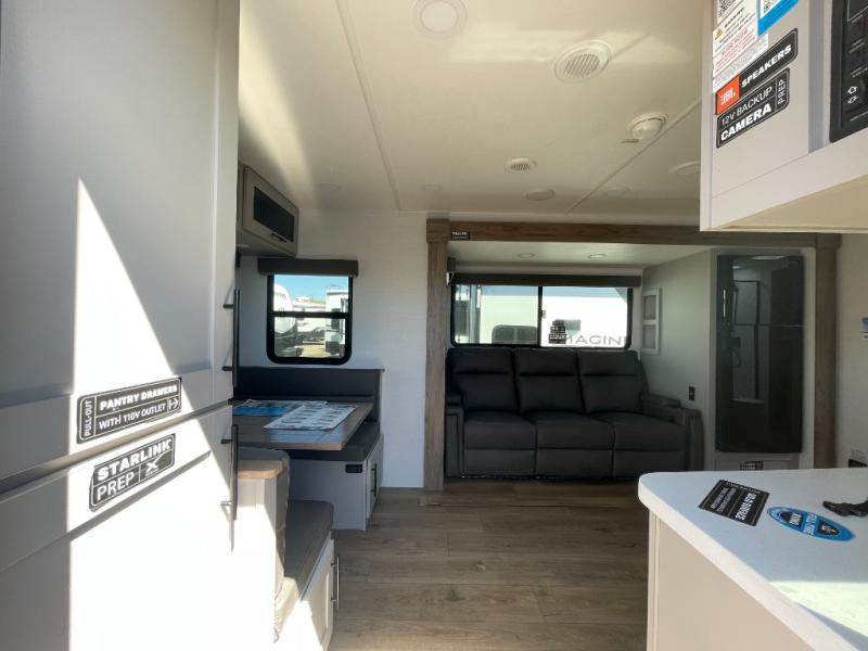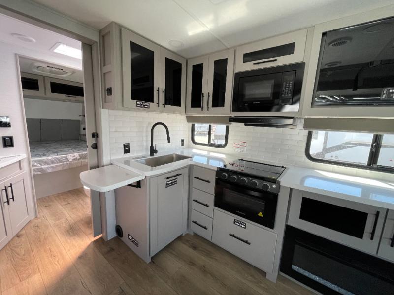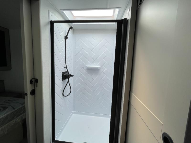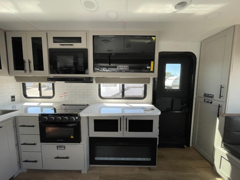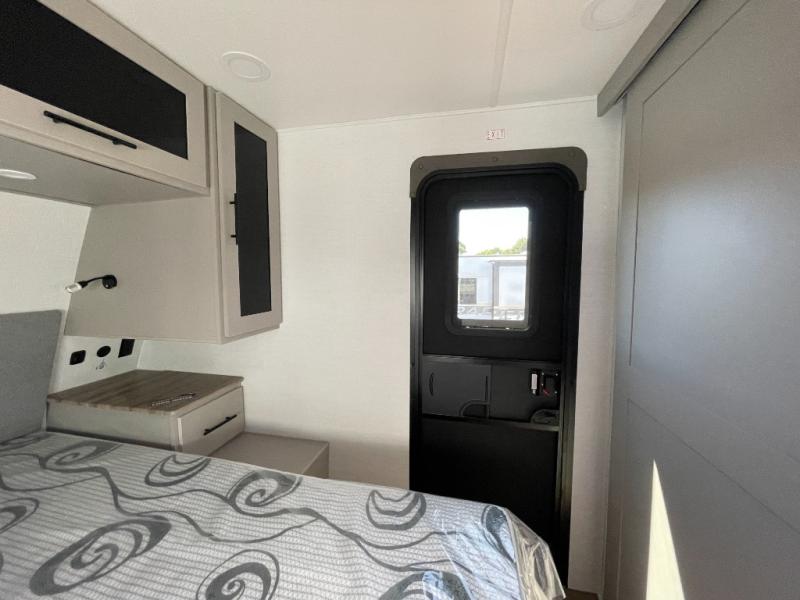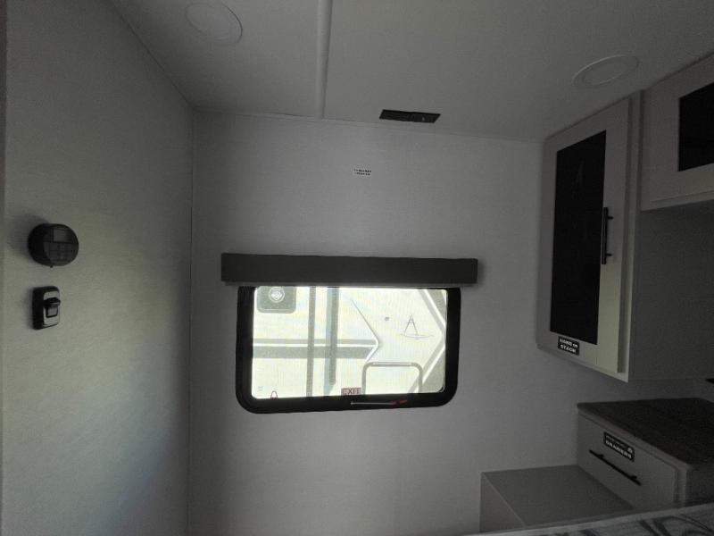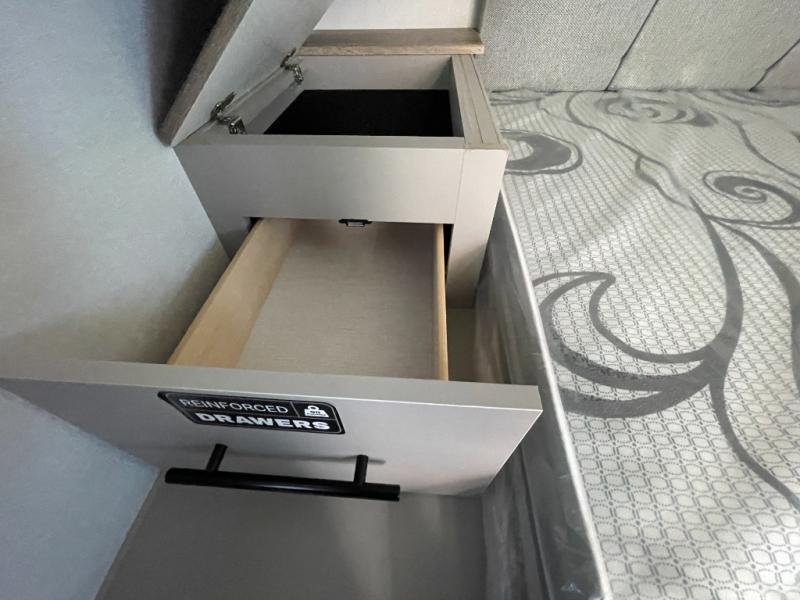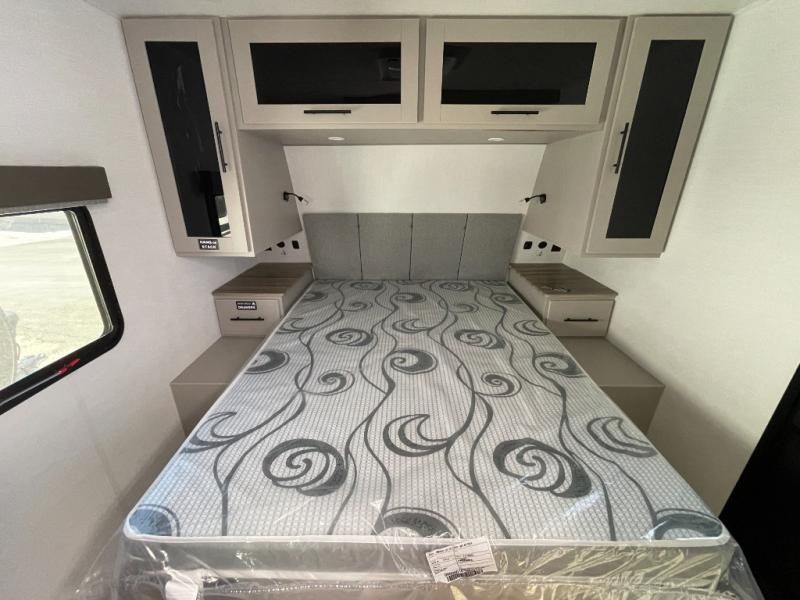 Grab your hiking boots and your sense of adventure for fun camping trips in this single slide out travel trailer. The rear booth dinette includes overhead storage for your things and the sofa slide out is in great view of the 40" HDTV. There is also a fireplace here that will make your space feel more like home plus more storage space, including a pantry with pull out trays and storage above the 10 cu. ft. 12V refrigerator. A walk-through bath will take you to the front master bedroom with a queen bed, wardrobe nightstands, plus its own exterior entry door!