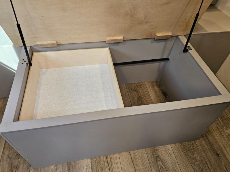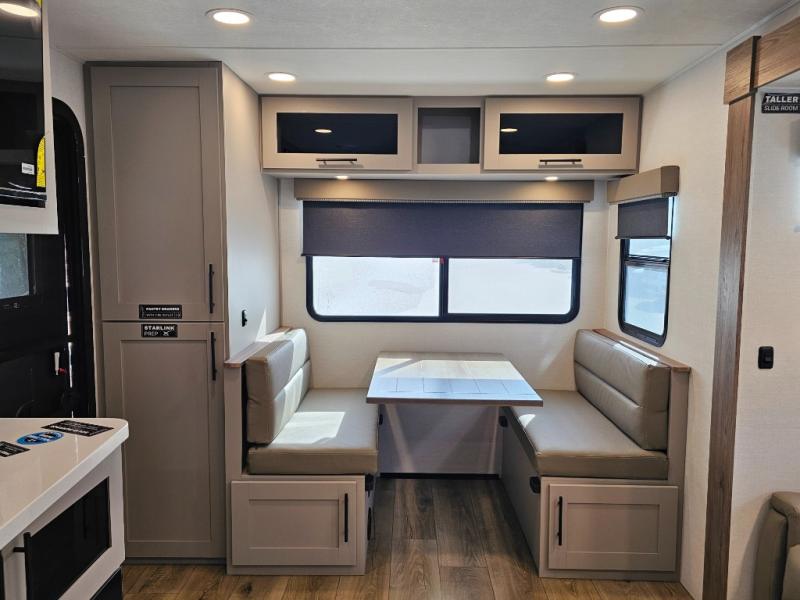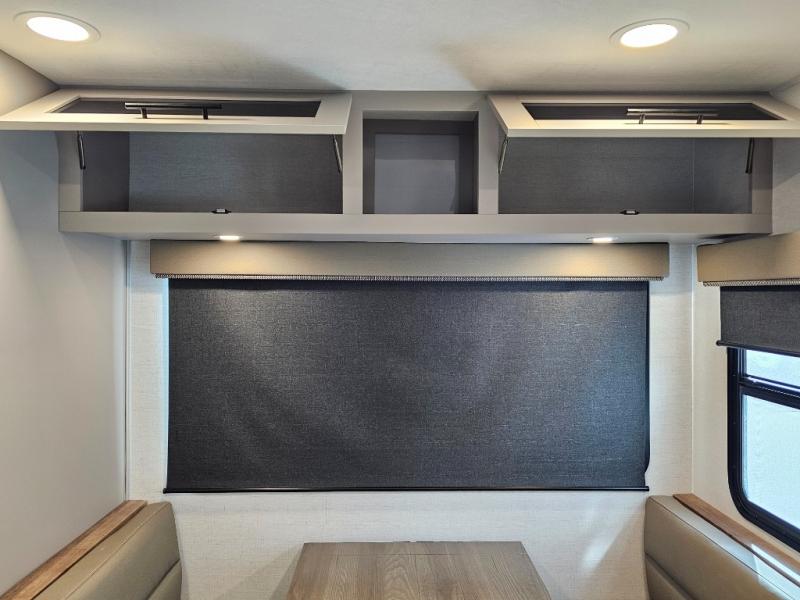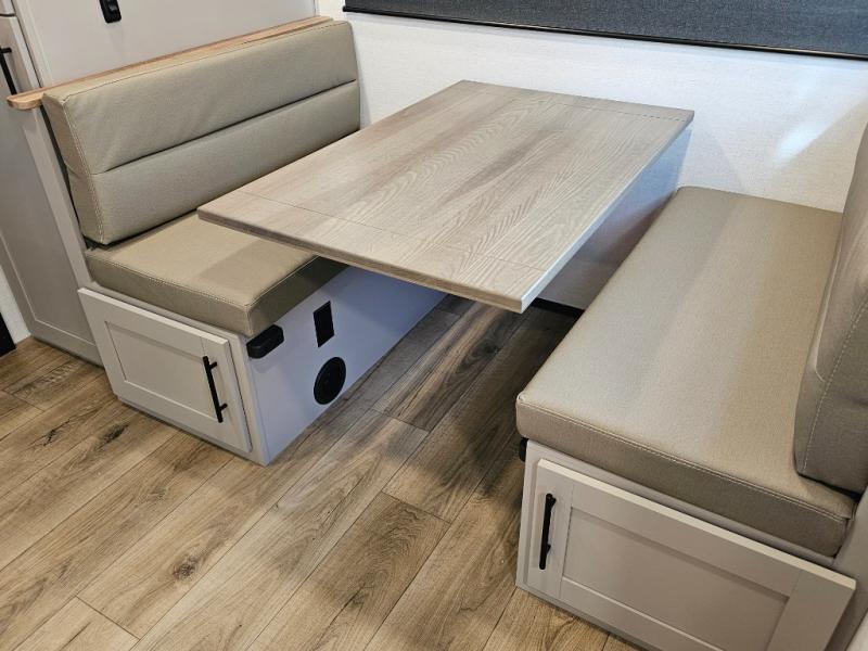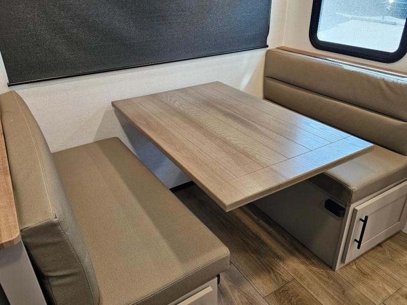 Rear booth dinette with overhead storage – ideal for meals, games, or workspace