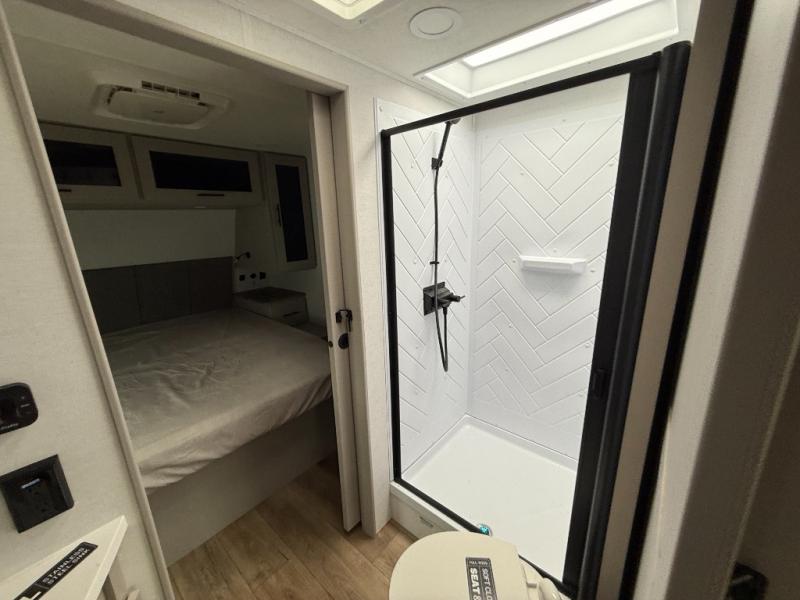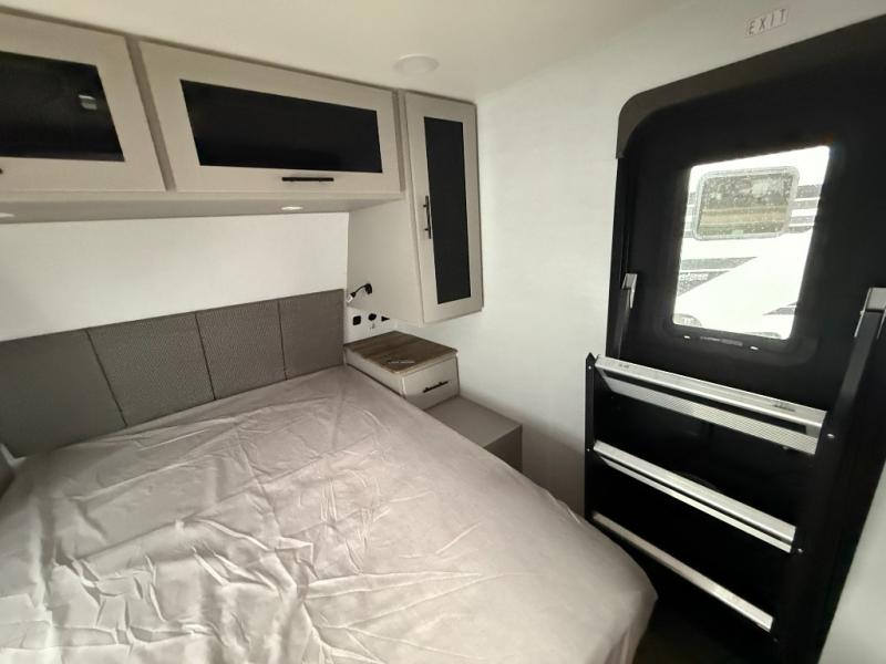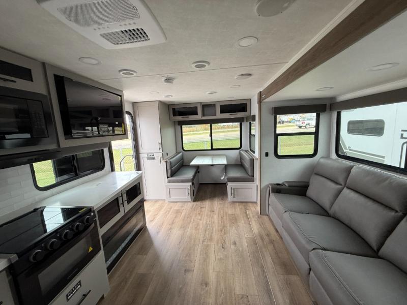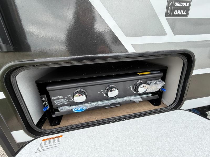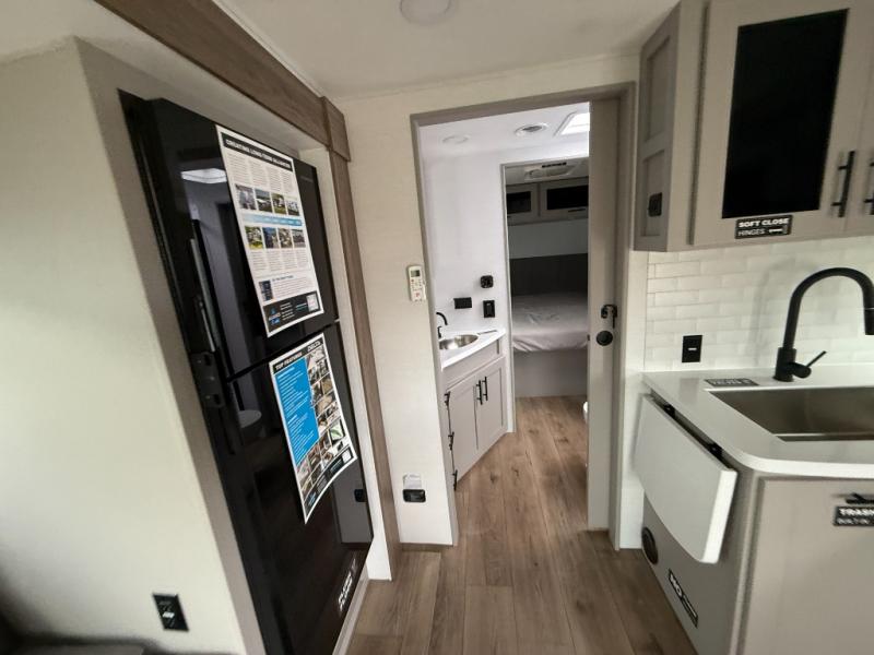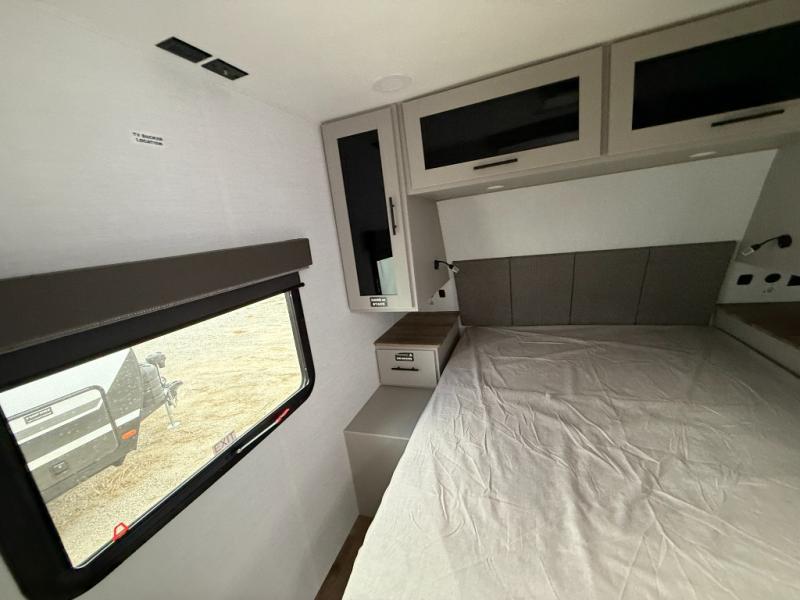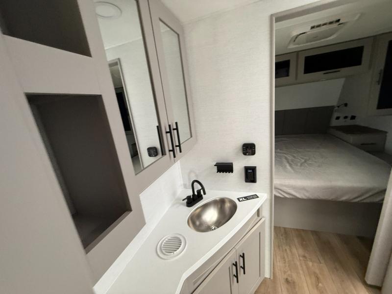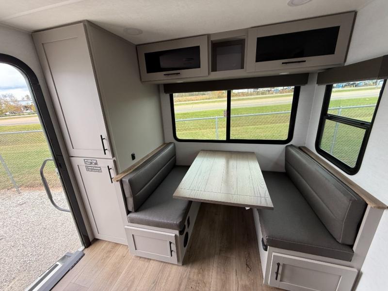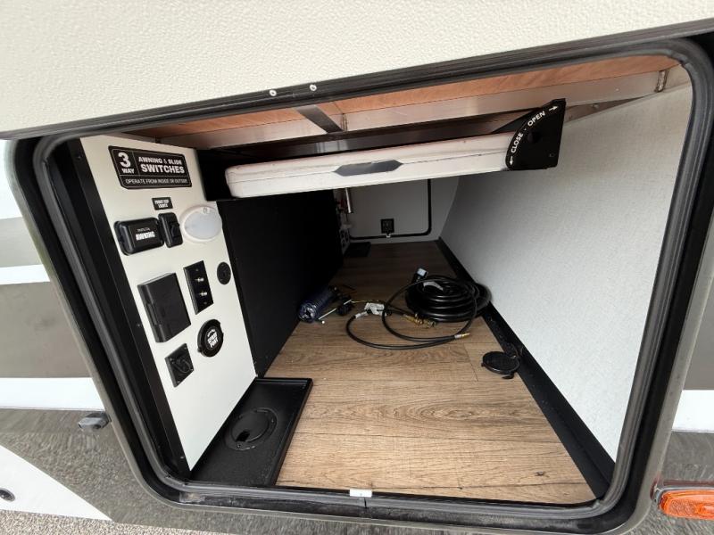 Grab your hiking boots and your sense of adventure for fun camping trips in this single slide out travel trailer. The rear booth dinette includes overhead storage for your things and the sofa slide out is in great view of the 40" HDTV. There is also a fireplace here that will make your space feel more like home plus more storage space, including a pantry with pull out trays and storage above the 10 cu. ft. 12V refrigerator. A walk-through bath will take you to the front master bedroom with a queen bed, wardrobe nightstands, plus its own exterior entry door!