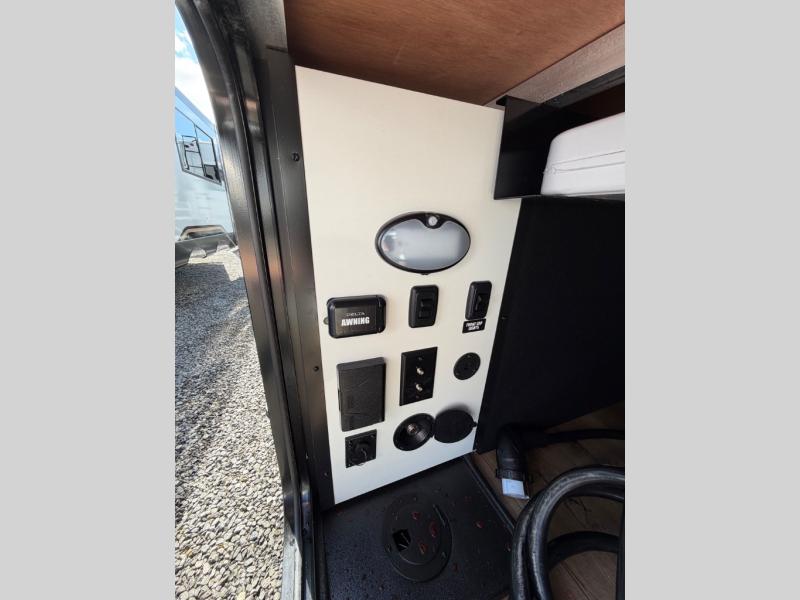 Grab your hiking boots and your sense of adventure for fun camping trips in this single slide out travel trailer. The rear booth dinette includes overhead storage for your things and the sofa slide out is in great view of the 40" HDTV. There is also a fireplace here that will make your space feel more like home plus more storage space, including a pantry with pull out trays and storage above the 10 cu. ft. 12V refrigerator. A walk-through bath will take you to the front master bedroom with a queen bed, wardrobe nightstands, plus its own exterior entry door!
