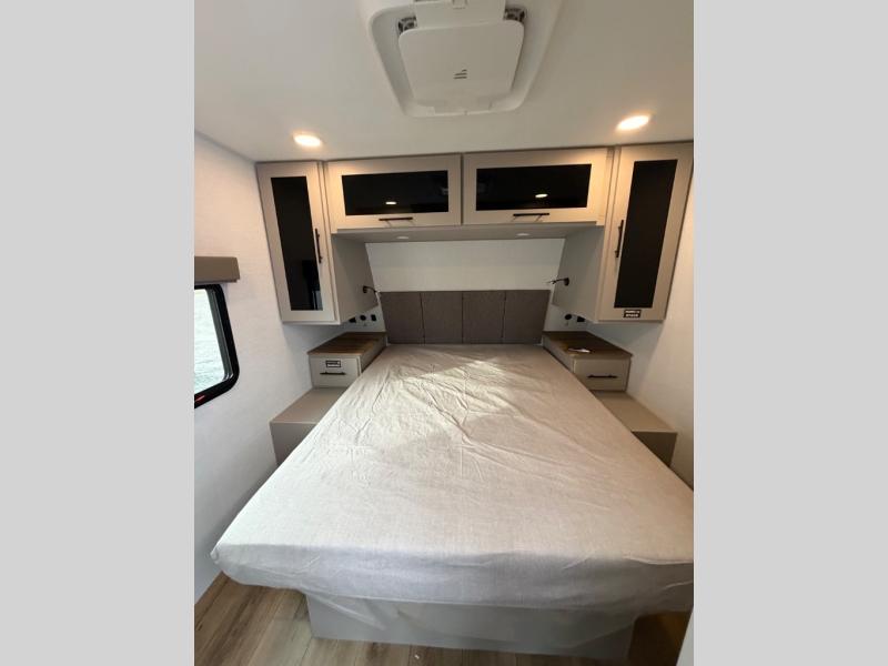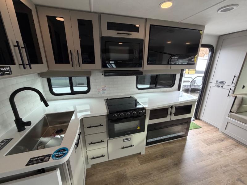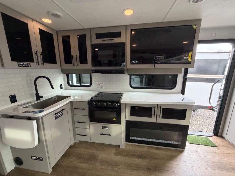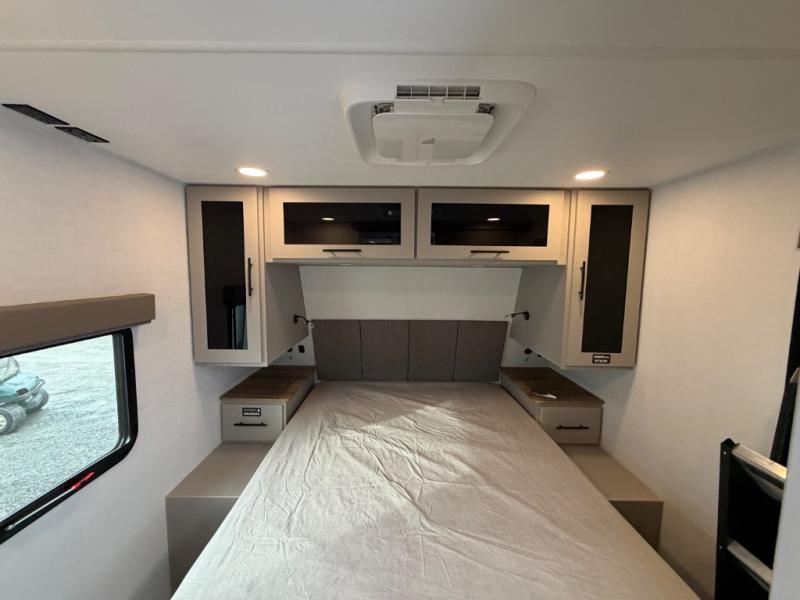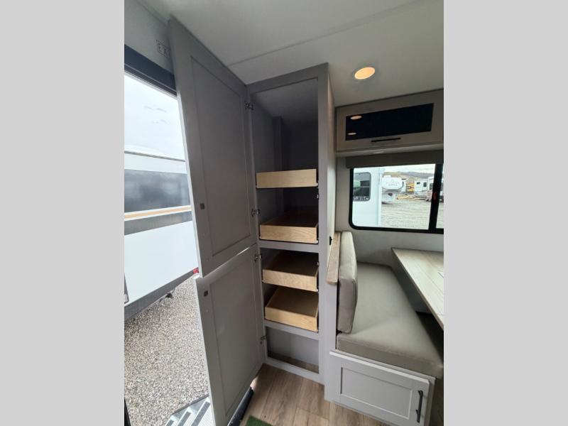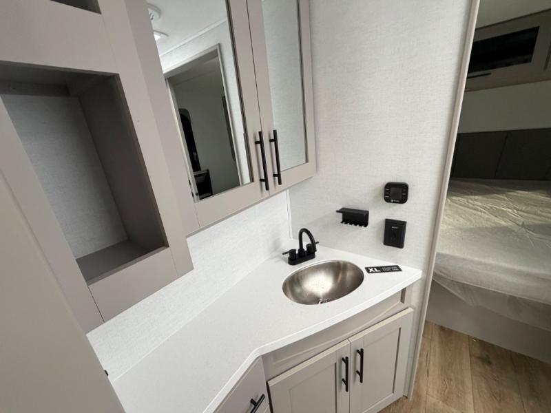 Grab your hiking boots and your sense of adventure for fun camping trips in this single slide out travel trailer. The rear booth dinette includes overhead storage for your things and the sofa slide out is in great view of the 40" HDTV. There is also a fireplace here that will make your space feel more like home plus more storage space, including a pantry with pull out trays and storage above the 10 cu. ft. 12V refrigerator. A walk-through bath will take you to the front master bedroom with a queen bed, wardrobe nightstands, plus its own exterior entry door!
