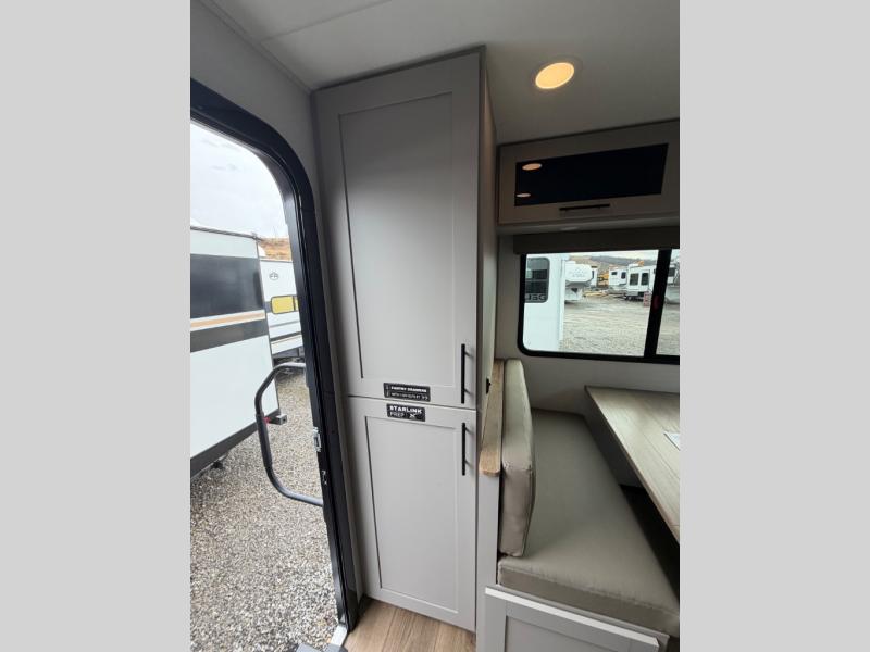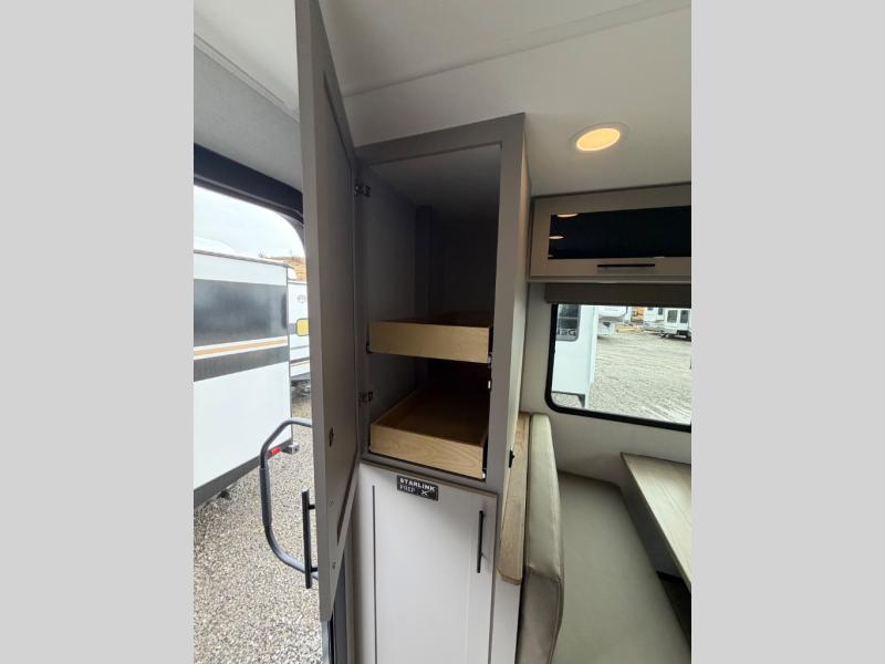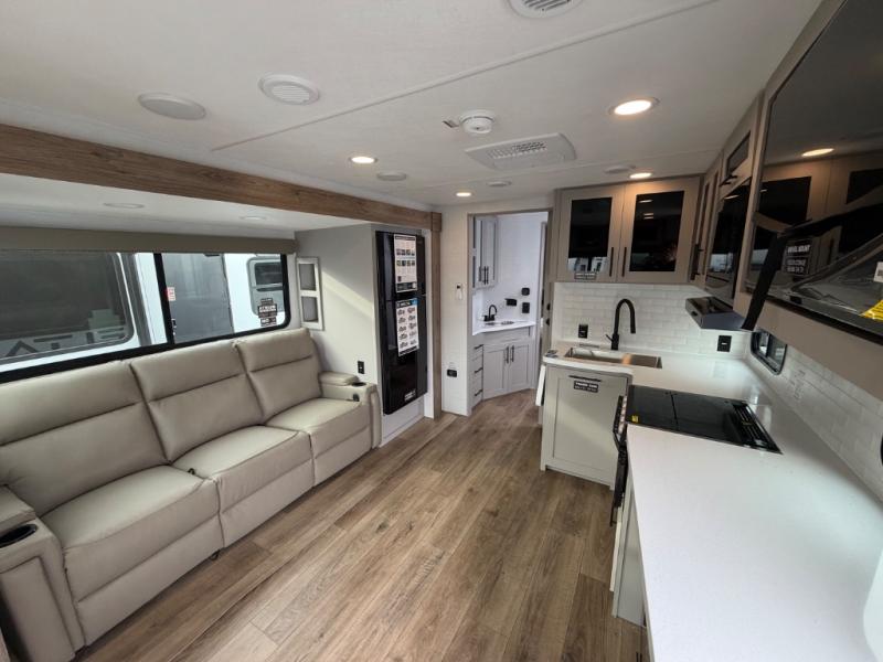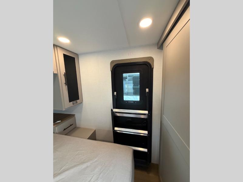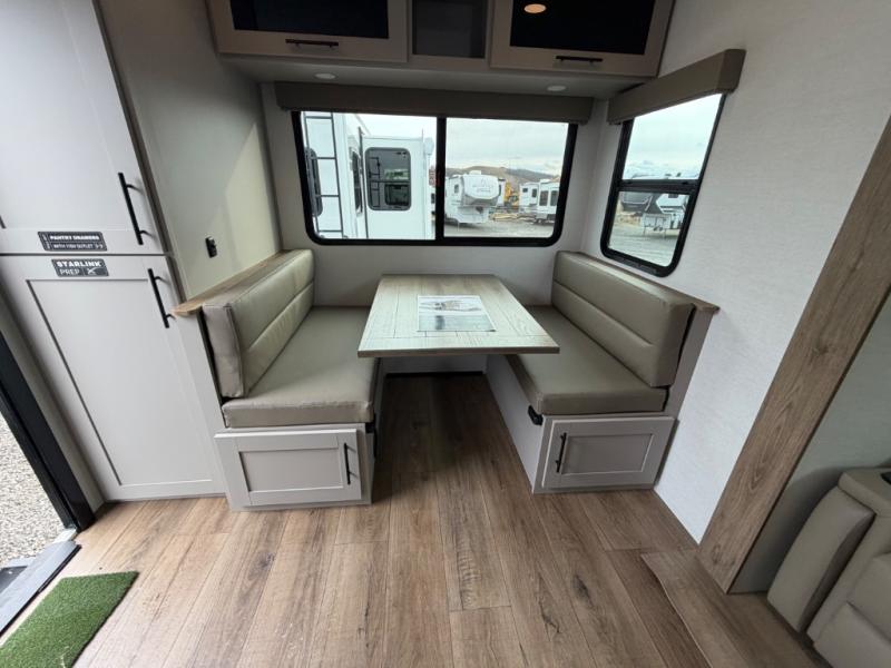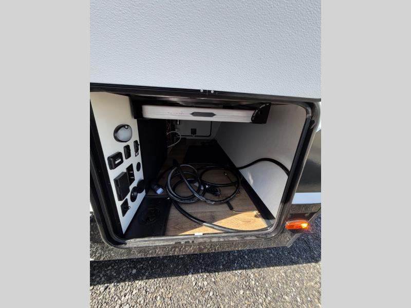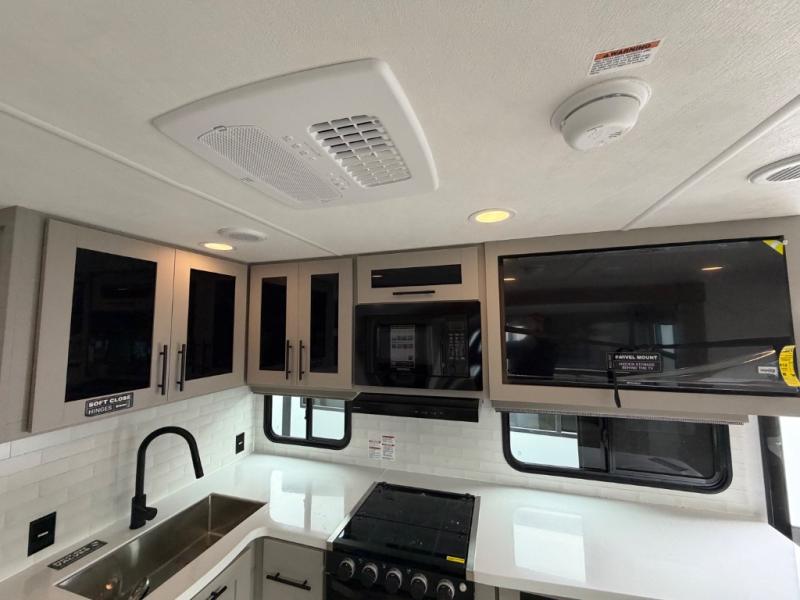 Grab your hiking boots and your sense of adventure for fun camping trips in this single slide out travel trailer. The rear booth dinette includes overhead storage for your things and the sofa slide out is in great view of the 40" HDTV. There is also a fireplace here that will make your space feel more like home plus more storage space, including a pantry with pull out trays and storage above the 10 cu. ft. 12V refrigerator. A walk-through bath will take you to the front master bedroom with a queen bed, wardrobe nightstands, plus its own exterior entry door!