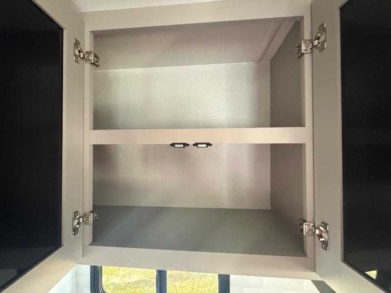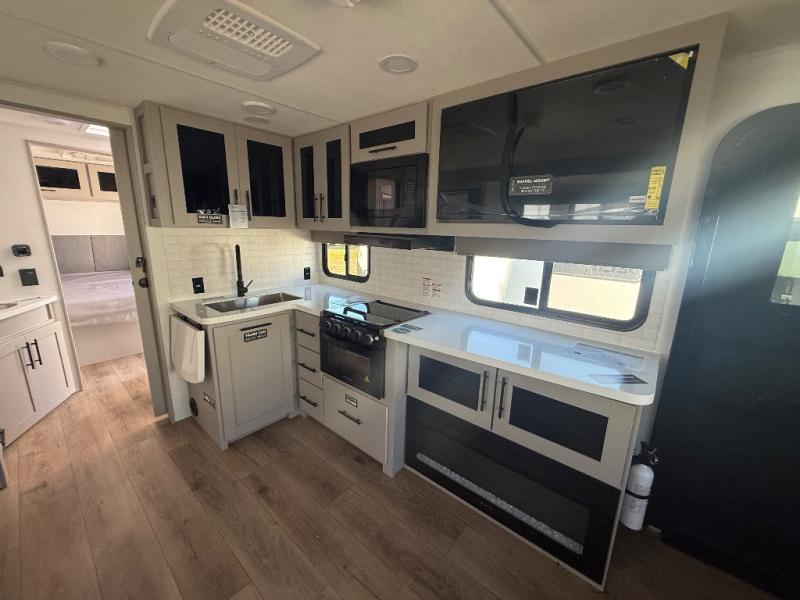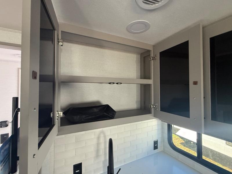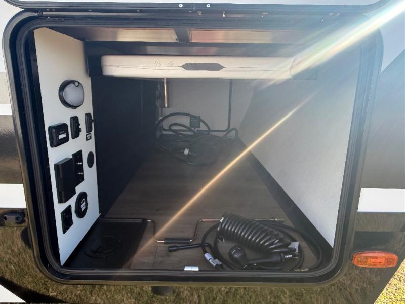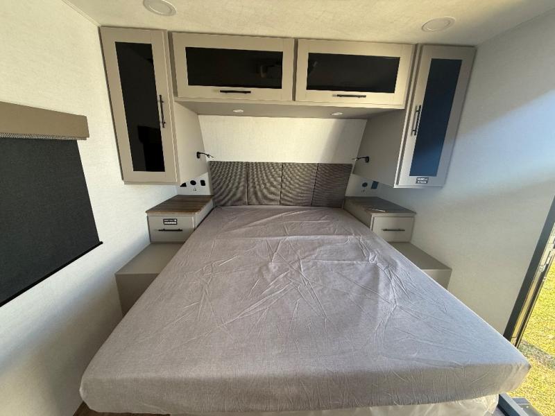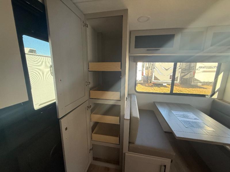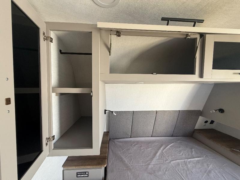Grab your hiking boots and your sense of adventure for fun camping trips in this single slide out travel trailer. The rear booth dinette includes overhead storage for your things and the sofa slide out is in great view of the 40" HDTV. There is also a fireplace here that will make your space feel more like home plus more storage space, including a pantry with pull out trays and storage above the 10 cu. ft. 12V refrigerator. A walk-through bath will take you to the front master bedroom with a queen bed, wardrobe nightstands, plus its own exterior entry door!